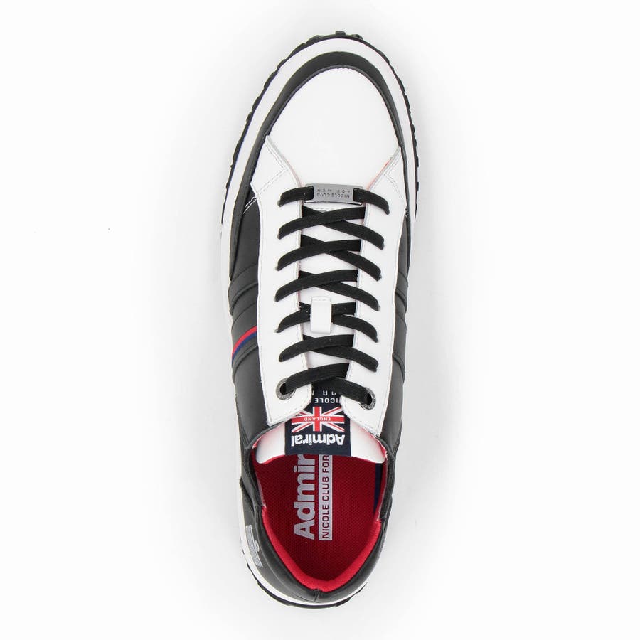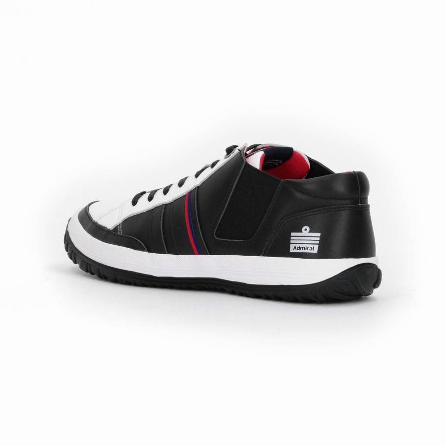 アドミラルの別注スニーカー第5弾。第2弾のサイドゴアデザインのミッドカットタイプをベースにリアルレザーで作った完全別注になります。シューレースにはロウ引きをした光沢感のある平紐、かかとの外側にはアドミラル、内側にはブランドロゴをシルバーで印字、インソールには通気性が高く、ヒール部分にジェルを入れたクッション性の高い物を採用しています。履き口のクッションを厚くし、ポリエステルメッシュのライニング仕様にする事で足入れとフィット感を良くしています。少しトゥスプリングの効いたシャープなラスト(木型)はスラックスなどの綺麗めパンツにも合わせやすいです。コラボオリジナルのネームと金属ハトメ、今季はオリジナルデュブレを採用しています。
