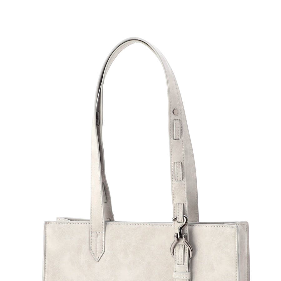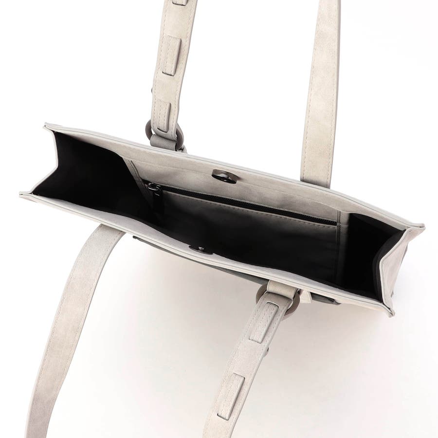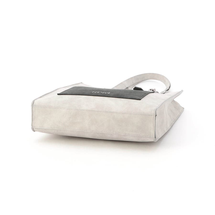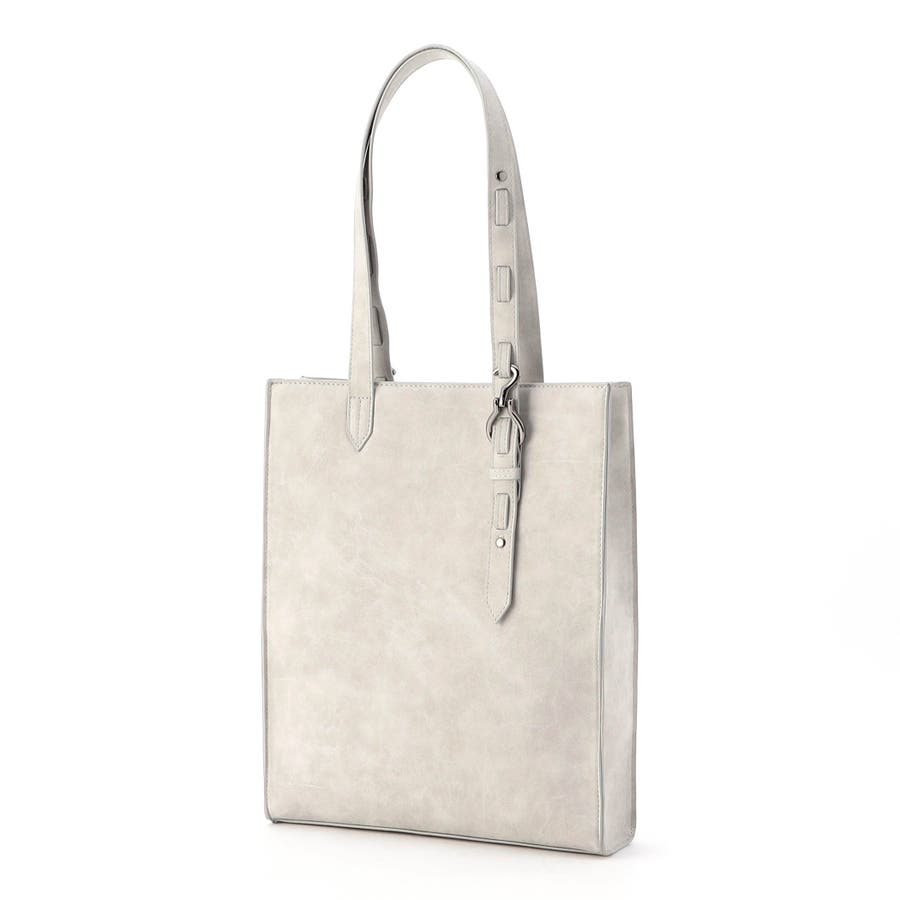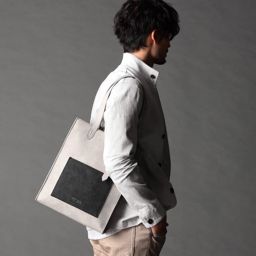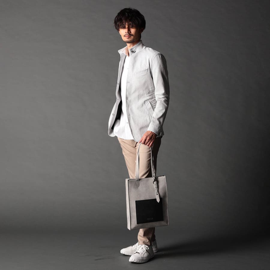 モードな雰囲気を演出する縦型トートバッグ。マグネット口のフロントポケットは素材を大胆に切り替え、見た目にインパクトを持たせました。ハンドル部分はフックバックルを取り付けたベルト仕様にすることで、長さの調節機能と高級感のあるデザイン性を両立。箔押しのブランドロゴがアクセントになっています。