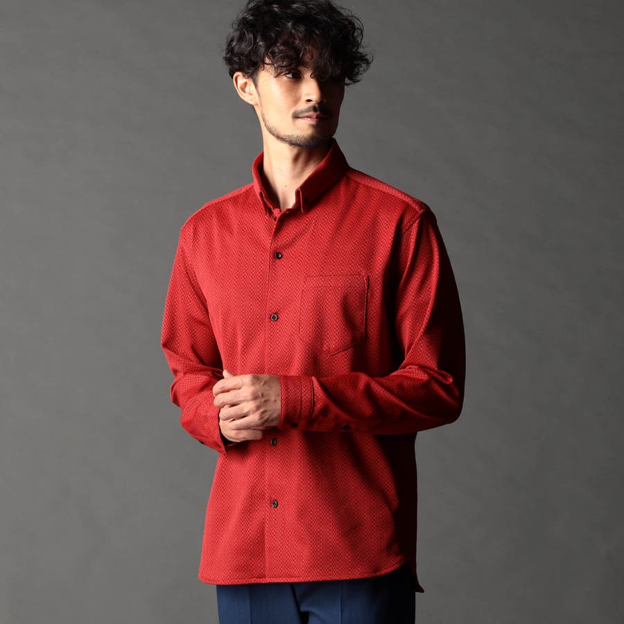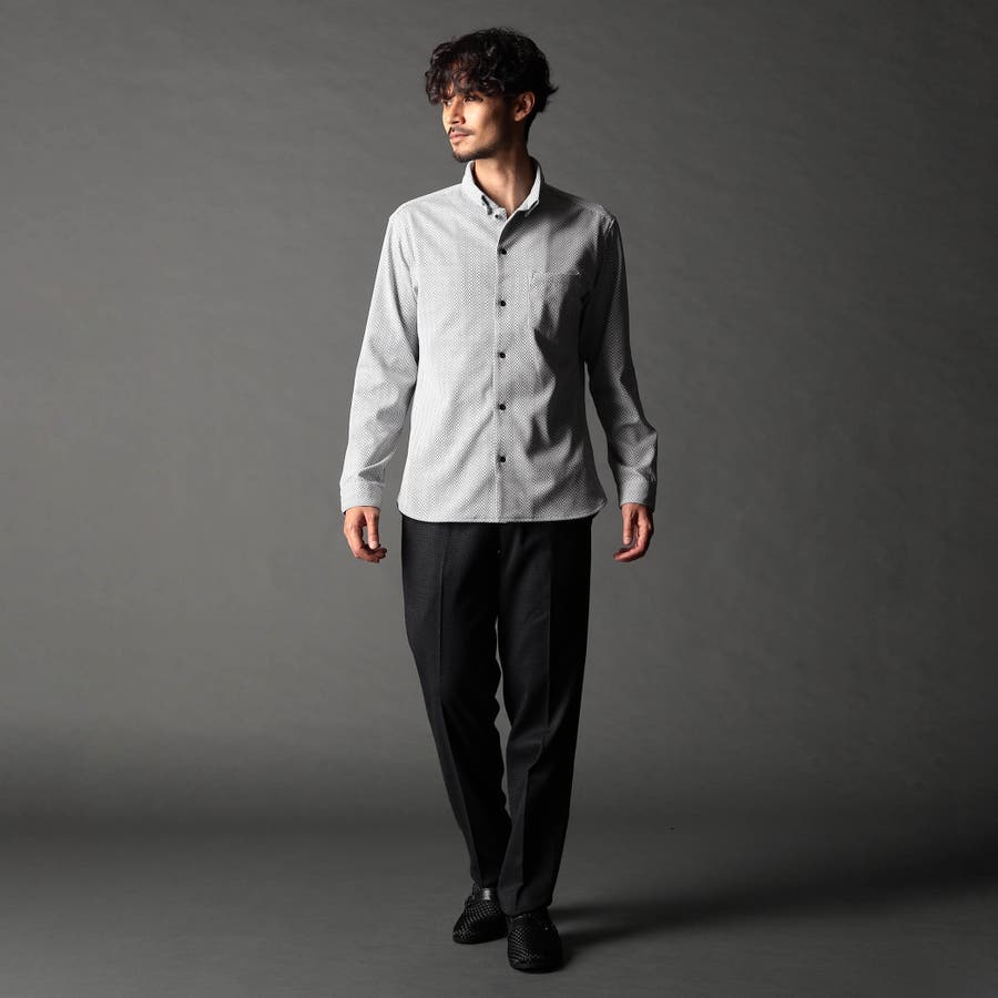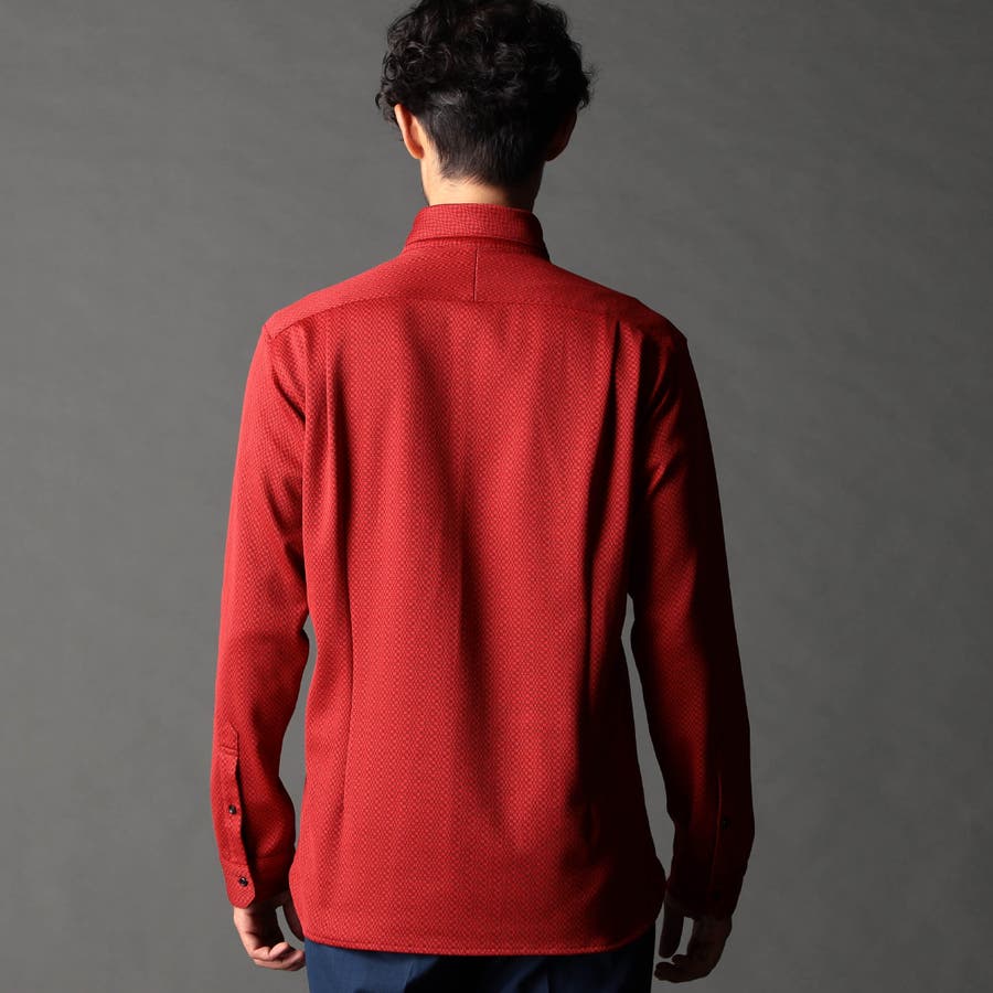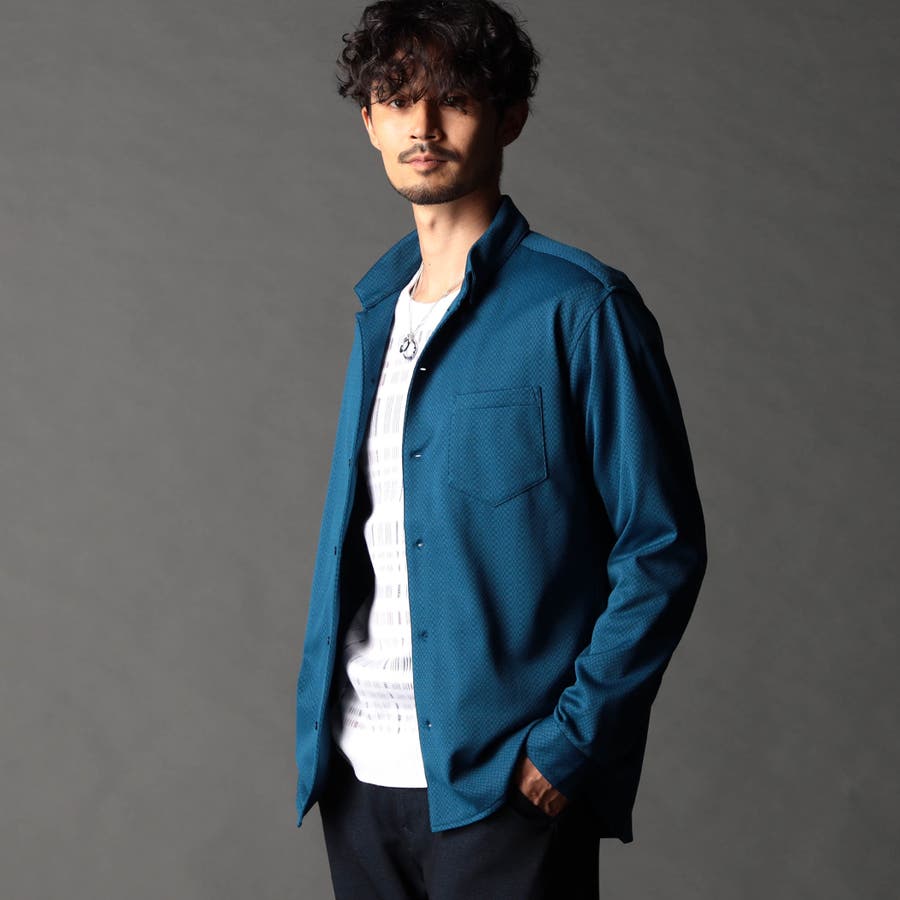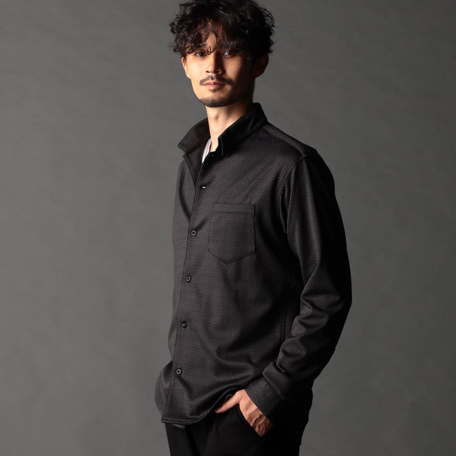 NEWデザイン、スタンドボタンダウンカラ-の長袖シャツ。スタンドカラーをそのまま折り返して釦止めした新しい衿デザインです。ヨーク裏、カフス裏など無地配色の素材を使いアクセントにしています。生地のジャカード配色とリンクした釦も、ちょっとしたアクセント。ジオメトリック調のレトロ感のあるストレッチ素材は布帛系シャツとは一線を画します。インパクトのある大胆なジャカード柄ですが、程良く効いたストレッチ性とサラッとしたタッチはとても着やすく、オリジナリティの高いシャツです。