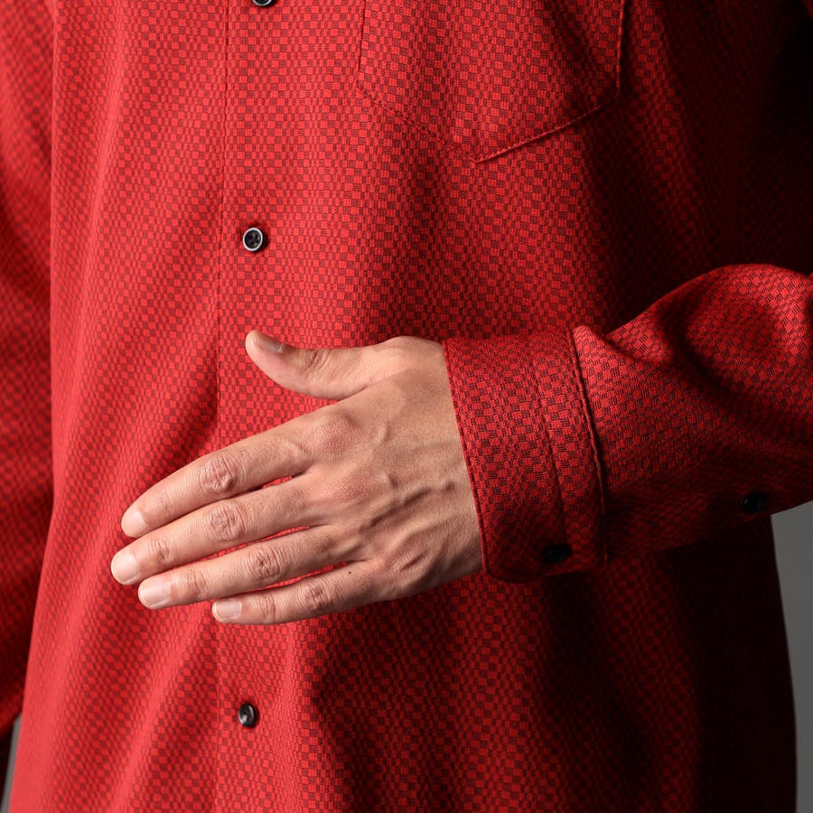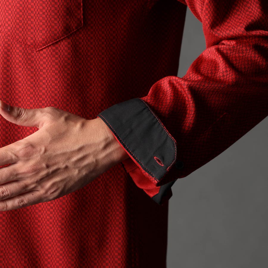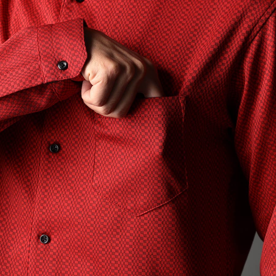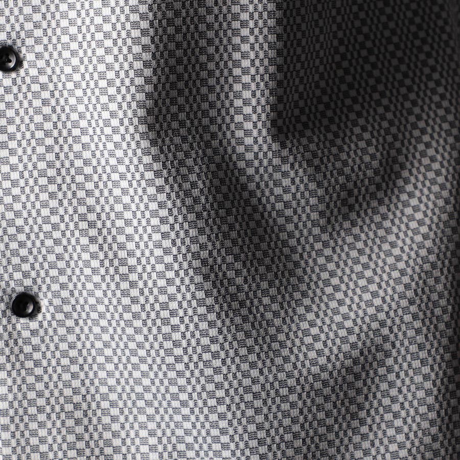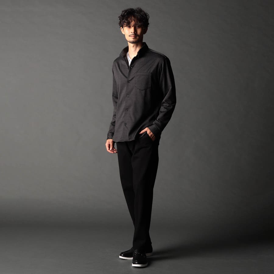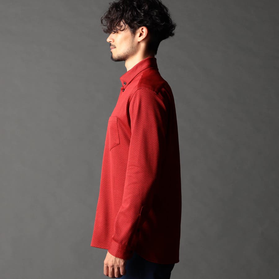 NEWデザイン、スタンドボタンダウンカラ-の長袖シャツ。スタンドカラーをそのまま折り返して釦止めした新しい衿デザインです。ヨーク裏、カフス裏など無地配色の素材を使いアクセントにしています。生地のジャカード配色とリンクした釦も、ちょっとしたアクセント。ジオメトリック調のレトロ感のあるストレッチ素材は布帛系シャツとは一線を画します。インパクトのある大胆なジャカード柄ですが、程良く効いたストレッチ性とサラッとしたタッチはとても着やすく、オリジナリティの高いシャツです。