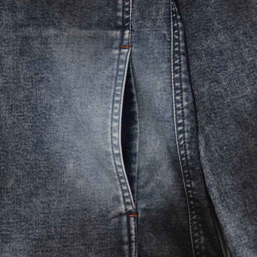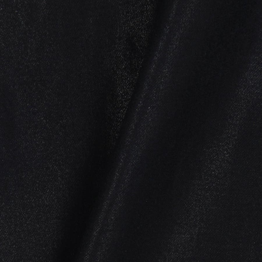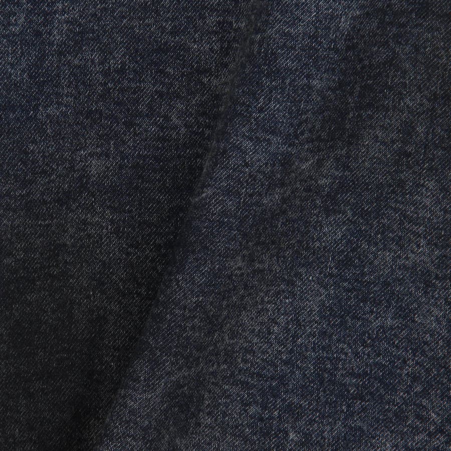 9オンス位のハイストレッチ素材。49ブラックは硫化染めのカットソーライクなストレッチブラックデニム、60ブルーと67ネイビーは濃色のインディゴ染めのカットソーライクなストレッチデニムを採用。裏面を見た時に編みのカットソーっぽいのですが、織物になります。テンションのあるストレッチ性がありながら、しっかりした硬さと張り感のある風合いで加工栄えするが特徴です。