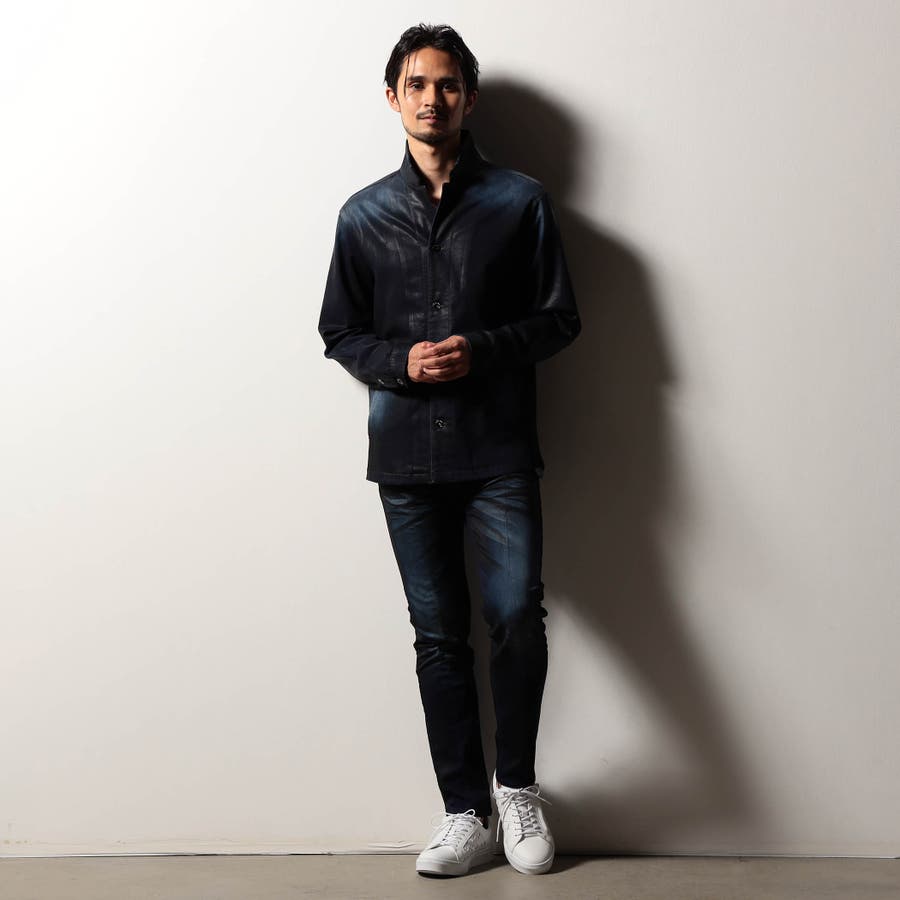 最終の製品加工を岡山のデニム専門の加工所(Wellsウェルズ)に依頼。中国で先に古着風のユーズド加工を施したベース製品を作り、全体のサイズ感を縮率調整してから国内にて最終加工を施しています。顔料を混ぜた樹脂コーティング剤を部分的吹き付け、所々プレス機でしっかり抑える事で縫い代の厚みがある部分や平たい部分に光沢を出して革の様な深い色味、質感に仕上げます。