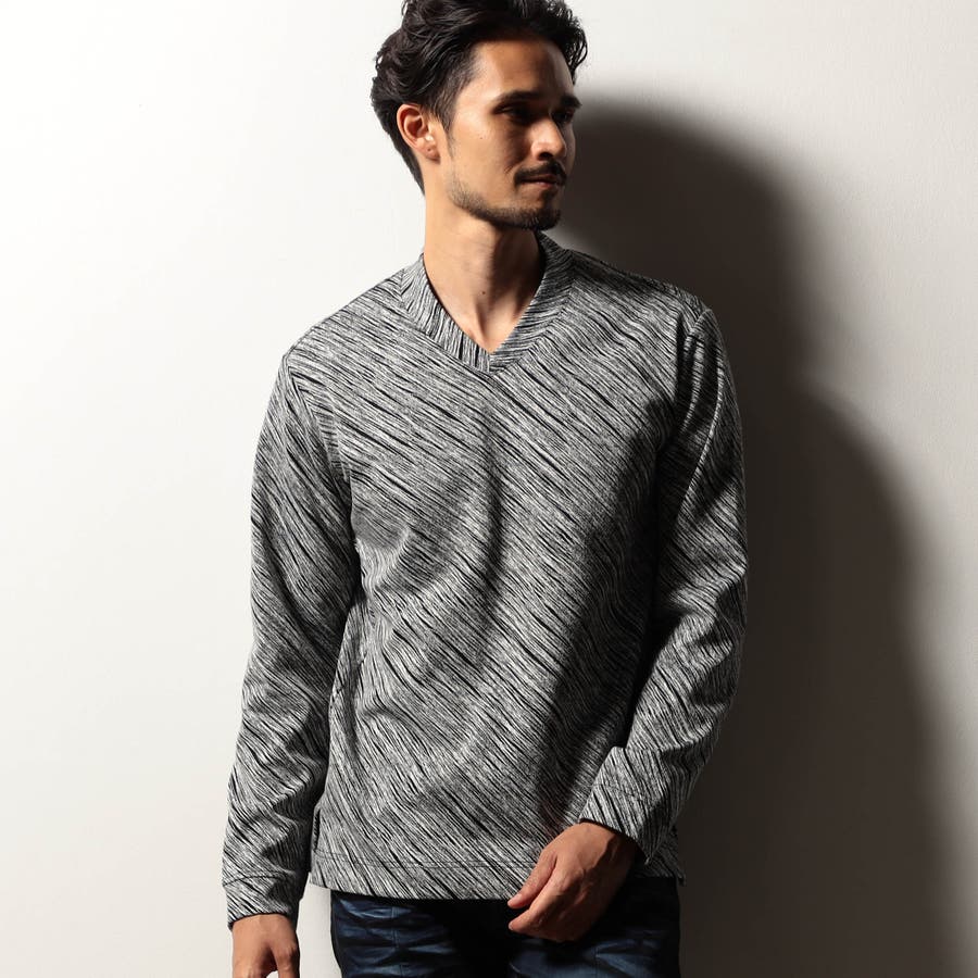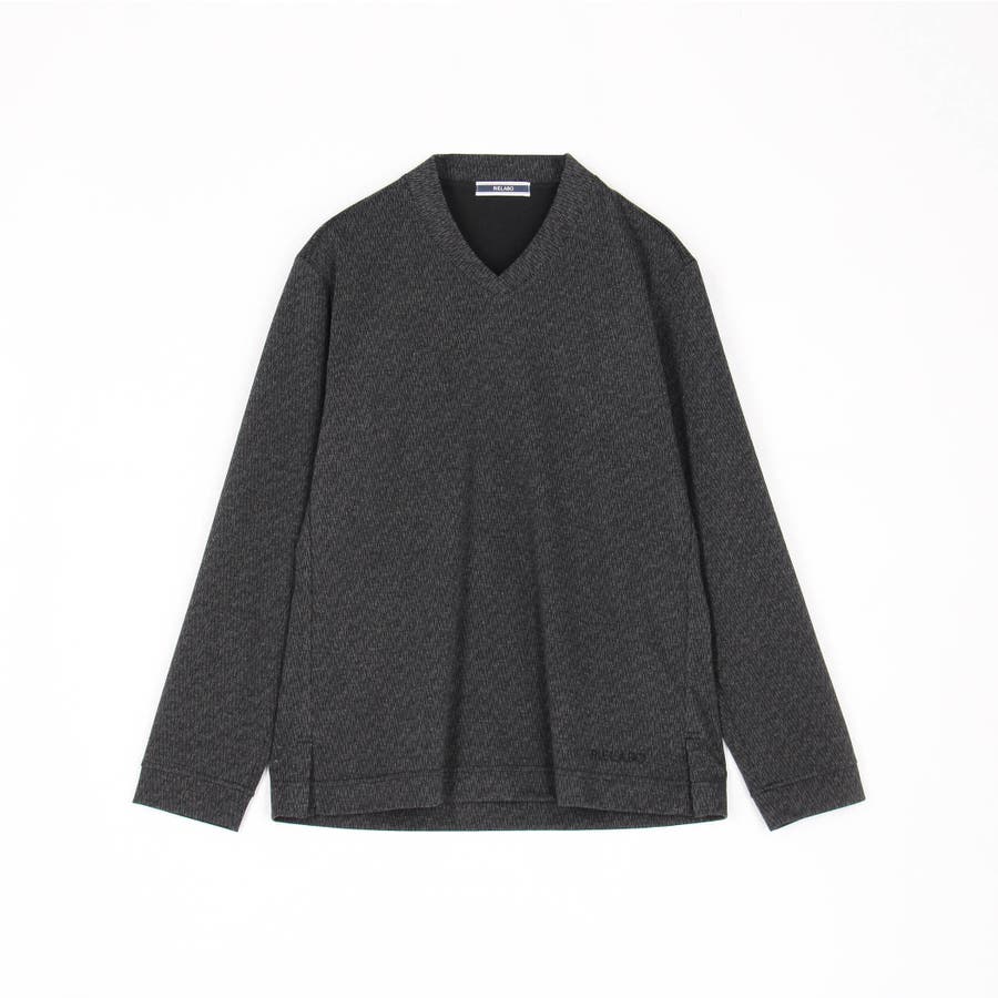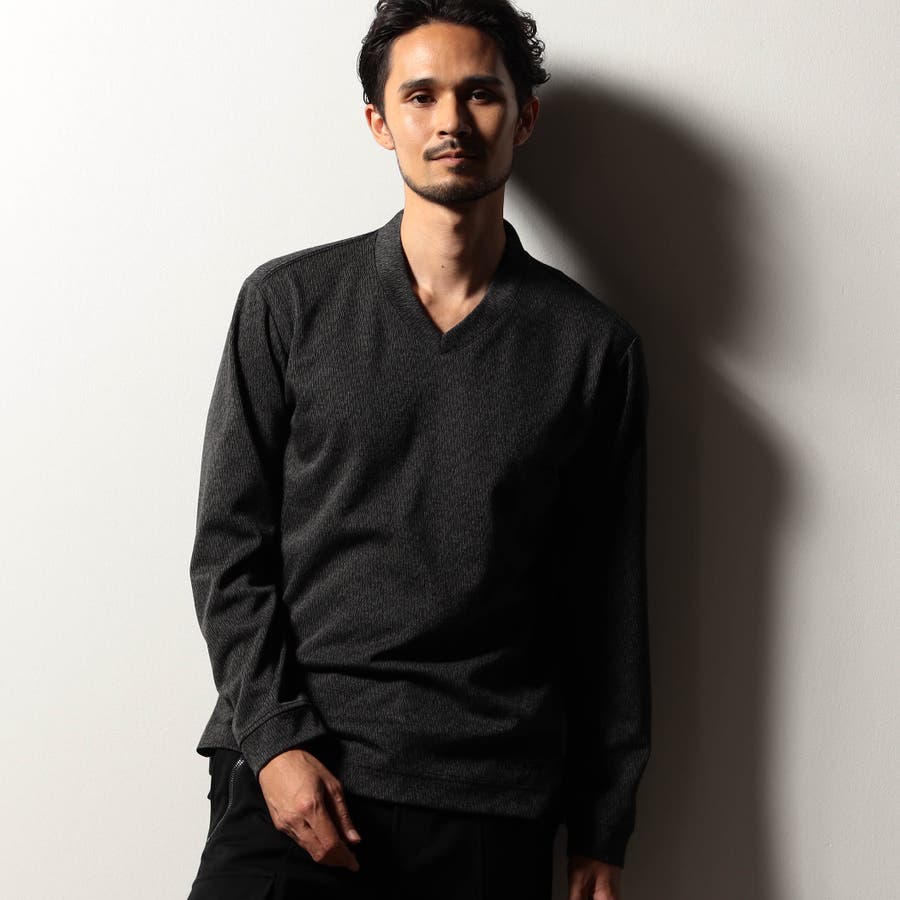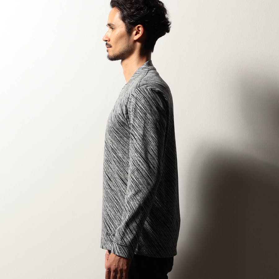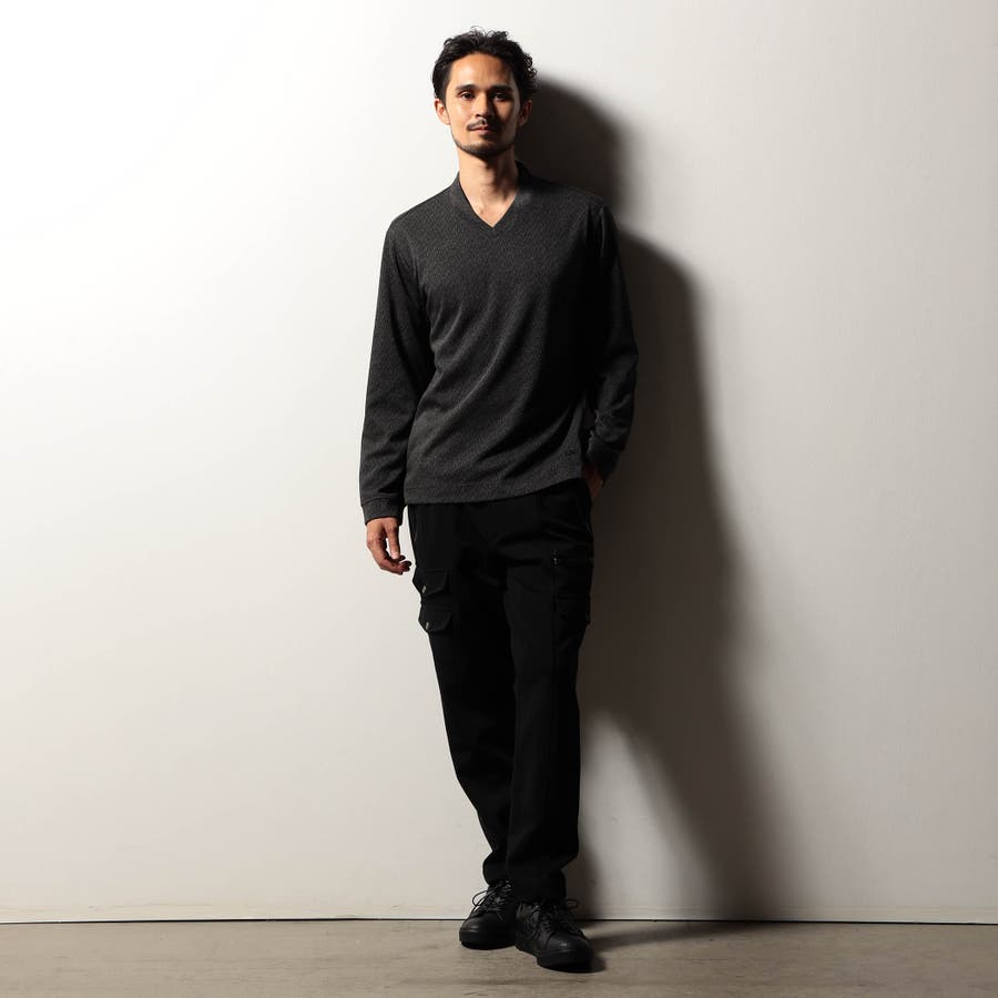 配色の異なる地柄ジャカード素材を使用したVネックカットソー。後衿を高めに設定したドレスカラー仕様でスタイリッシュな印象を演出しつつ、ジャケット等アウターへの衿汚れを軽減してくれるインナー使いにもピッタリな一着。肩から後衿にかけては別生地を使用したタコバインダー始末で型崩れを軽減、脇の縫い代には抗菌防臭テープを仕込んで機能性をプラスしています。