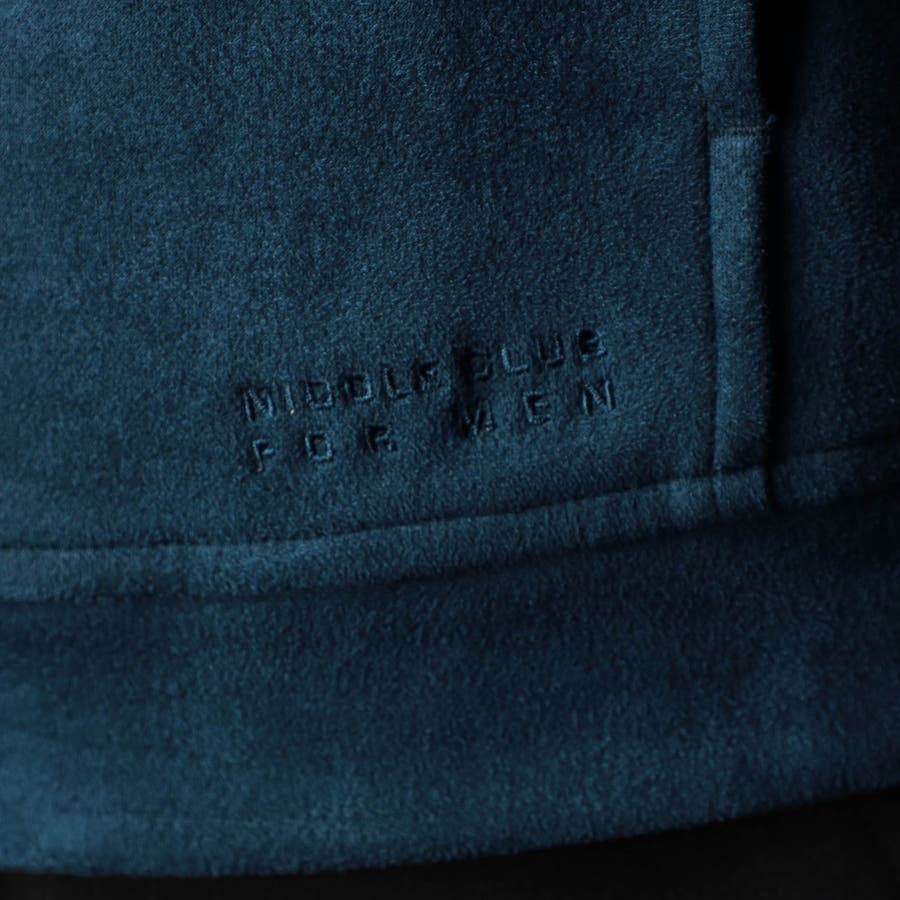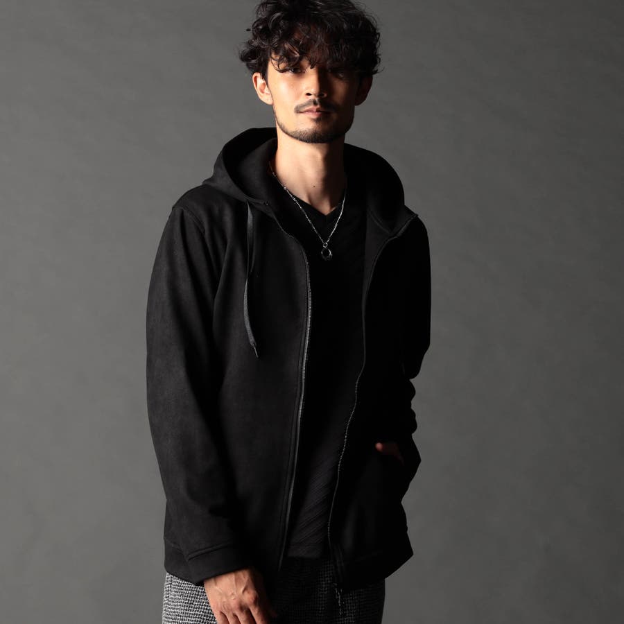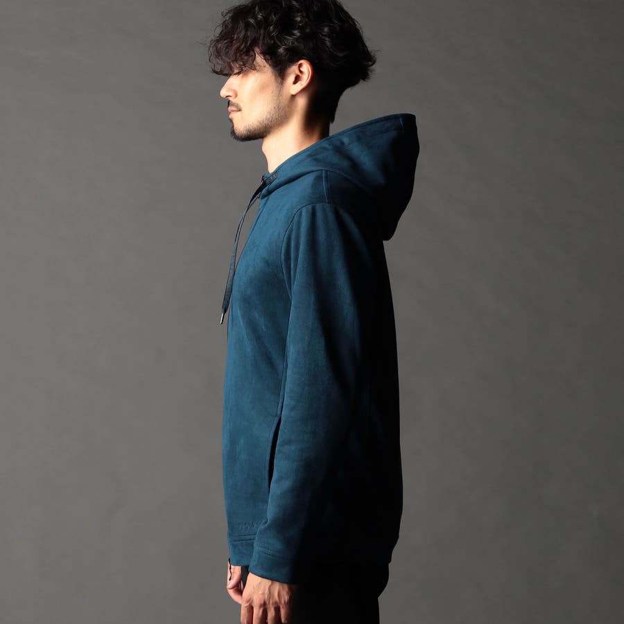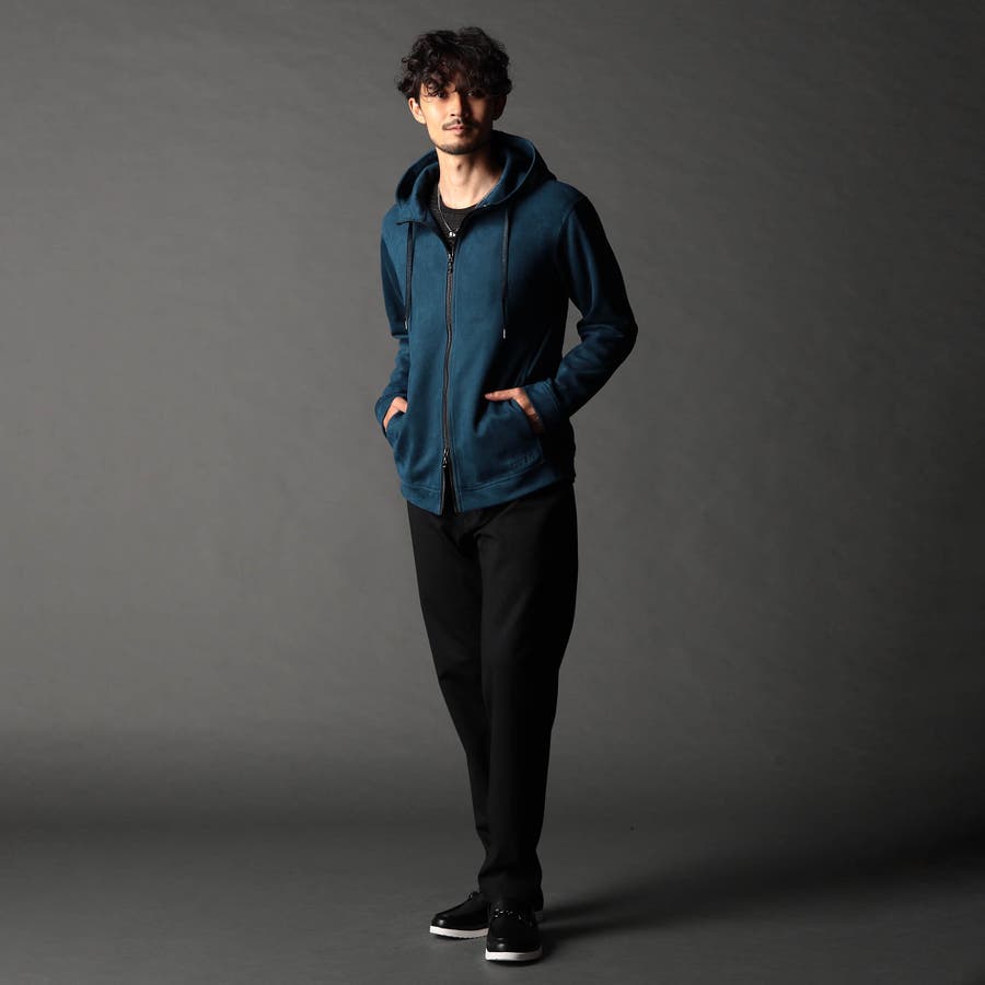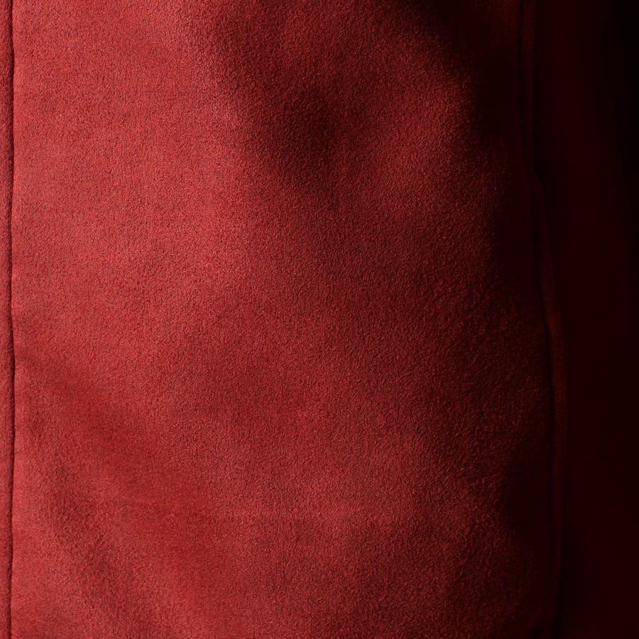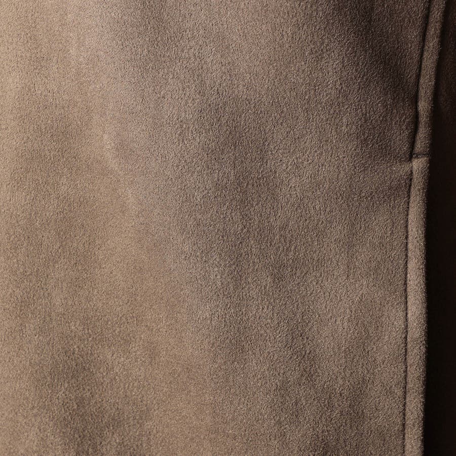 ポリエステルのマイクロファイバーで編まれたポンチ素材の表面をスウェード起毛、滑らかなタッチとソフト風合いを特徴にしたカットソー素材です。目付280g/?程の軽さとストレッチ性、ジャージ素材なのではのプリッとした横張り感もあります。16レンガと49ブラックには、光沢のあるムラプリントを施してレザー調の見え方に作っています。今季新色60ブルーは緑味が混じった濃いピーコックブルーを展開。