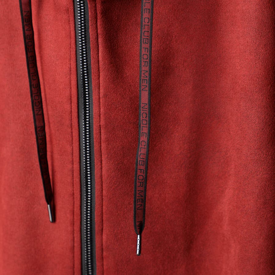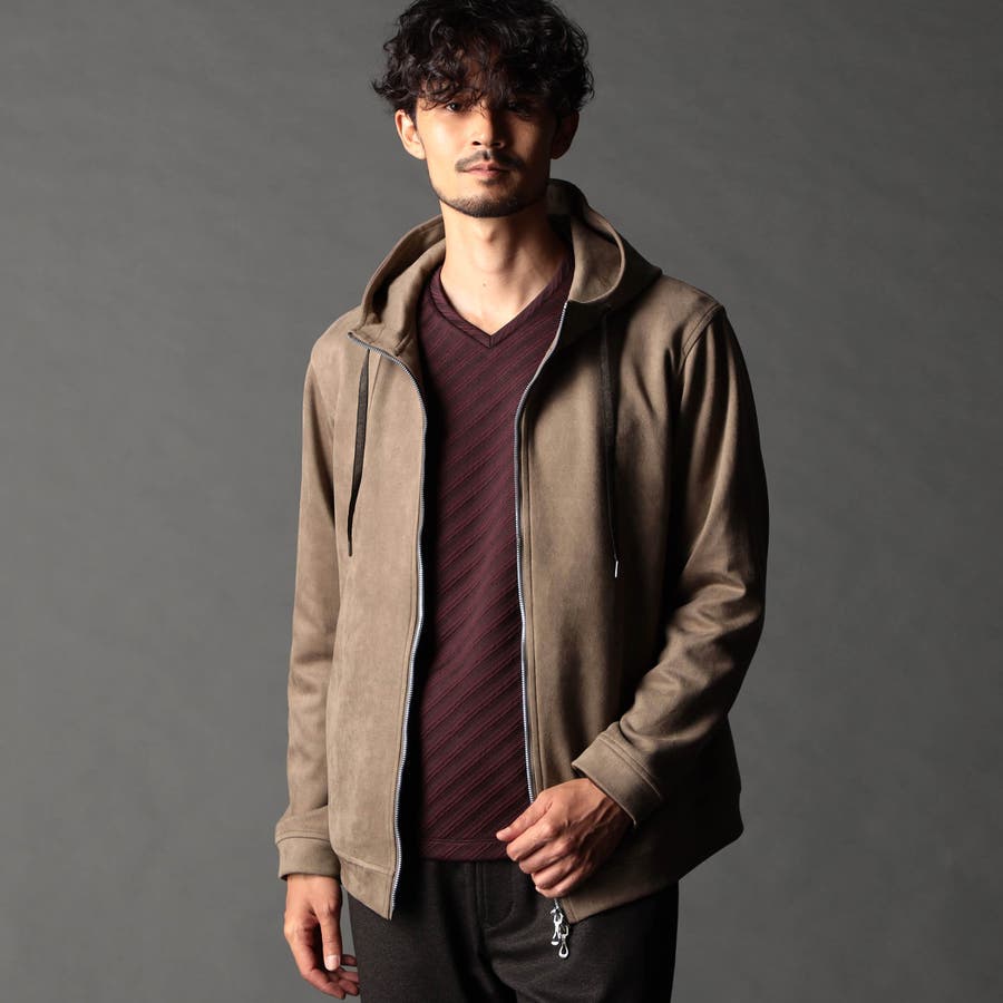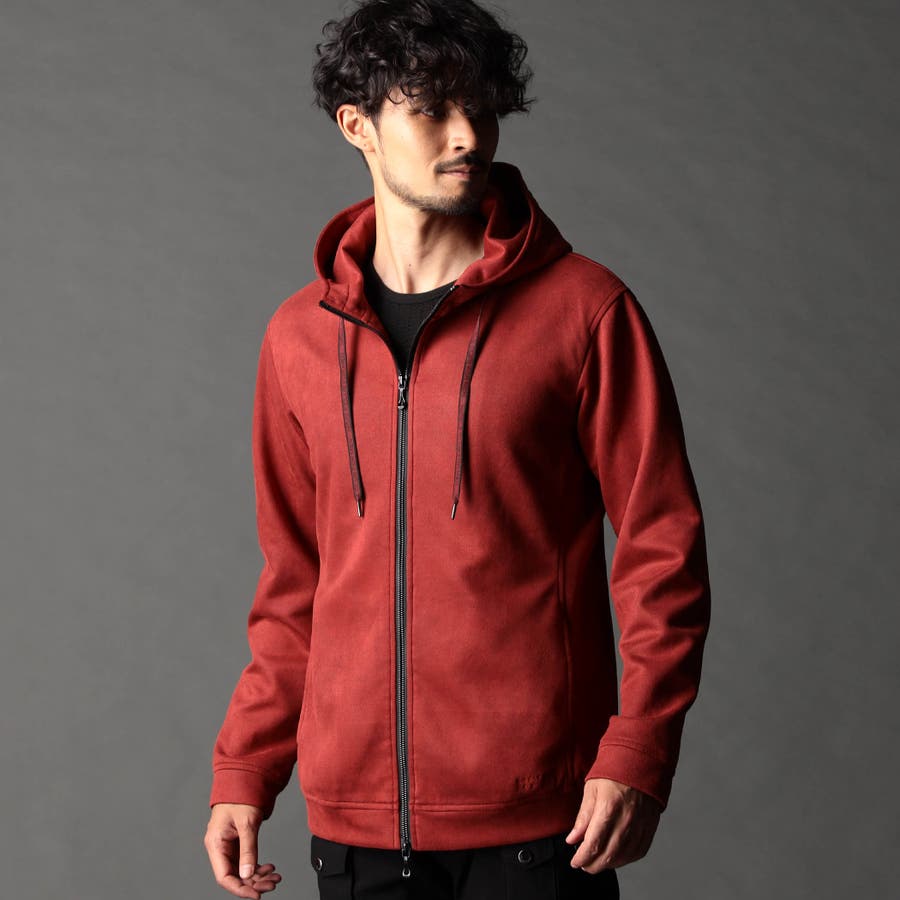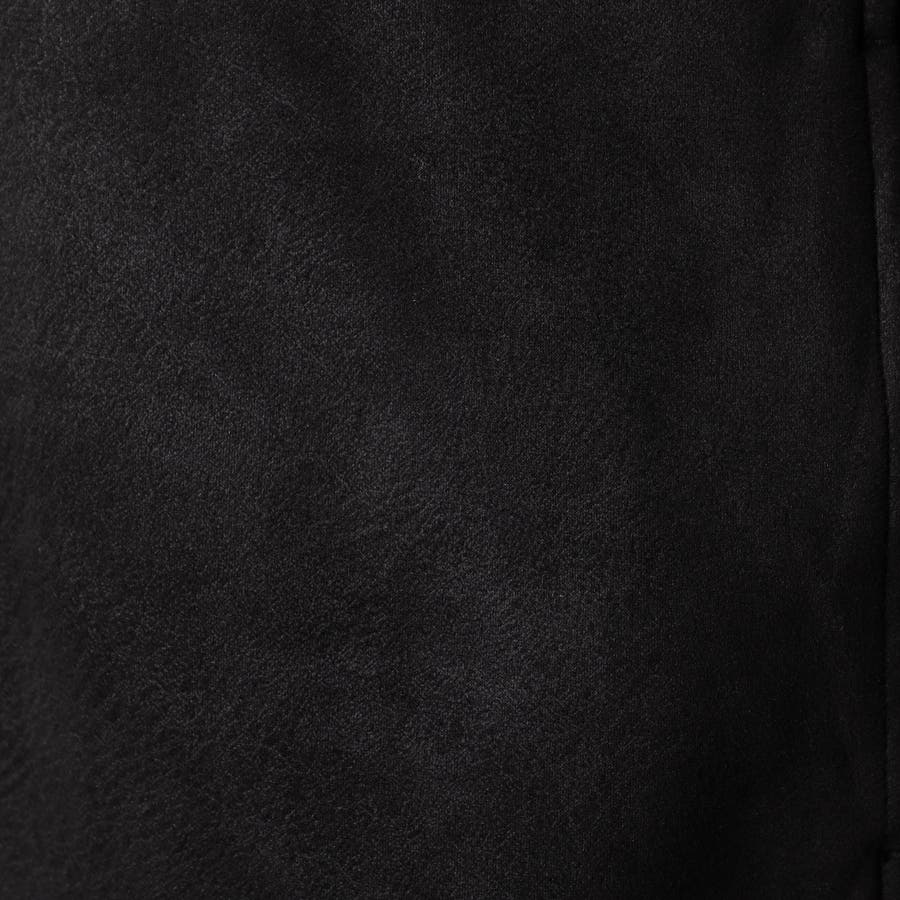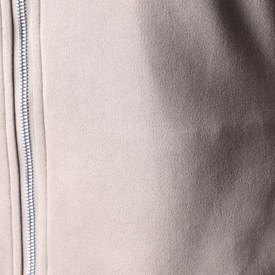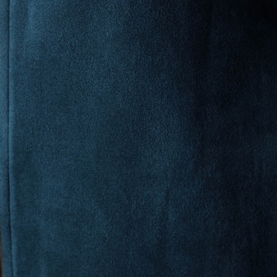 ポリエステルのマイクロファイバーで編まれたポンチ素材の表面をスウェード起毛、滑らかなタッチとソフト風合いを特徴にしたカットソー素材です。目付280g/?程の軽さとストレッチ性、ジャージ素材なのではのプリッとした横張り感もあります。16レンガと49ブラックには、光沢のあるムラプリントを施してレザー調の見え方に作っています。今季新色60ブルーは緑味が混じった濃いピーコックブルーを展開。