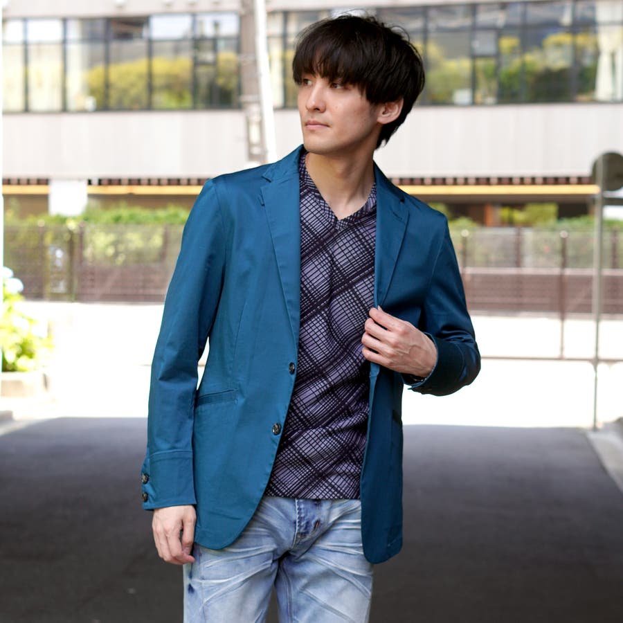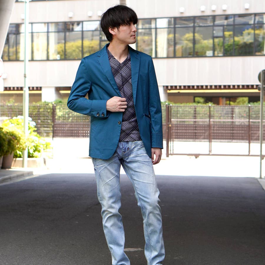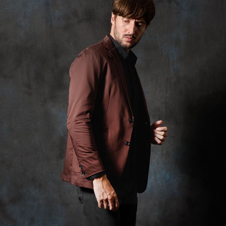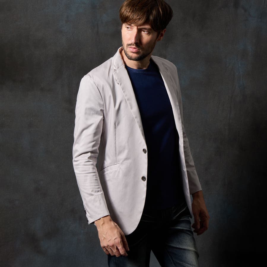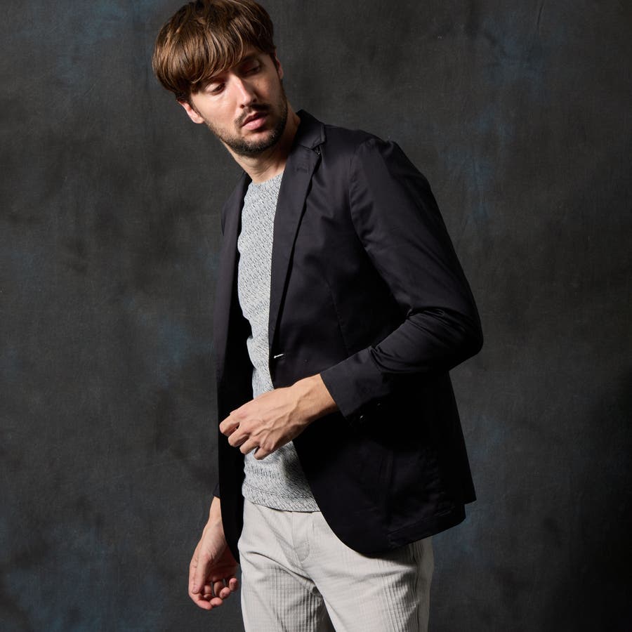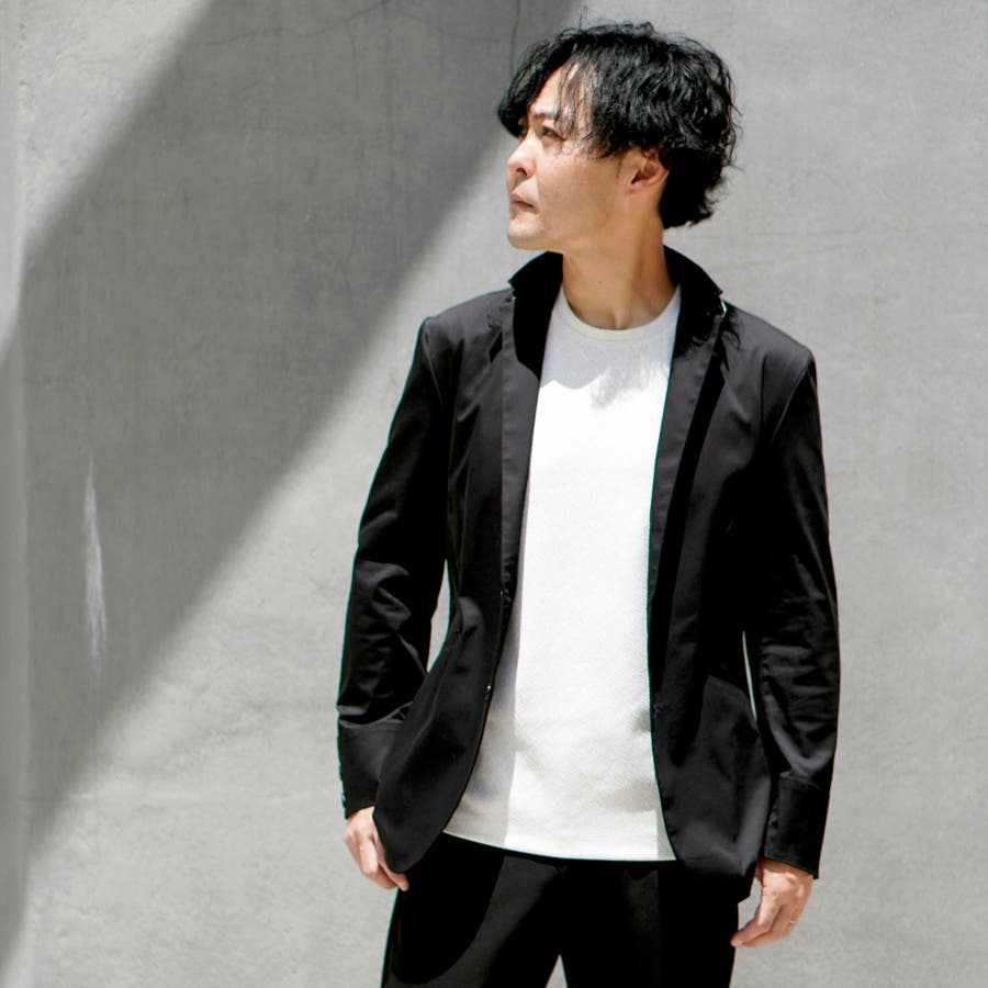 衿端にワイヤーを入れ、衿を立てても着れるようにしたデザインラペルジャケット。