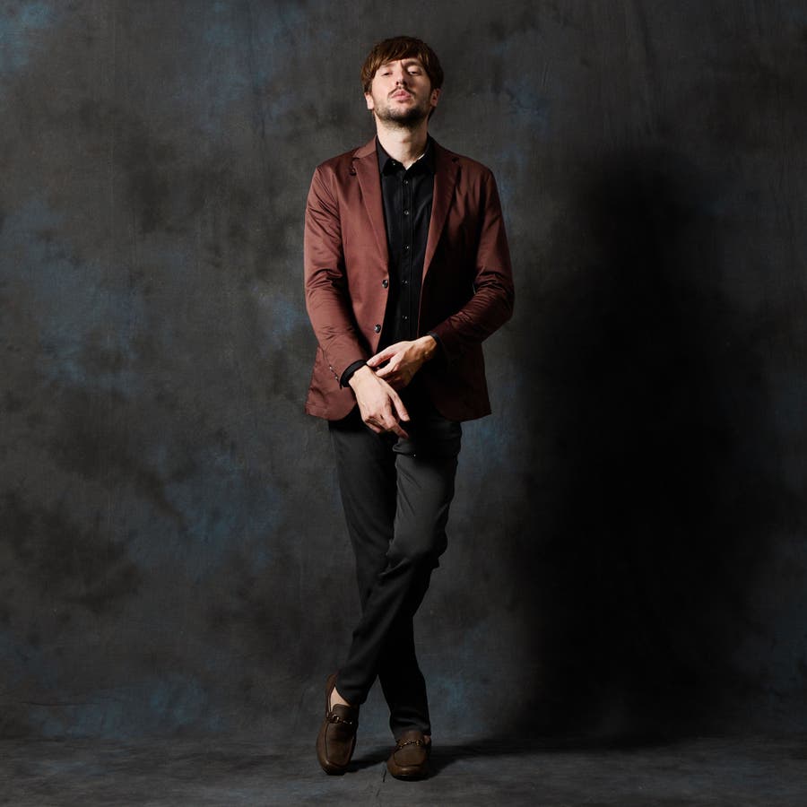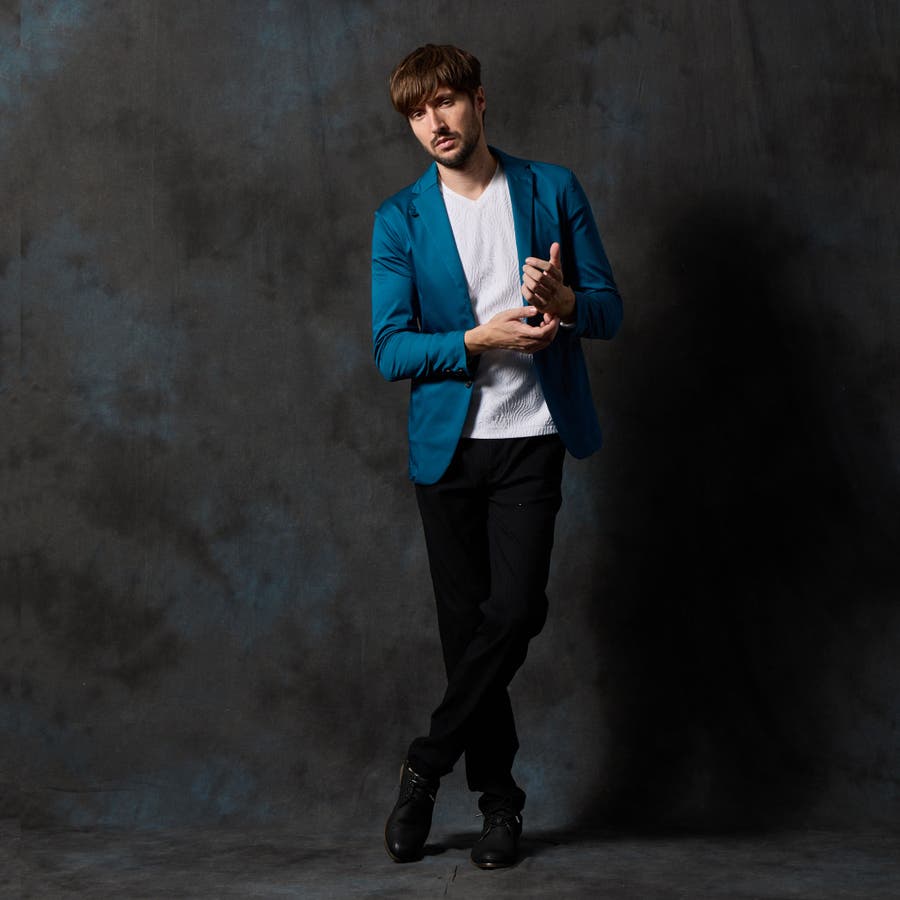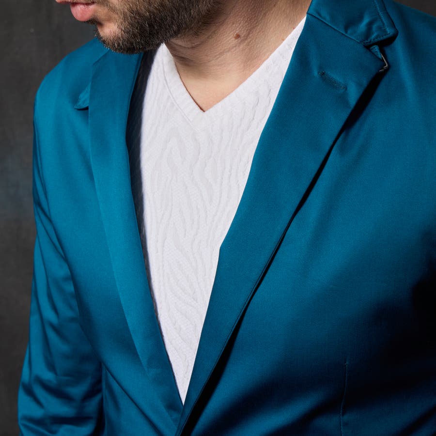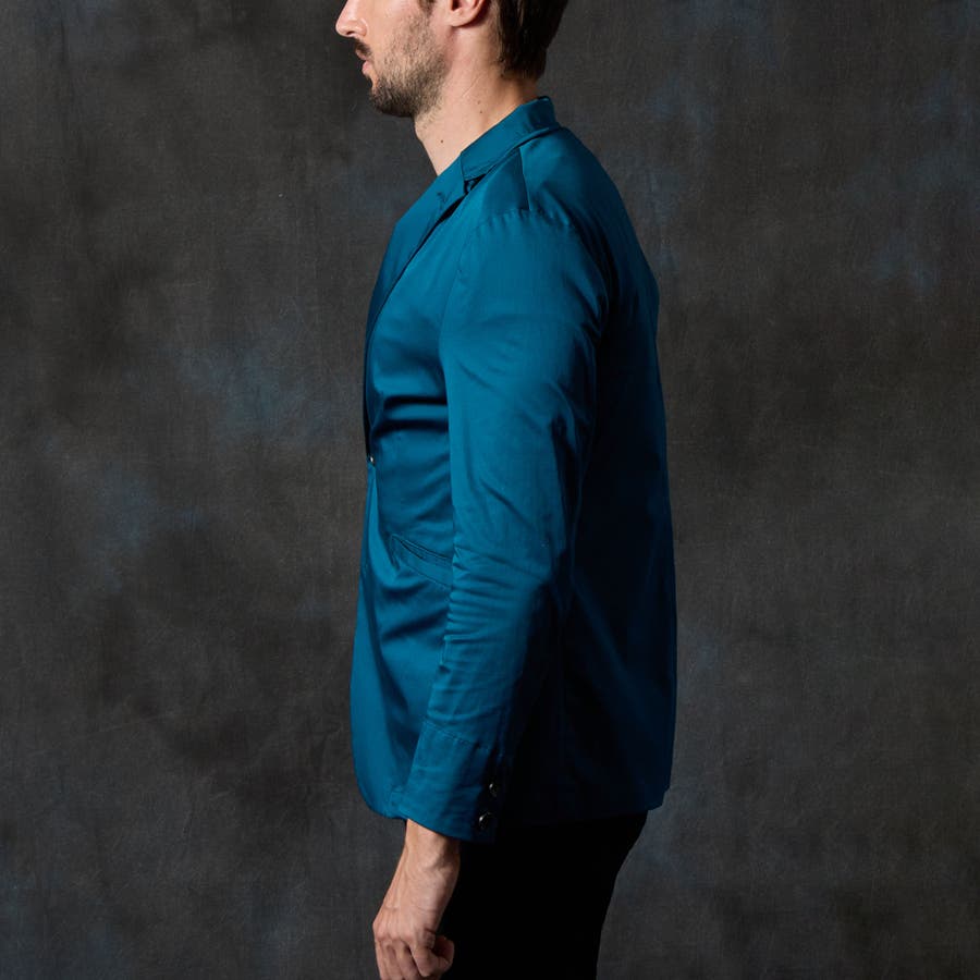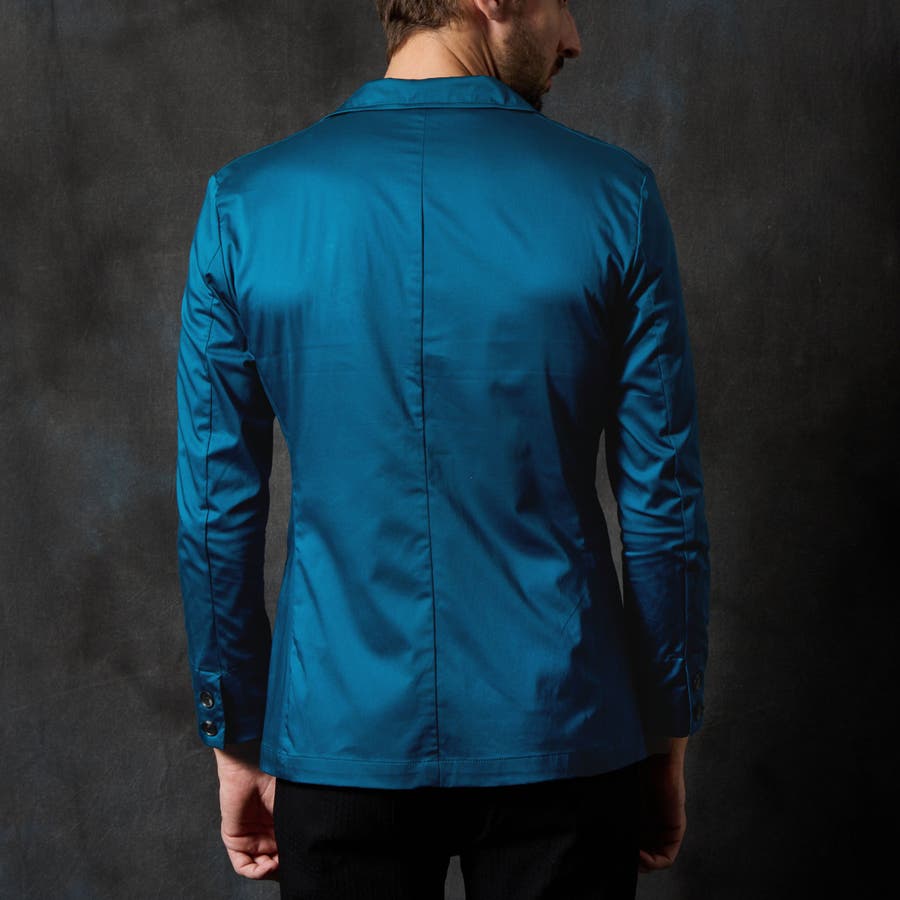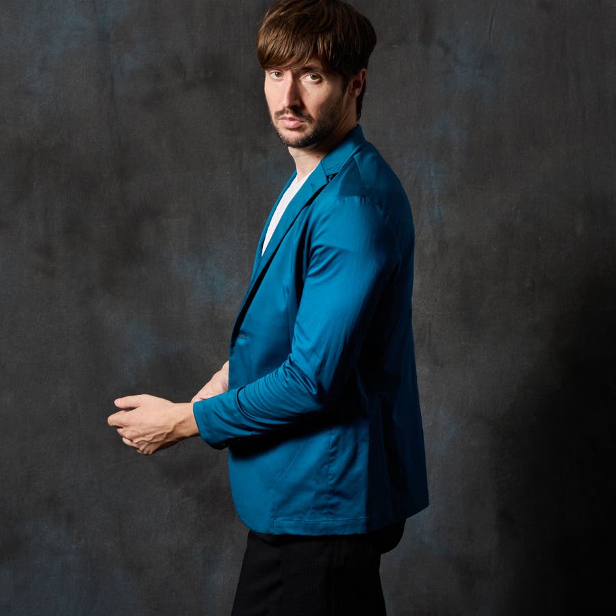 衿端にワイヤーを入れ、衿を立てても着れるようにしたデザインラペルジャケット。