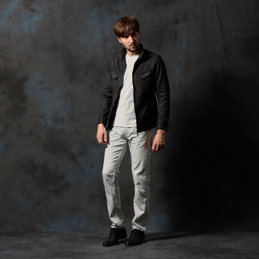 ジャージ素材ならではの横張り感・ストレッチ性はそのままに、マイクロファイバーを起毛したソフトな風合いに同色系のプリントを施す事でレザー調の質感を高めています。