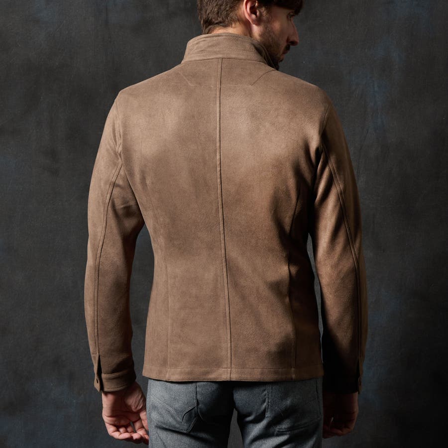 ポリエステルのマイクロファイバーで織られたカットソーポンチ素材をスウェード調に起毛し、更に細かいムラ柄のプリントを施しています。