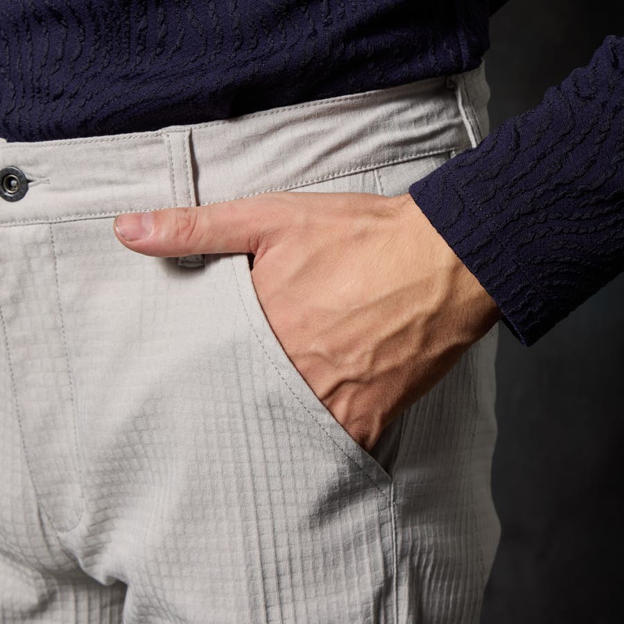 しっかりとしたハリがありながらポリウレタン混によるよく伸びるストレッチ性とキックバックが利いた素材感、合繊特有の上品な光沢が特長の素材です。