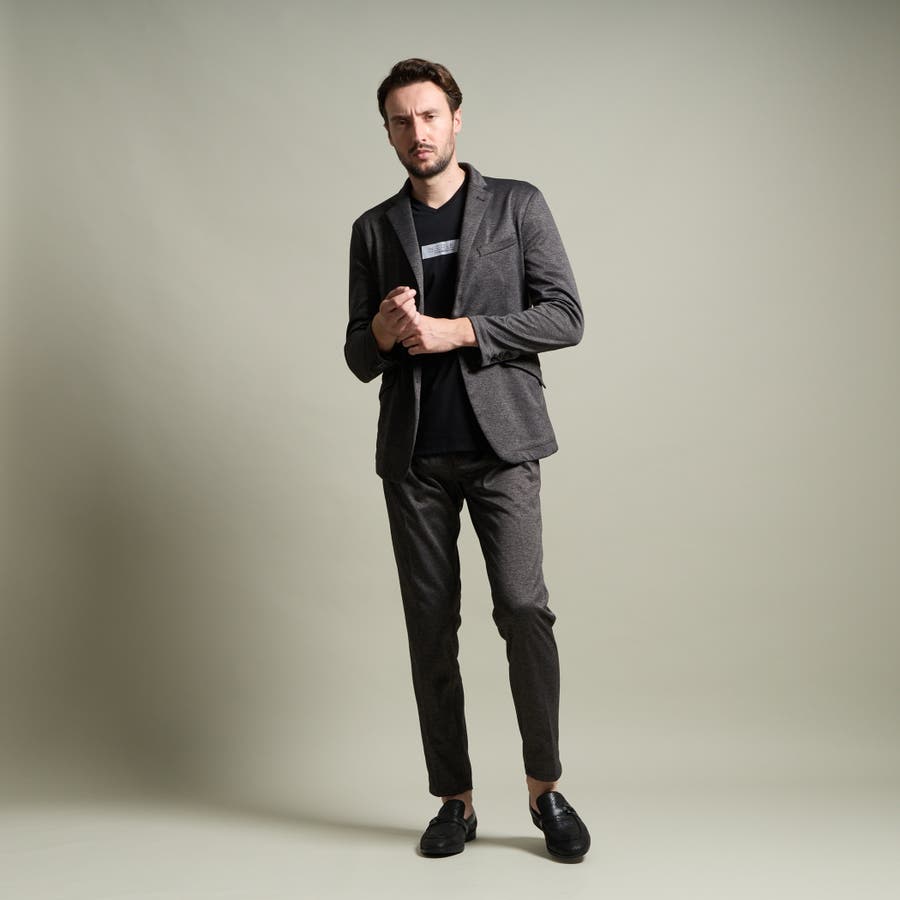 49ブラック、67ネイビーには表面に綿糸、裏面にポリエステル糸が出るように編み立てたWフェイスのカットソー素材を採用。表はカノコ組織で表面感を出し、カノコ目の間から見えるチラチラとした光沢が魅力の素材です。#91トップグレー、92トップチャコールにはポリエステルの杢糸とポリウレタンの混紡糸で編み立てたWフェイスのジャガード素材を採用。杢調の独特な色合いとキルトステッチの様な細かなダイヤ柄をジャガードで表現しています。合繊ならではの上品な光沢も魅力の素材です。どちらの素材も裏面は天竺組織ですので袖通りが良く、カットソー素材ならではのストレッチ性がストレスフリーな着心地を提供してくれます。