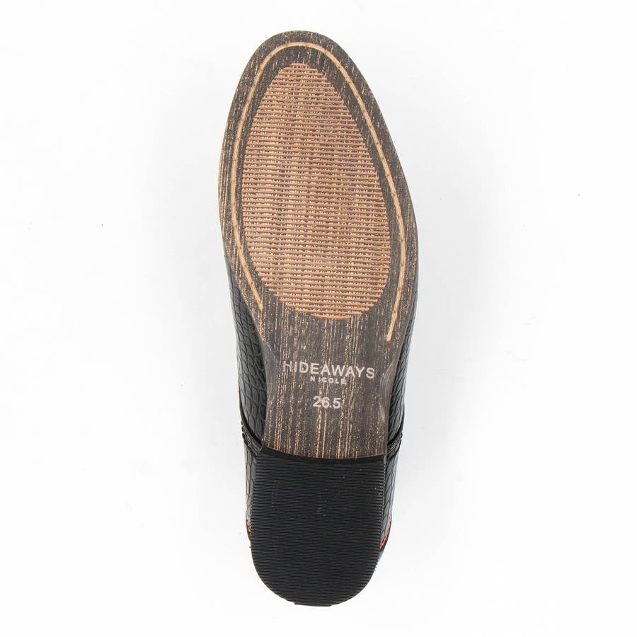 19ライトグレーと49ブラックはヌバック調のシンセティックレザーにイントレ調(編み込み)のエンボス加工を施しています。67ネイビーはインディゴデニム素材。91その他2はまっ黒のクロコ調シンセティックレザー。各色、ヒールカウンター部分には牛革を使用しています。