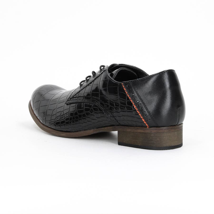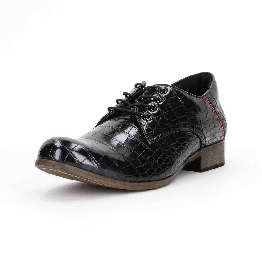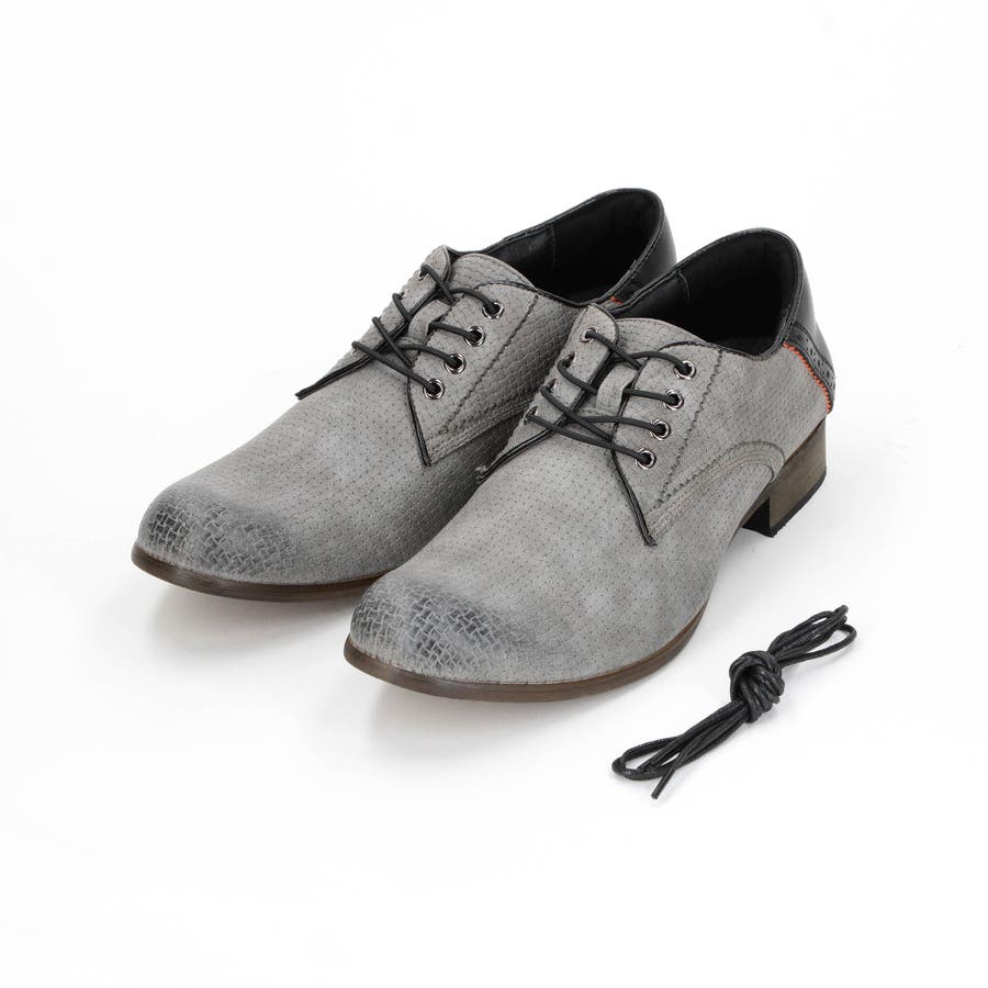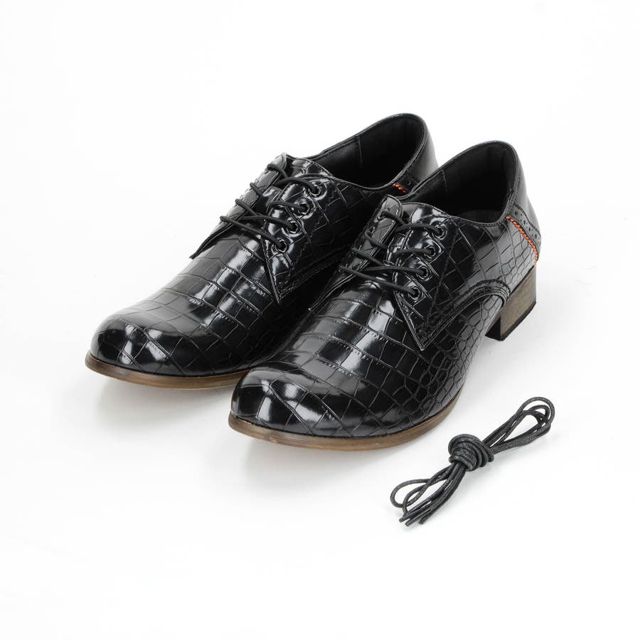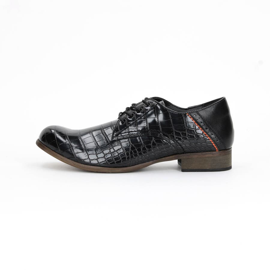 定番、外羽根デザインのプレーントゥシューズ。トゥスプリングの効いたシャープなシルエットで少し細長いの綺麗なラスト(木型)を採用。カーブした綺麗なラインをデザインの特徴に、牛革のヒールカウンターや配色の合皮パイピングを入れて細部にまでこだわっています。履き口にクッションを入れて足当たりを良くしています。ナチュラルなウッド調ソールは軽量で反り返りも良く、デニムなどのカジュアルな雰囲気にも合わせやすいです。シューレースは丸ゴムタイプと従来の伸びないロウ引きタイプも付けていますので好みに合わせて変えられます。91その他2以外、最終仕上げで手作業によるアンティーク加工を施して高級感のある仕上がりにしてます。