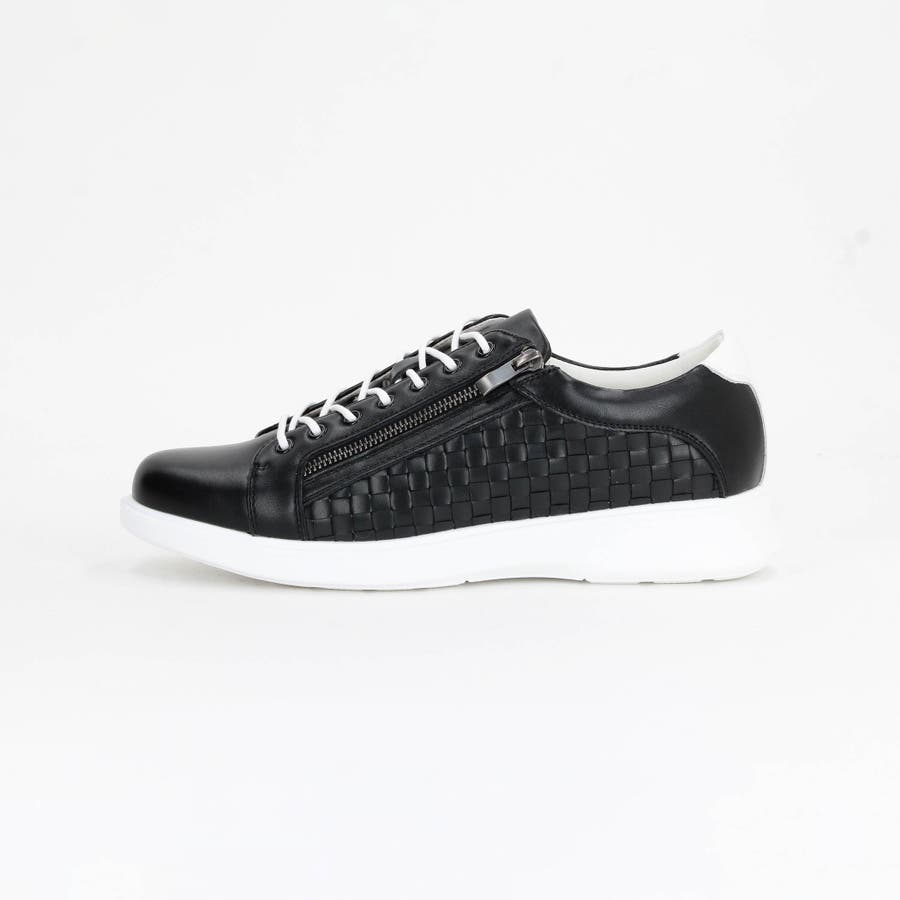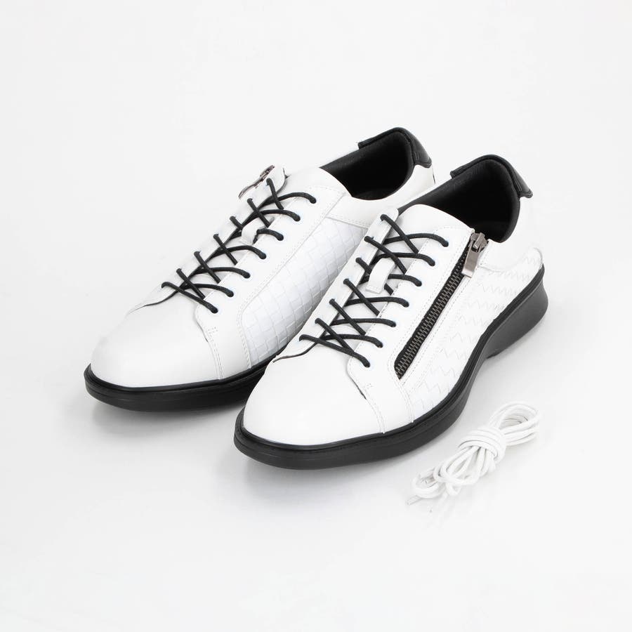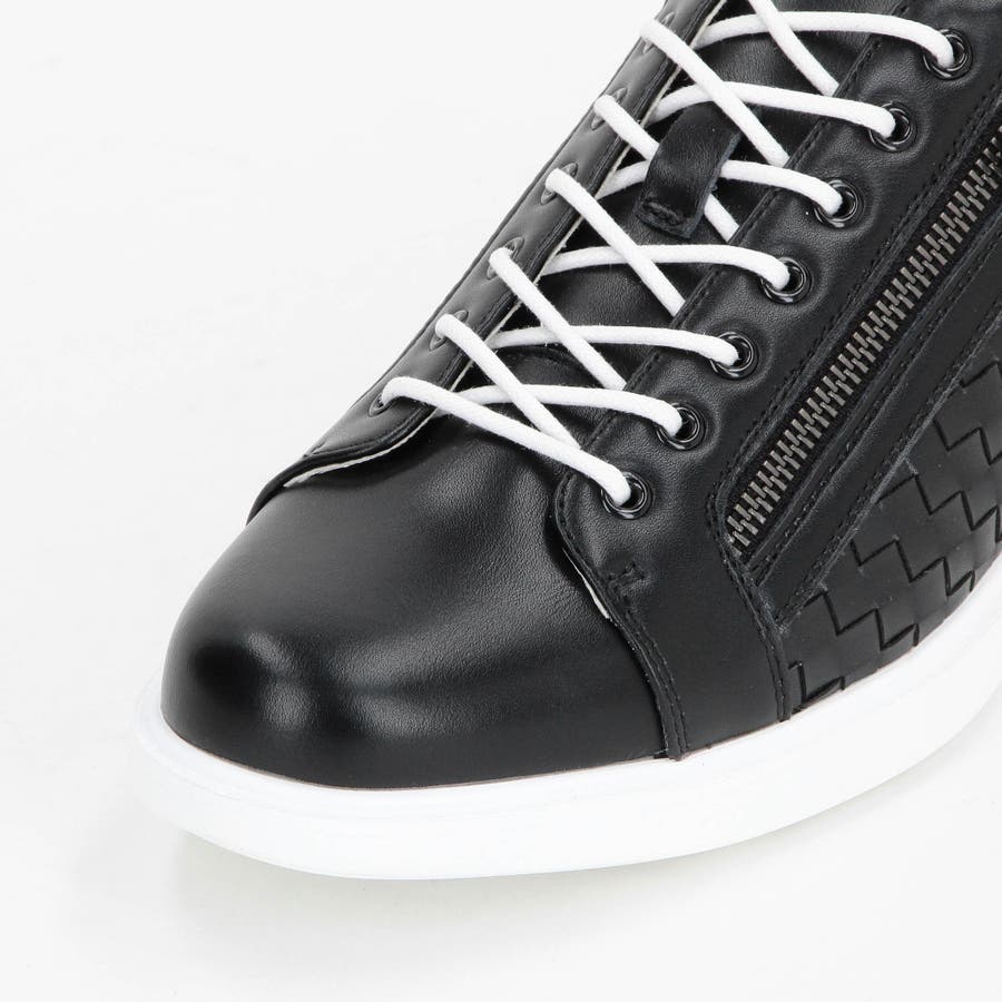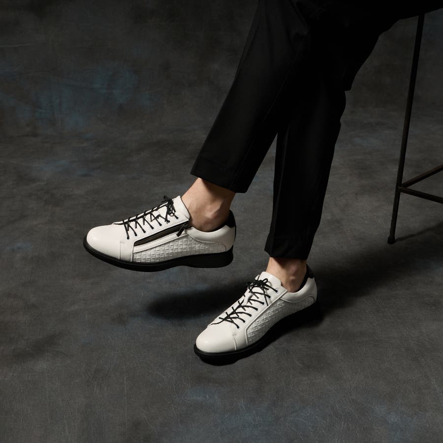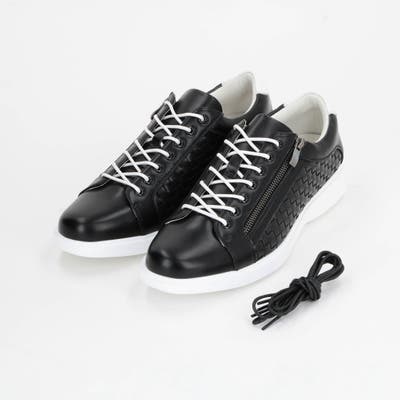 軽量ソールを採用したレースアップスニーカー。履きやすいサイドファスナー開き仕様、サイドパネルのイントレ(編み込み)デザイン、モノトーン配色、シャープなシルエットのラスト(木型)を採用する事でモードなイメージに仕上げています。持った時にわかる程好いボリュームのある軽量ソールと履いた時にわかるクッション性の高いインソールを採用して履き心地を高めています。アッパー同色のシューレースもスペアで付けていますので、気分に合わせて変えてください。