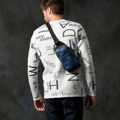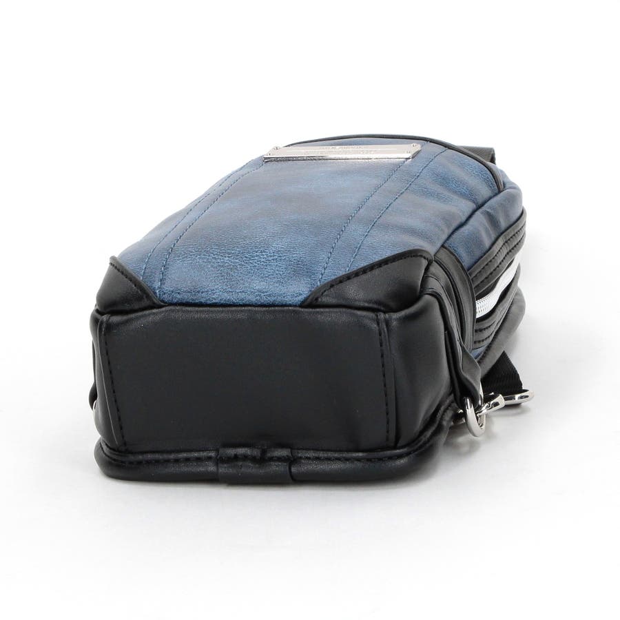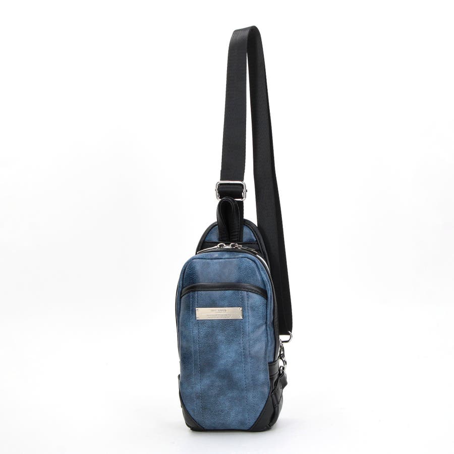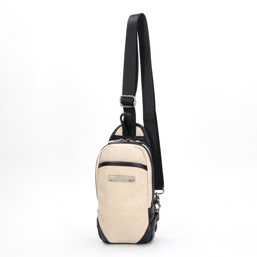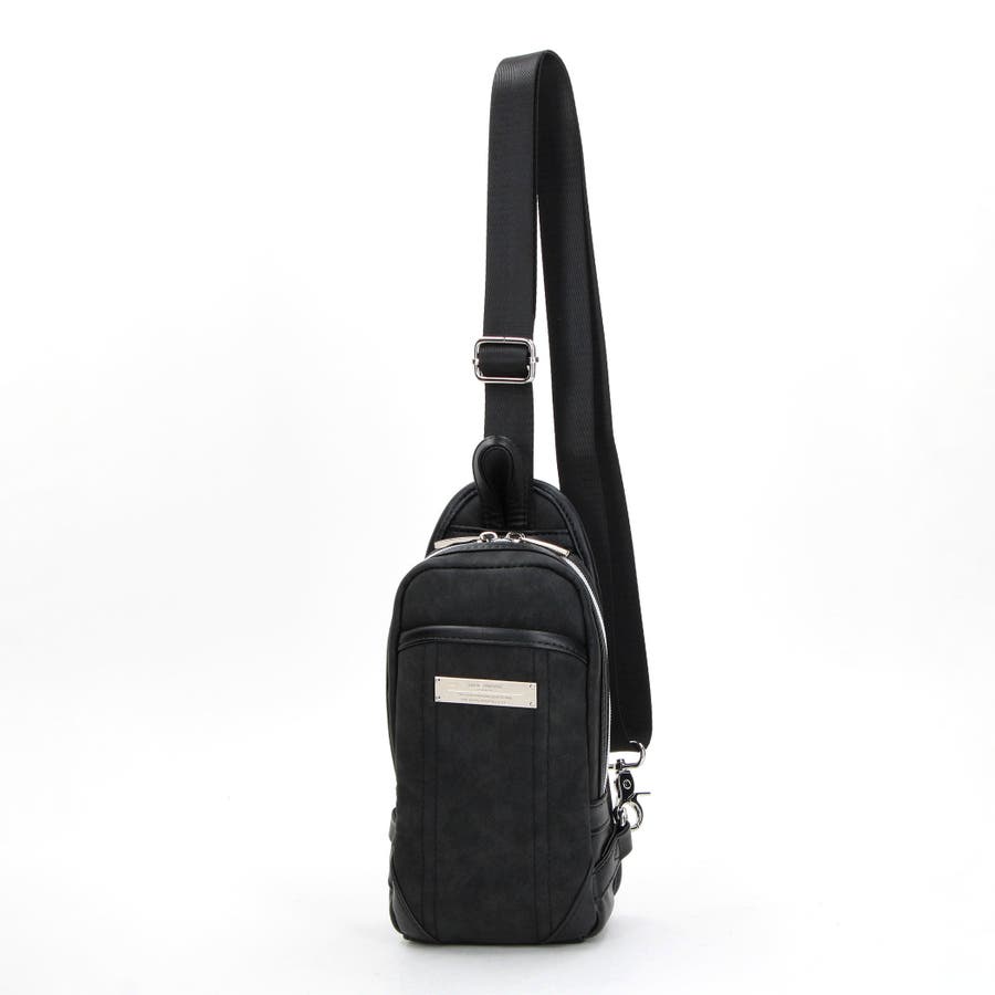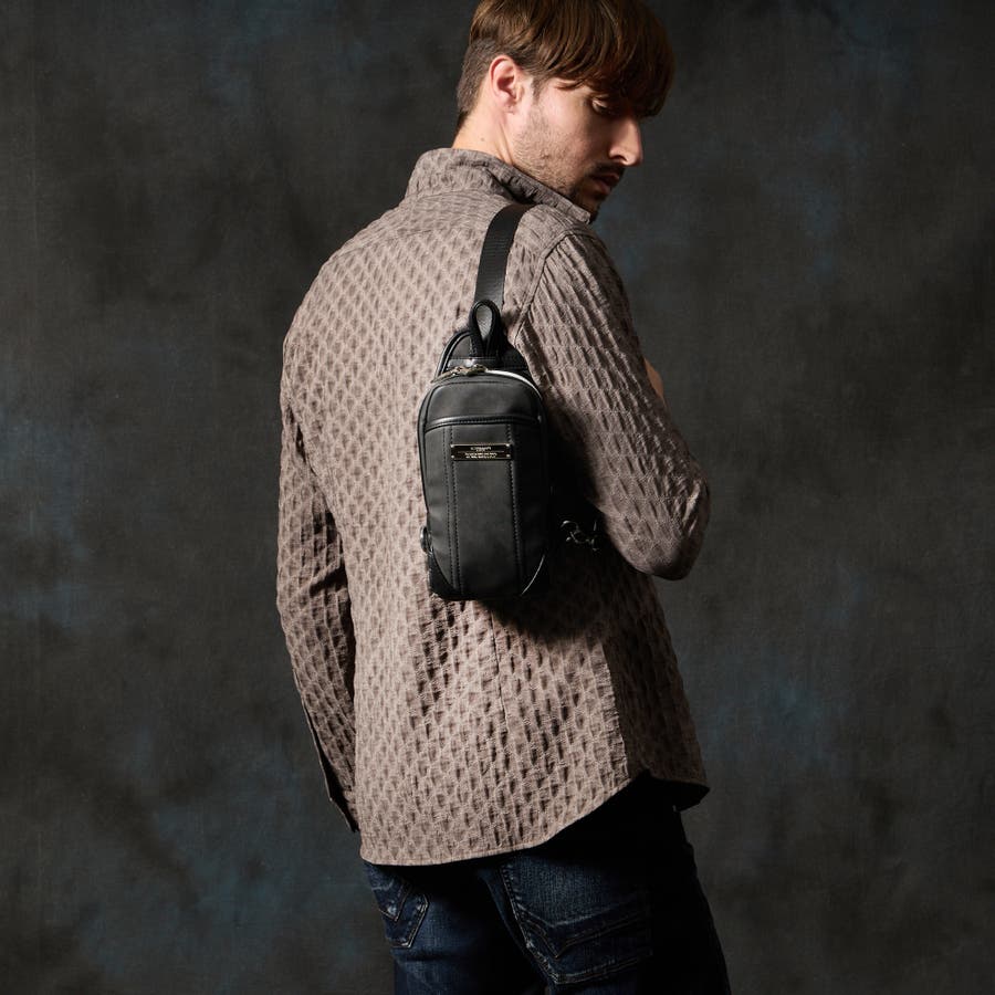 ムラ調の合成皮革を使用したモードな印象のミニボディバッグ。ロゴ刻印入りのメタルプレートが一際目を惹きます。部分的にブラックの別生地で切り替えてスタイリッシュな印象に仕上げています。フロントにはあおりポケットを設け、荷物の仕分けも可能です。