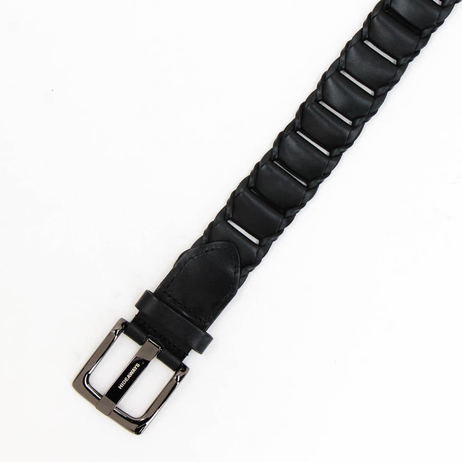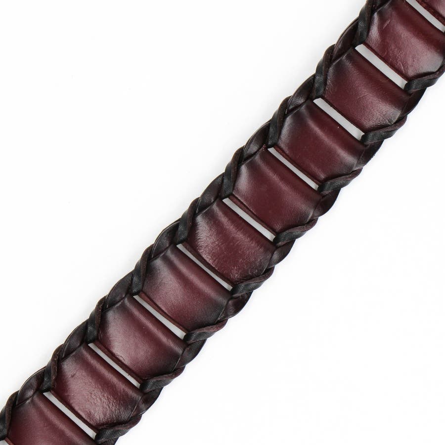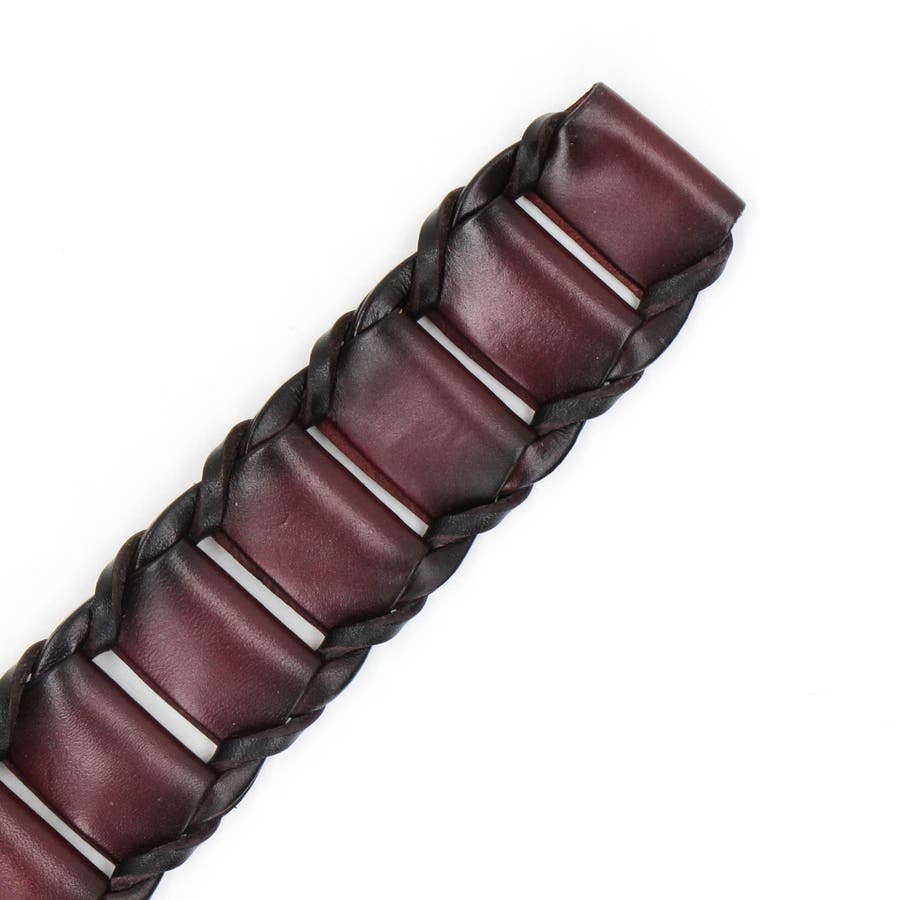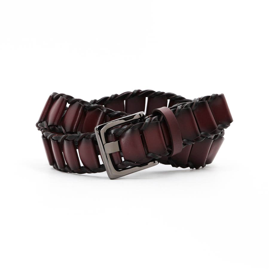 型抜きした牛革パーツを手作業で編み込んだ、オリジナリティ溢れるレザーメッシュベルト。