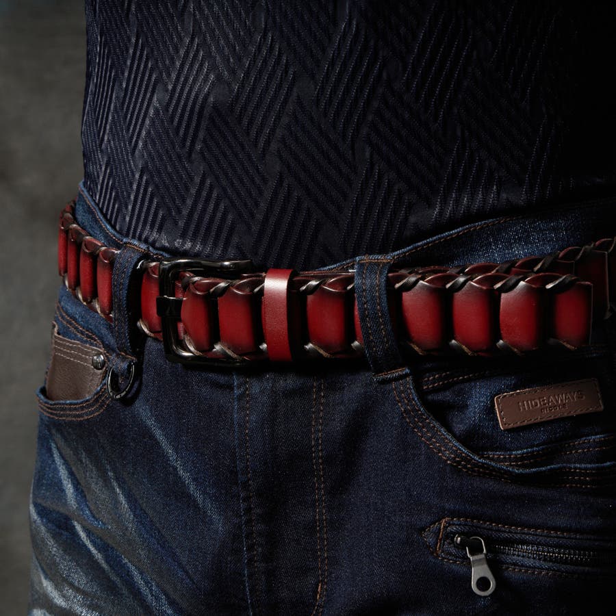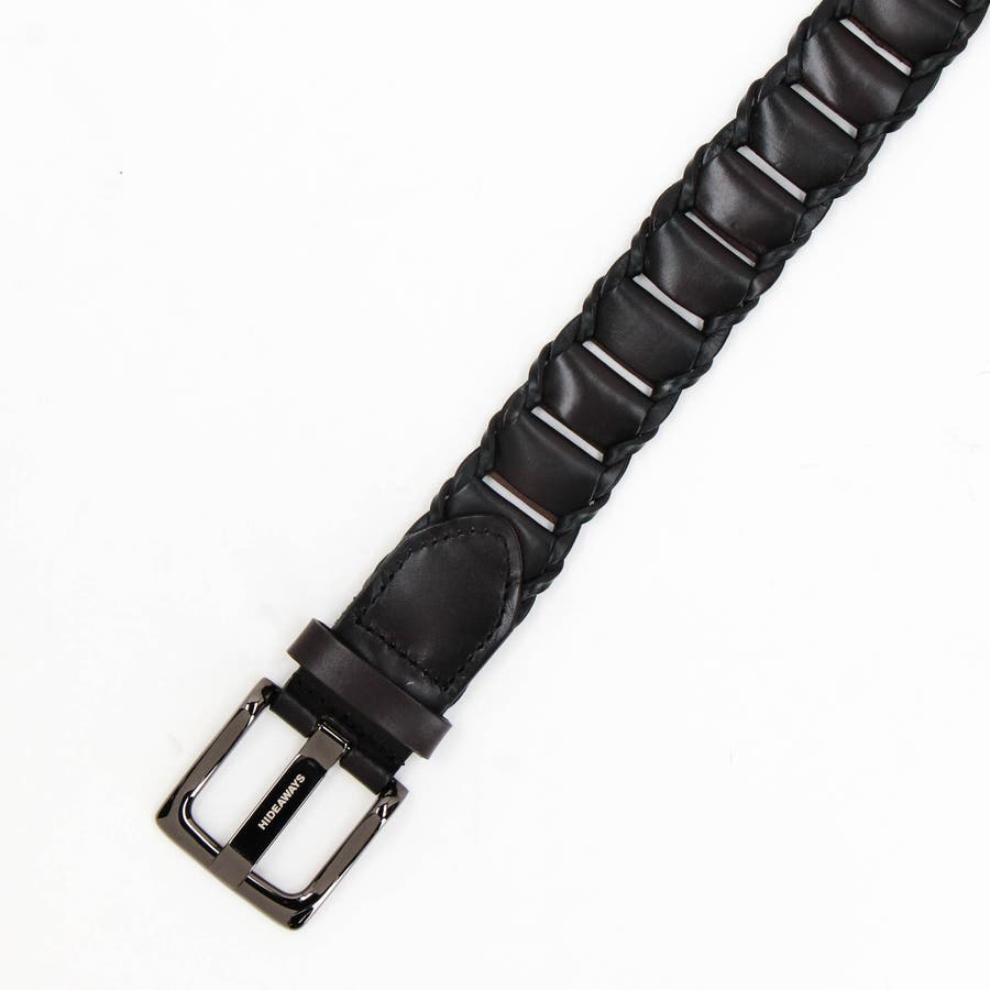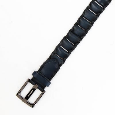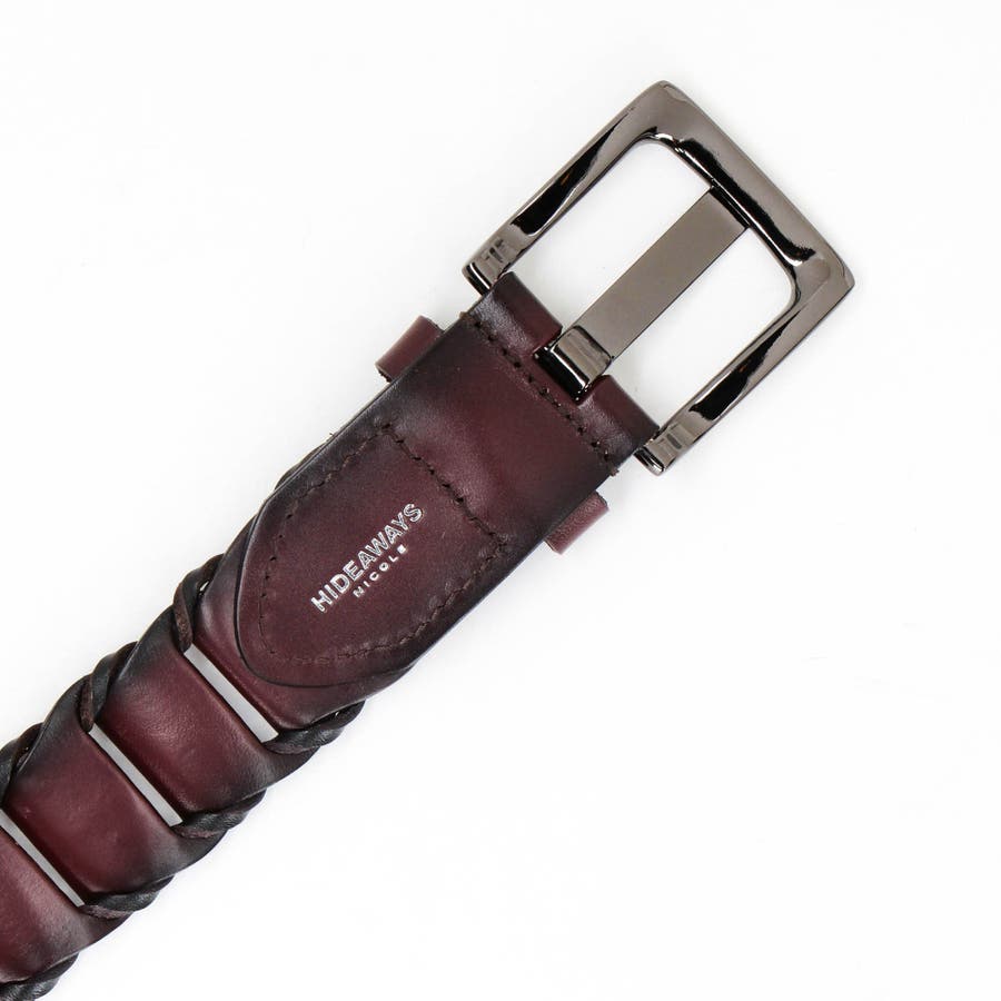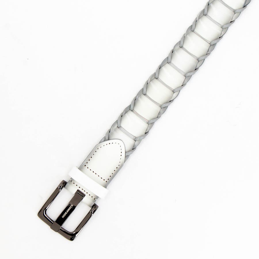 型抜きした牛革パーツを手作業で編み込んだ、オリジナリティ溢れるレザーメッシュベルト。