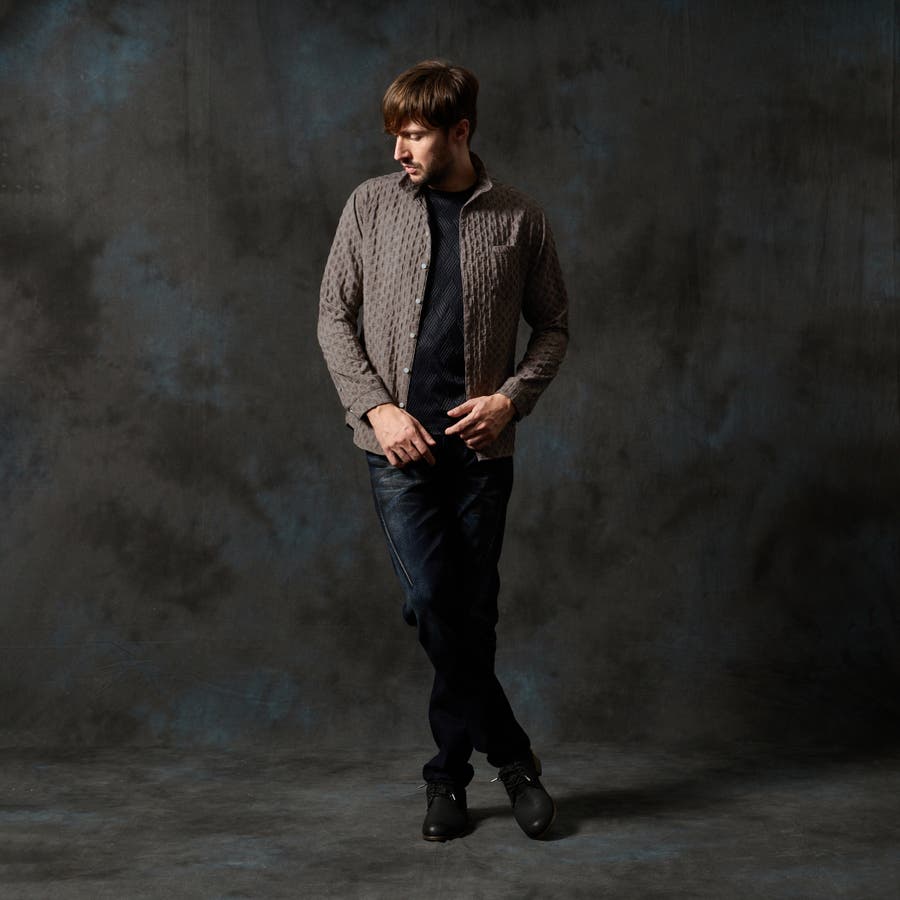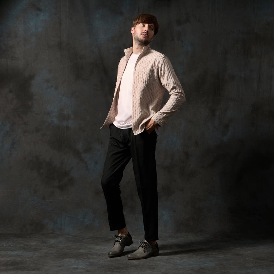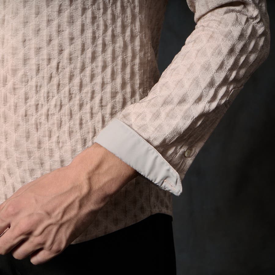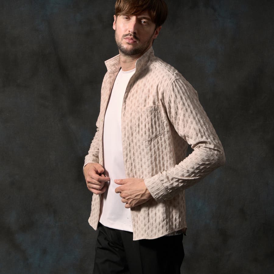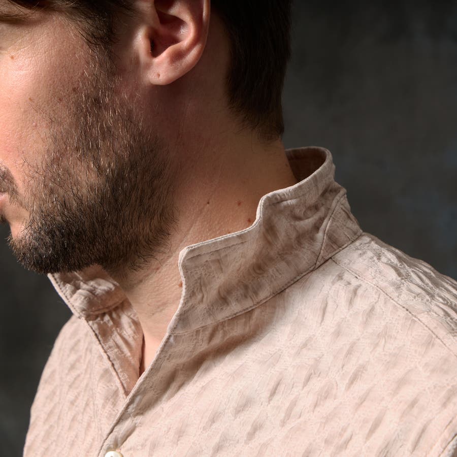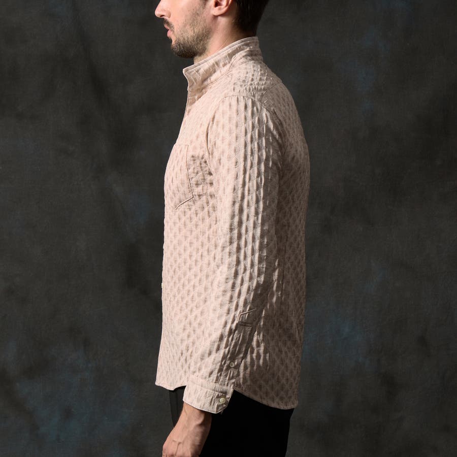 衿端にワイヤ-を仕込んだスタンドカラ-シャツ。