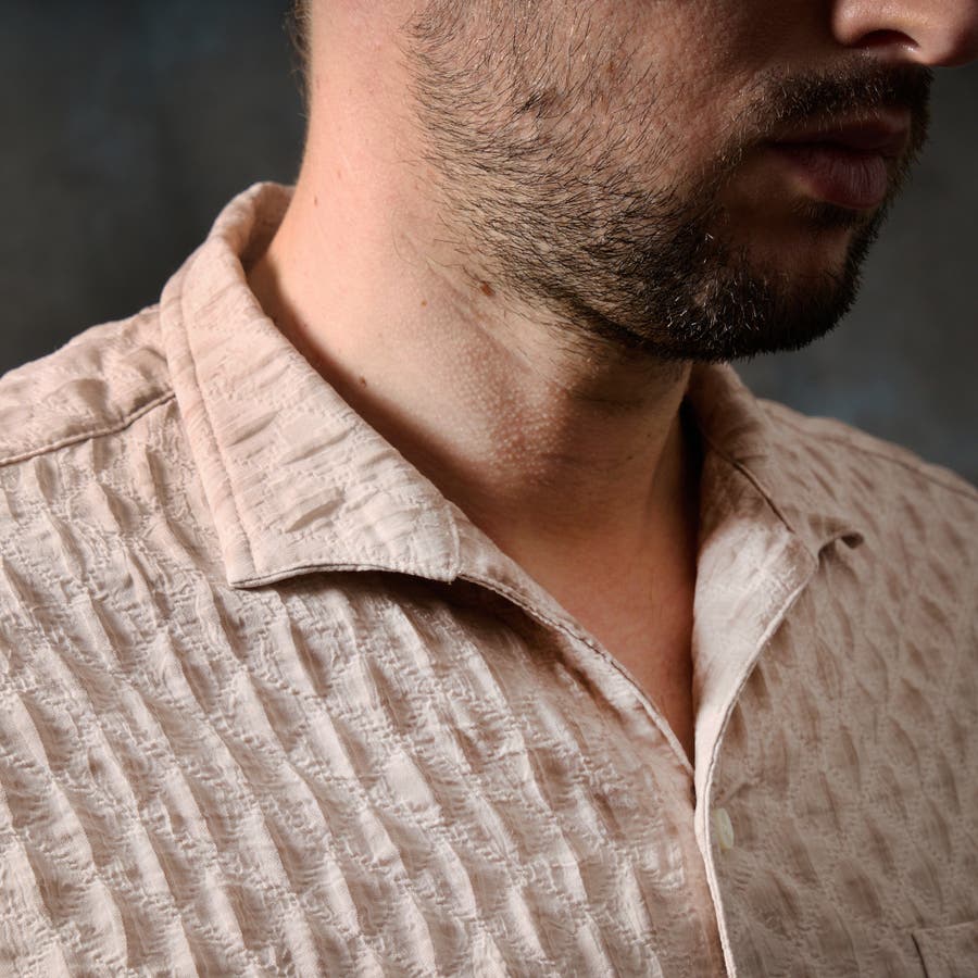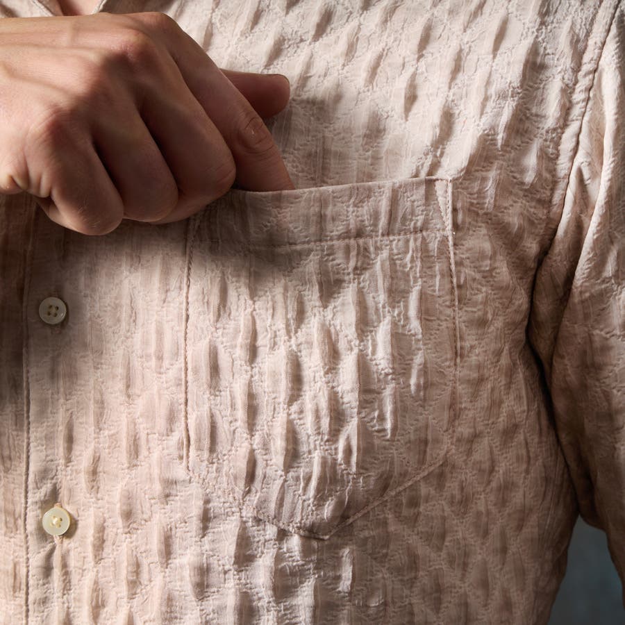 しなやかさタッチ感とストレッチ性があり、カラーコーティングした事でふくれ織り特有のオウトツで色の差が出る面白い素材です。
