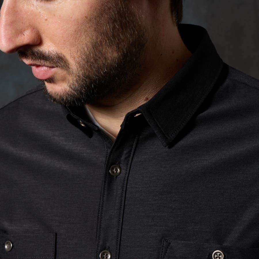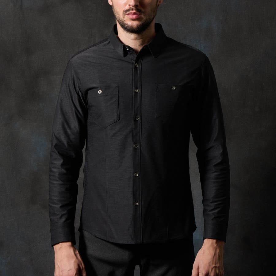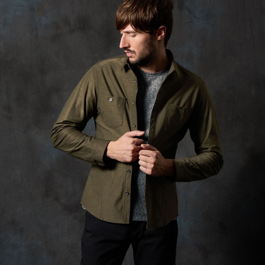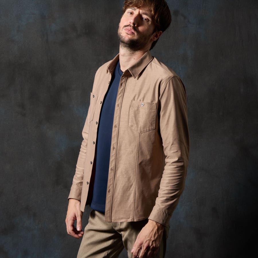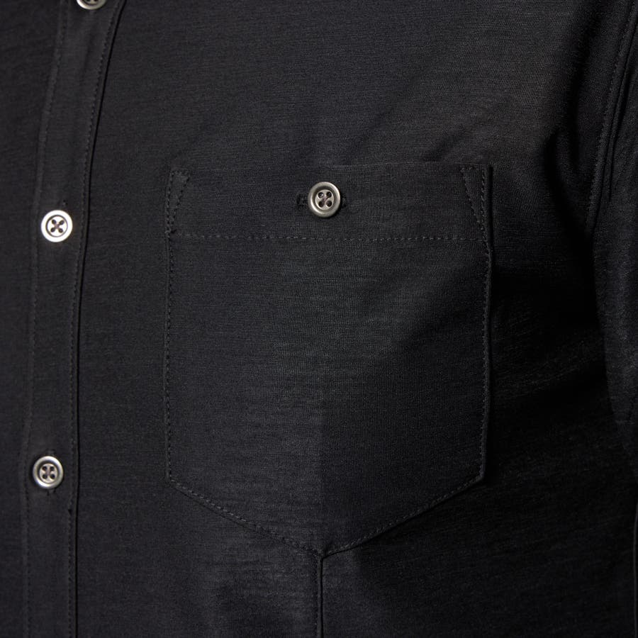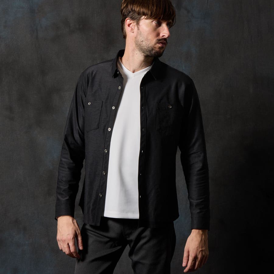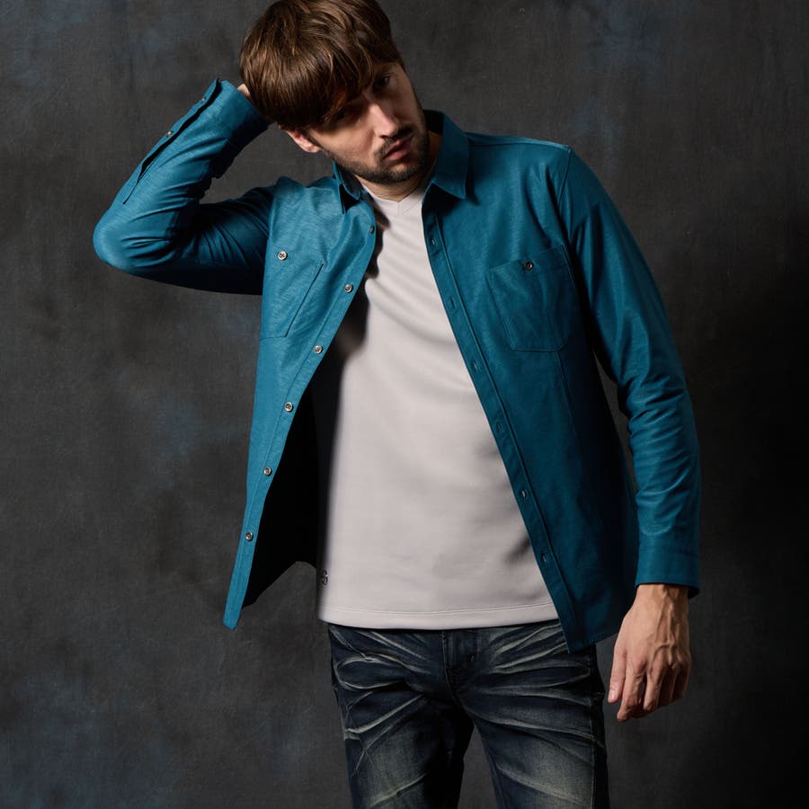 胸にダブルパッチポケットを配した、ショートレギュラーカラーデザインのシャツブルゾン。