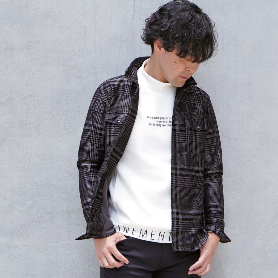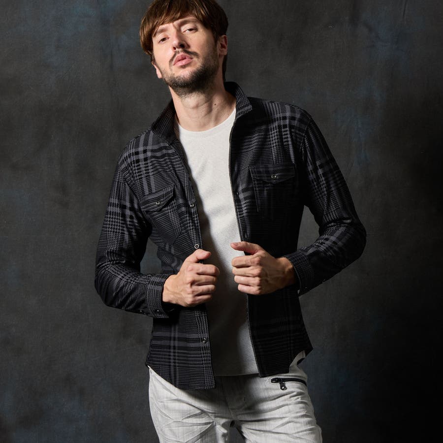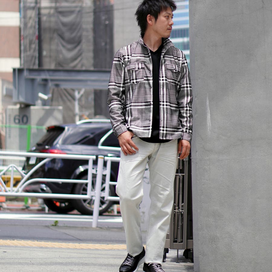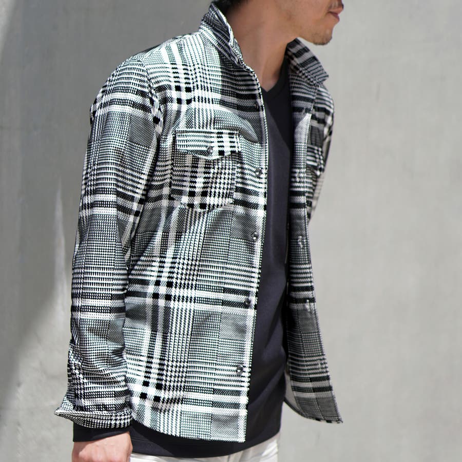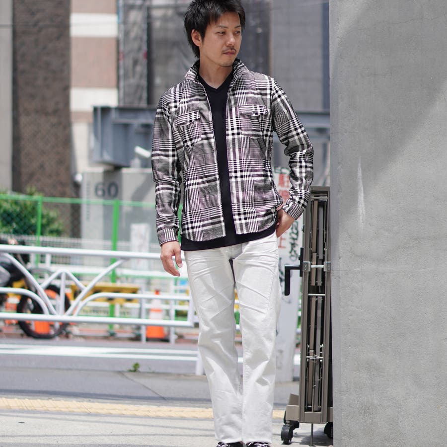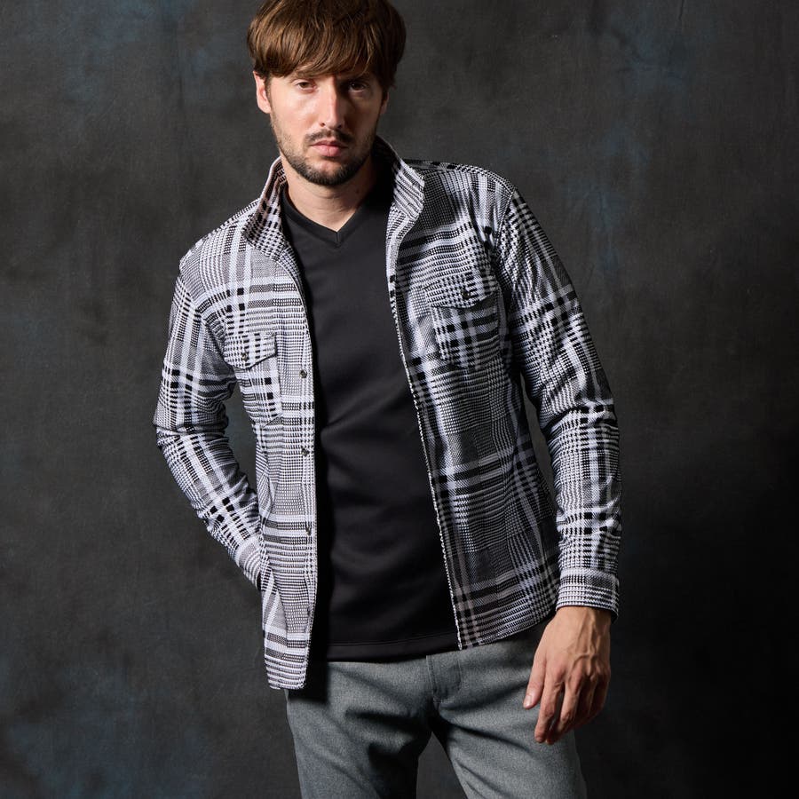 衿端まで止められるスタンドカラーが特徴的なダブルパッチデザインのシャツ。