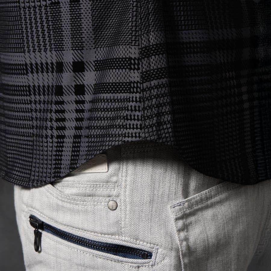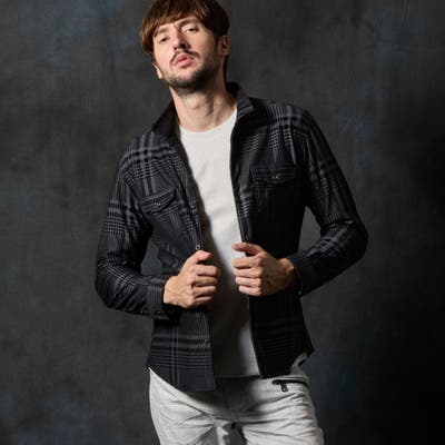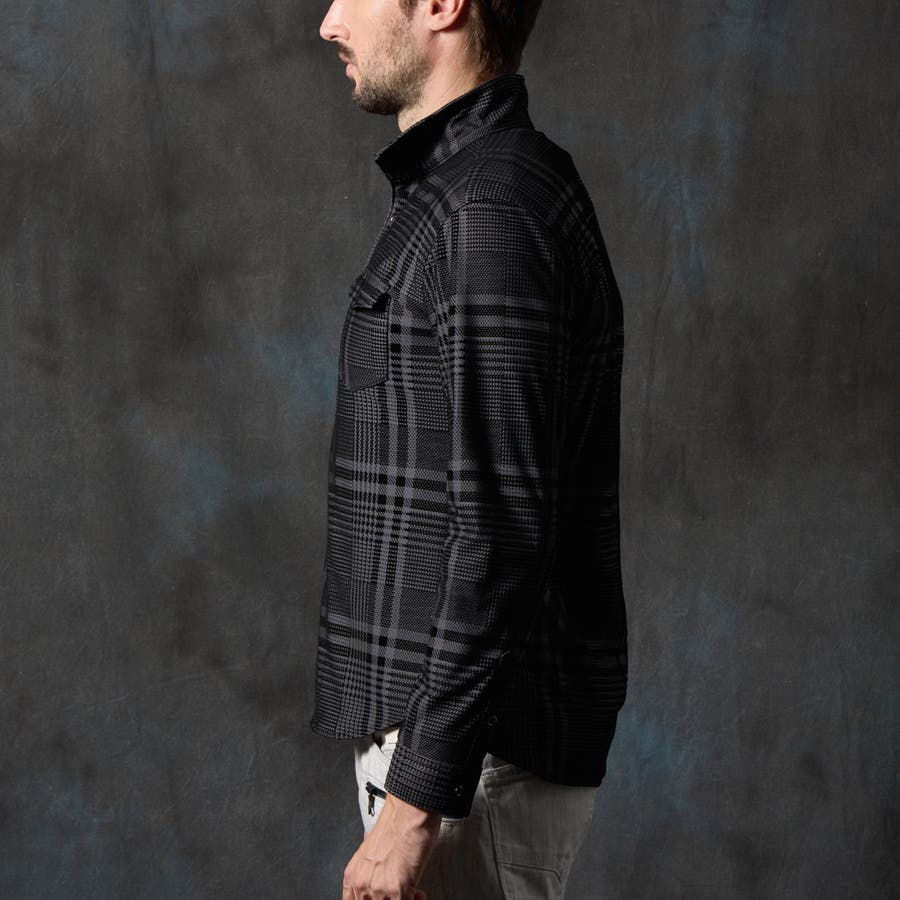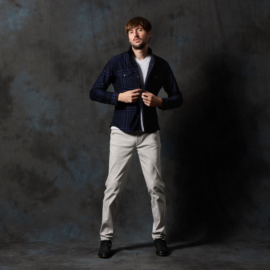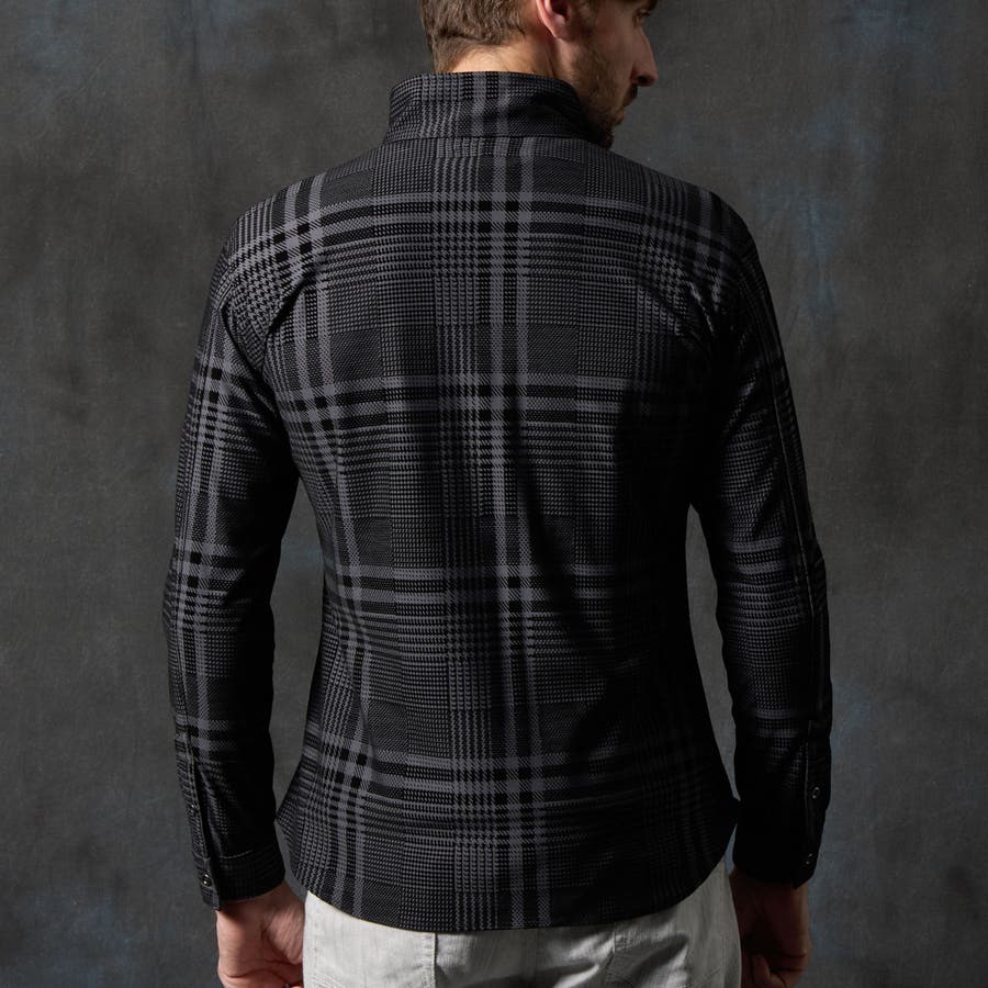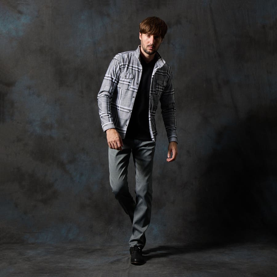 衿端まで止められるスタンドカラーが特徴的なダブルパッチデザインのシャツ。