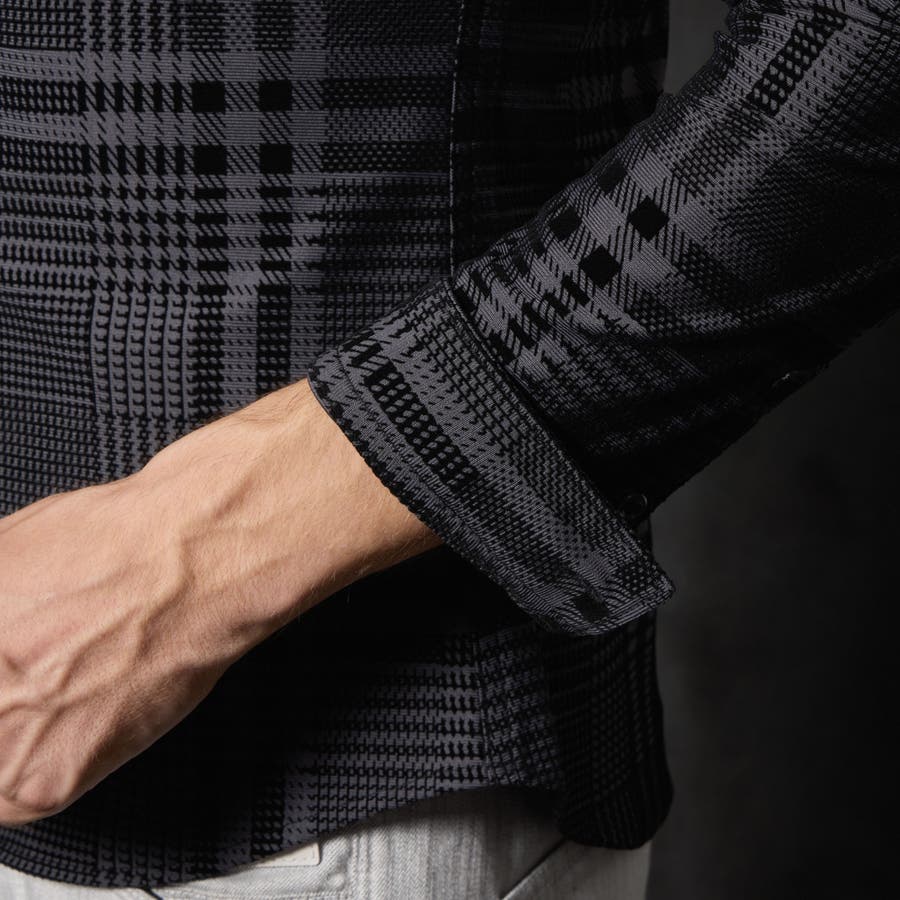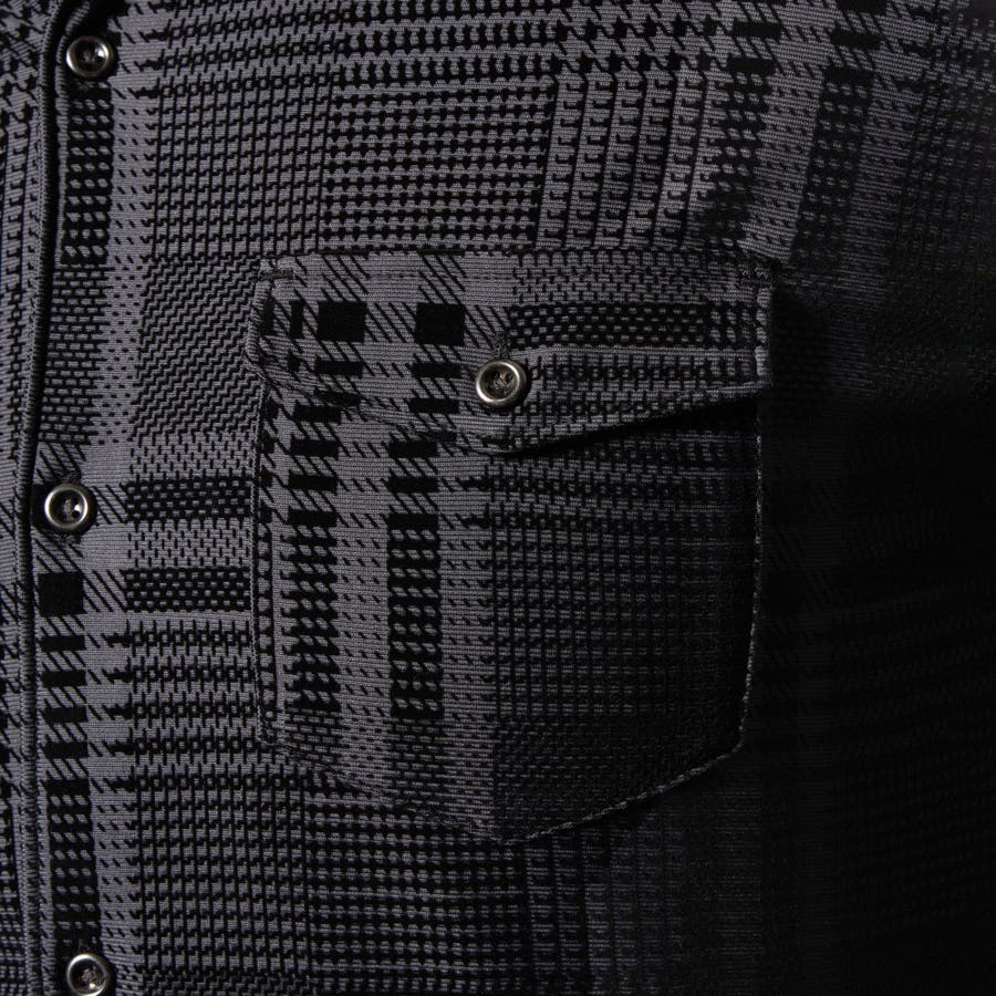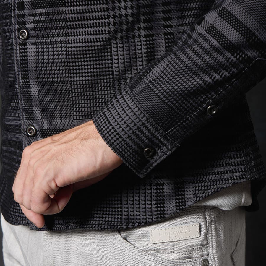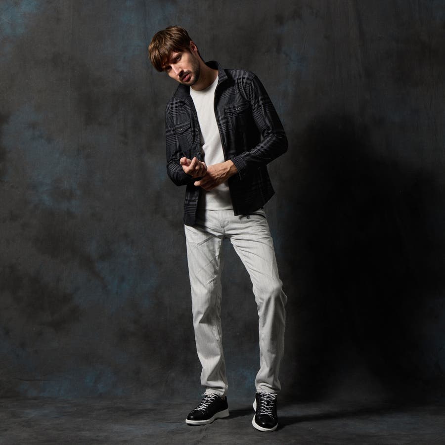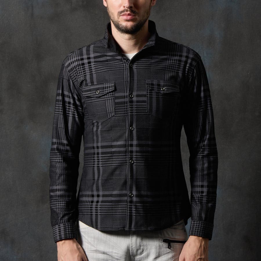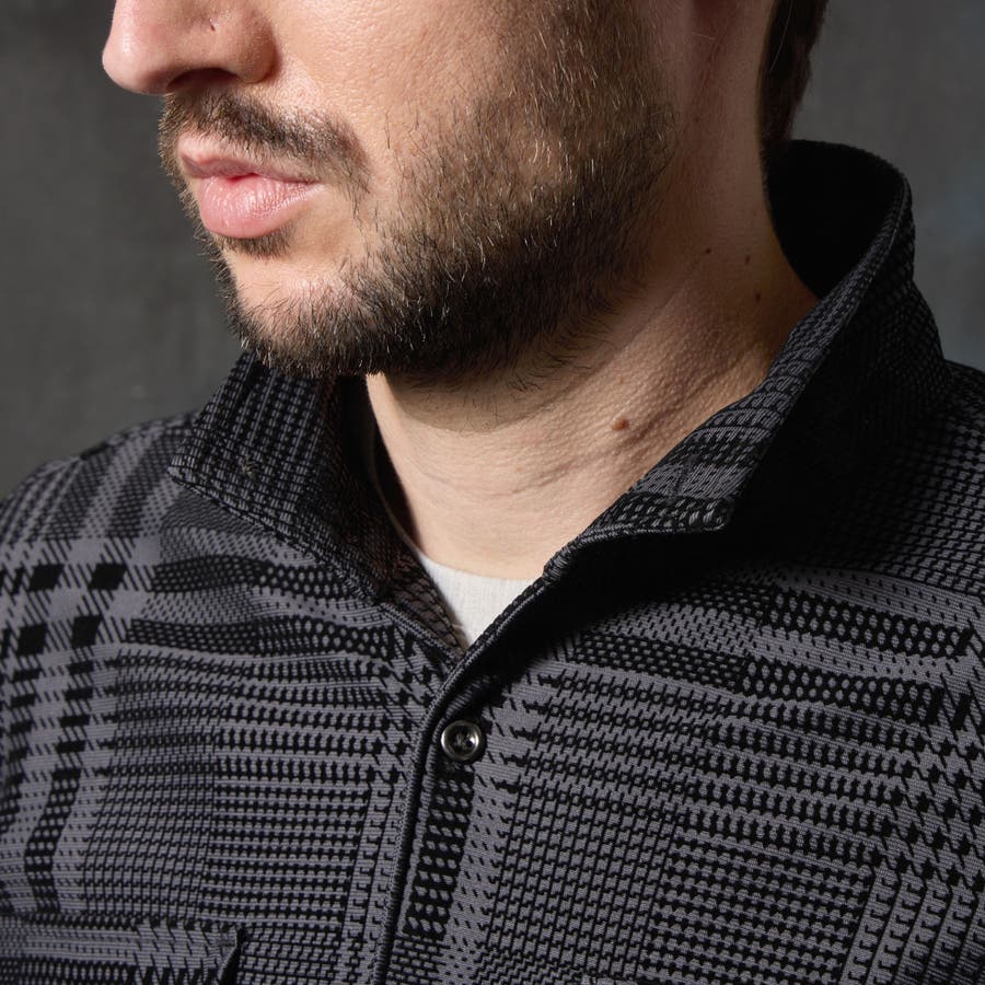 衿端まで止められるスタンドカラーが特徴的なダブルパッチデザインのシャツ。