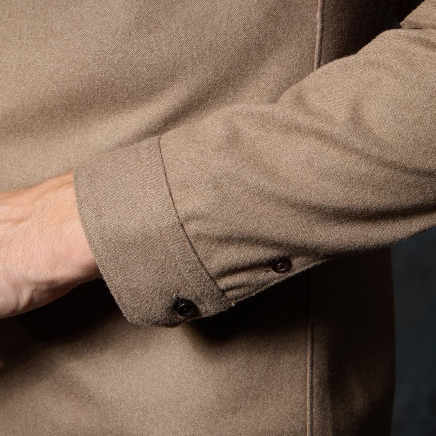 杢調のポリエステル糸を使用したカットソーポンチ素材に起毛をかけてウールのホームスパン調に仕上げた素材を使用。