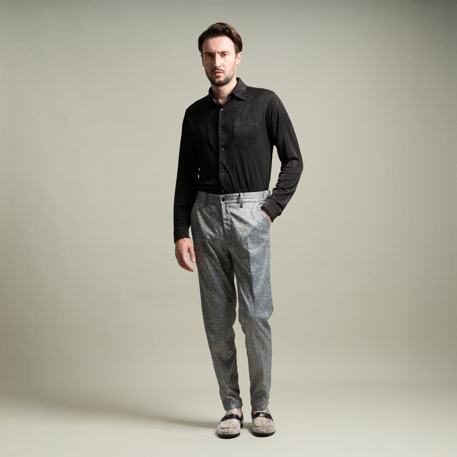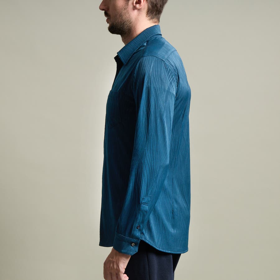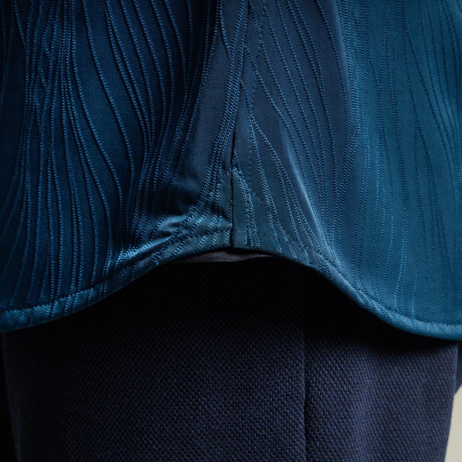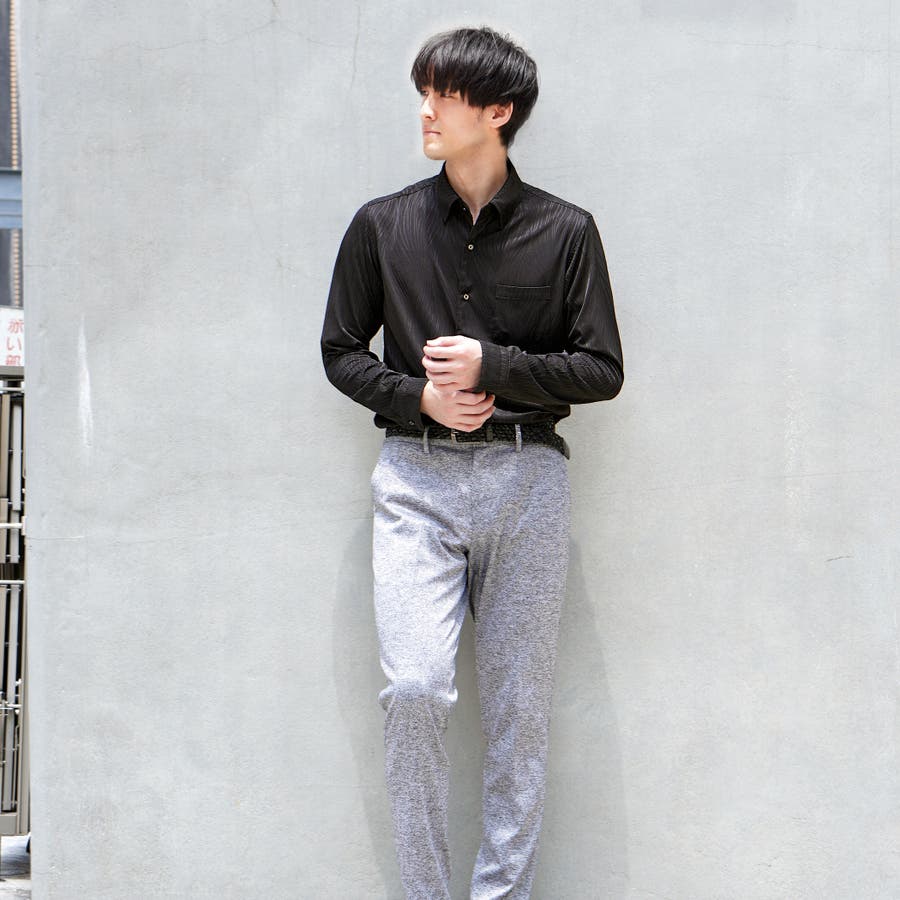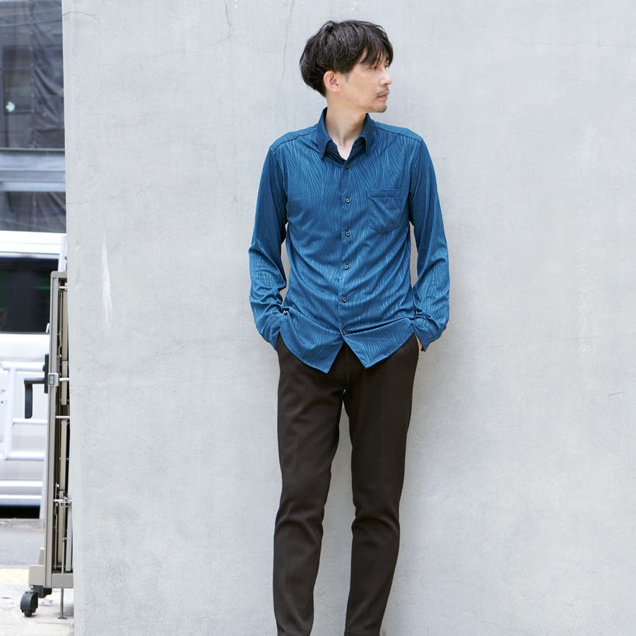 合繊特有の上品な光沢とカットソー素材ならではの、よく伸びるストレスフリーな着心地が特徴です。