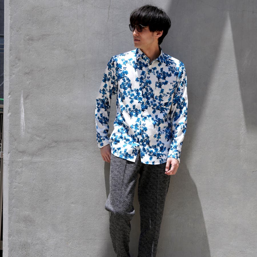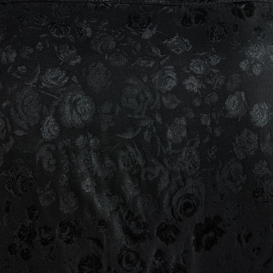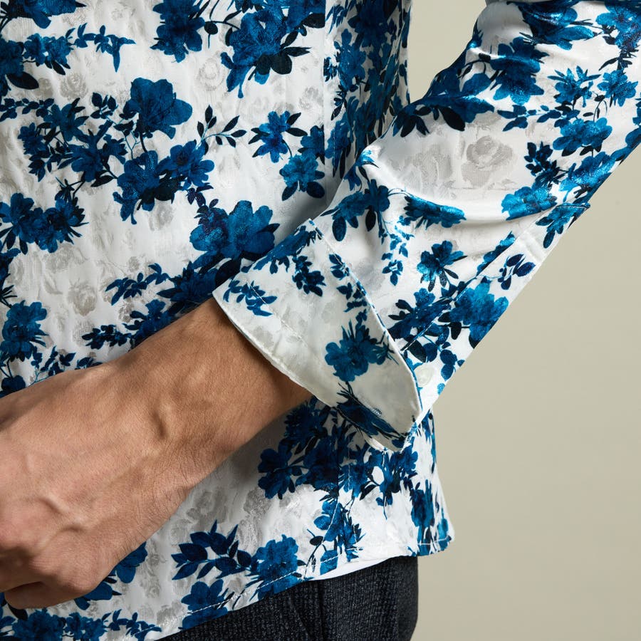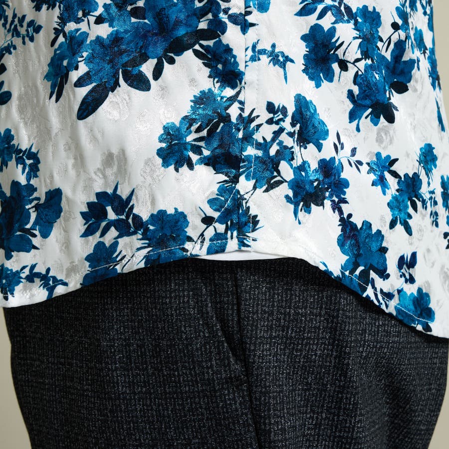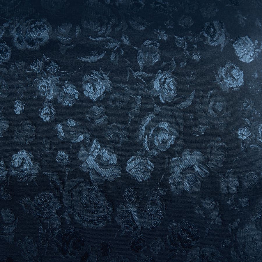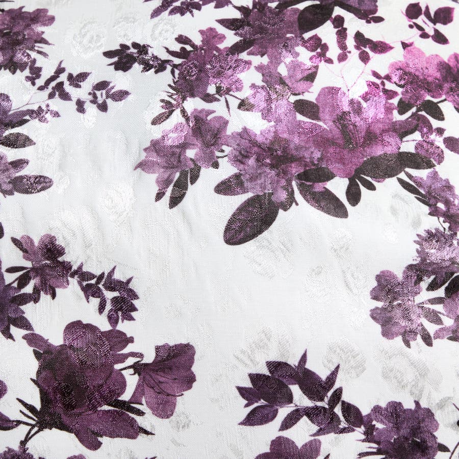 ポリエステル糸で織りあげた花柄のストレッチジャカード素材を使用。薄手で、ハリがあり、合繊素材特有の光沢が特長。光の当たり加減でチラチラと柄が見え隠れするのが魅力的な素材です。