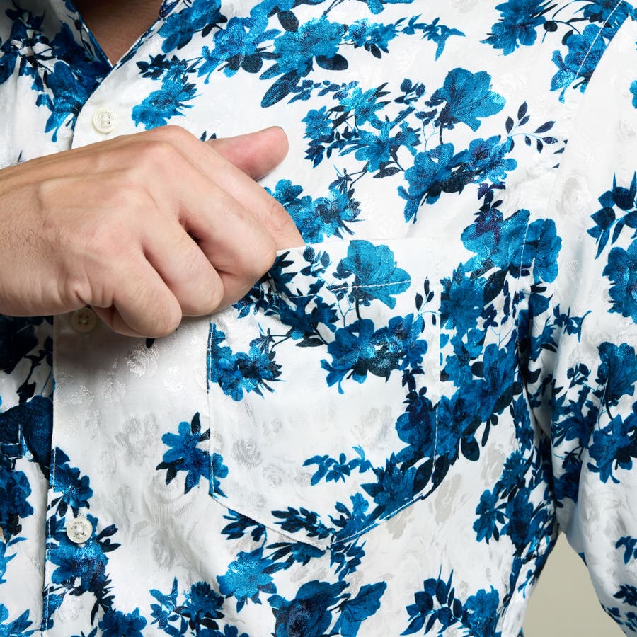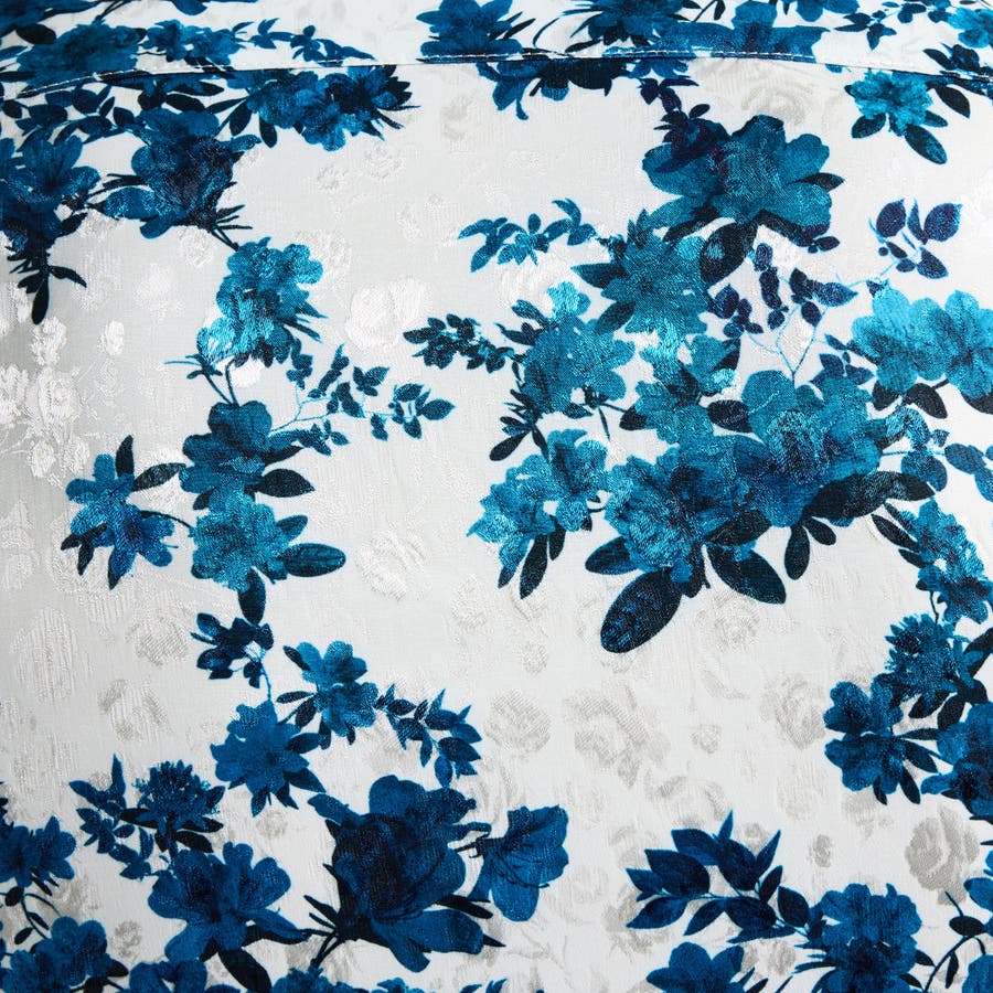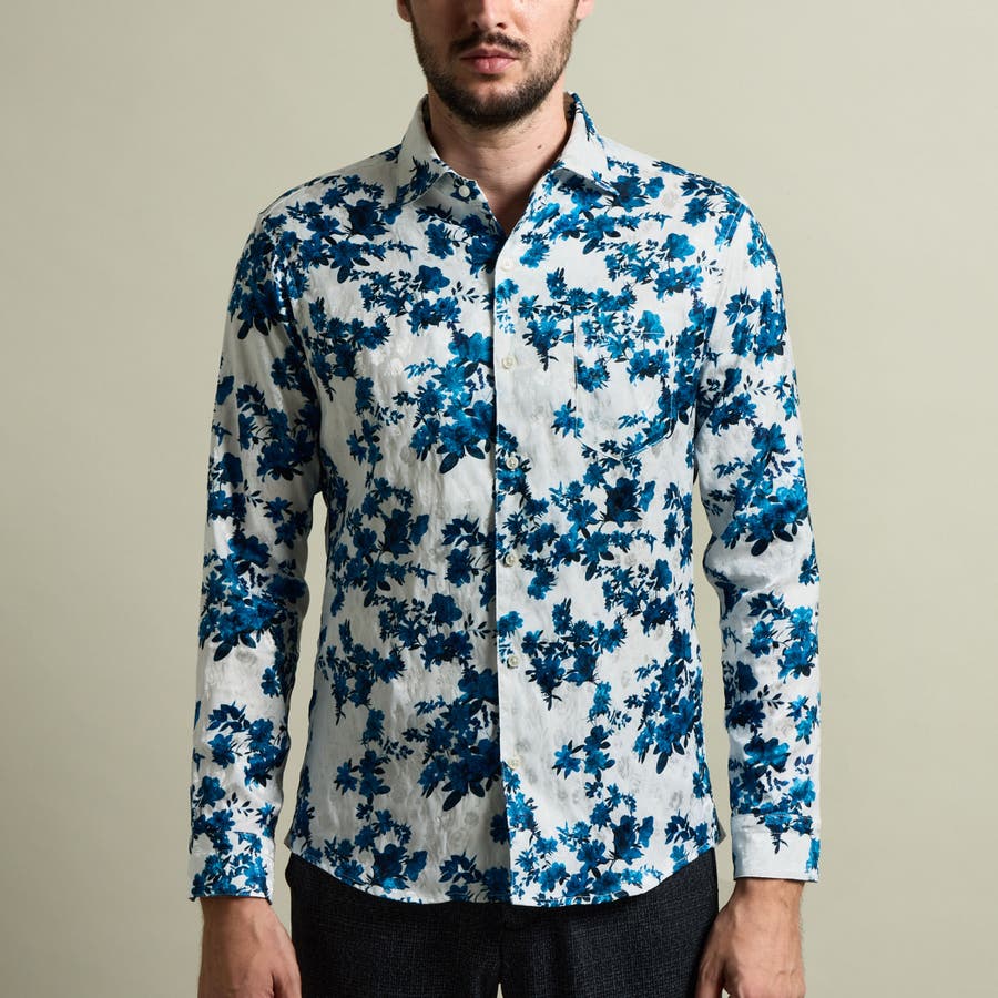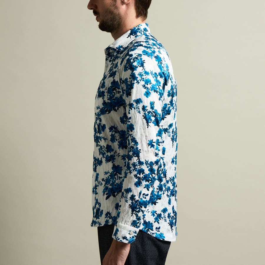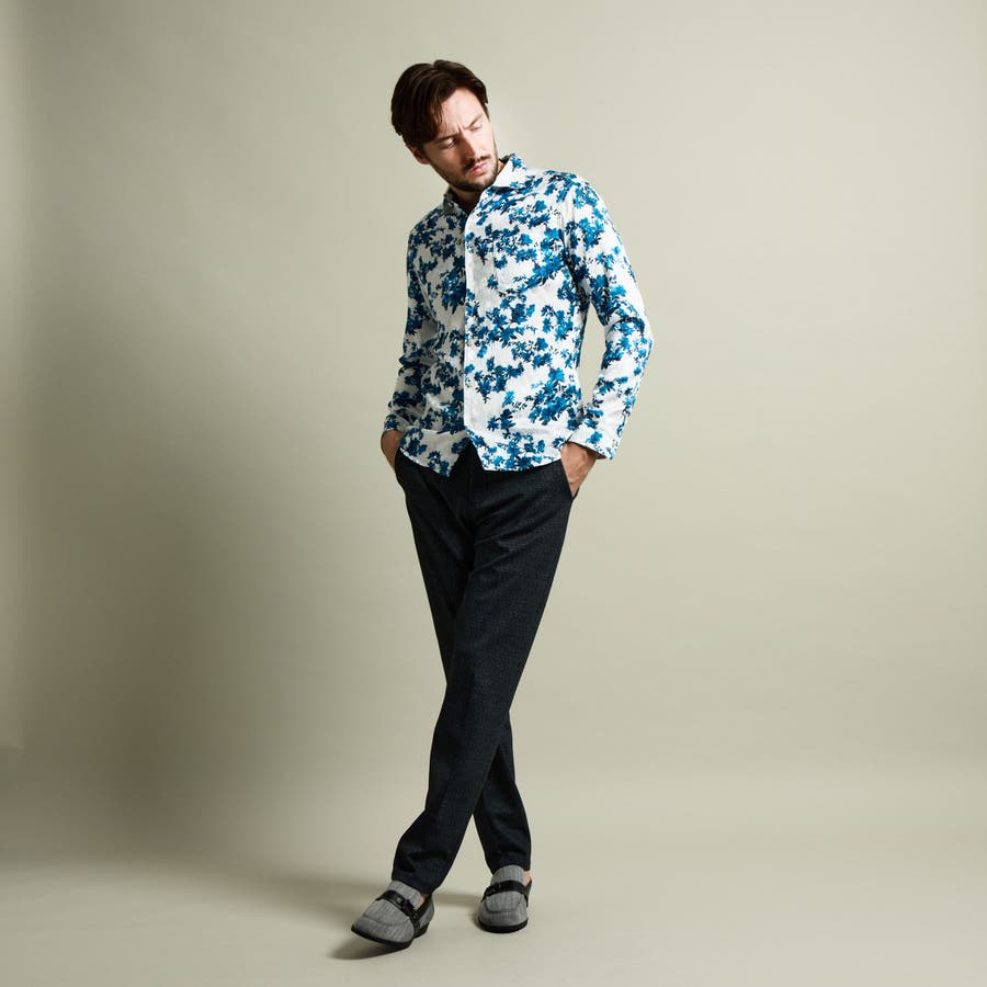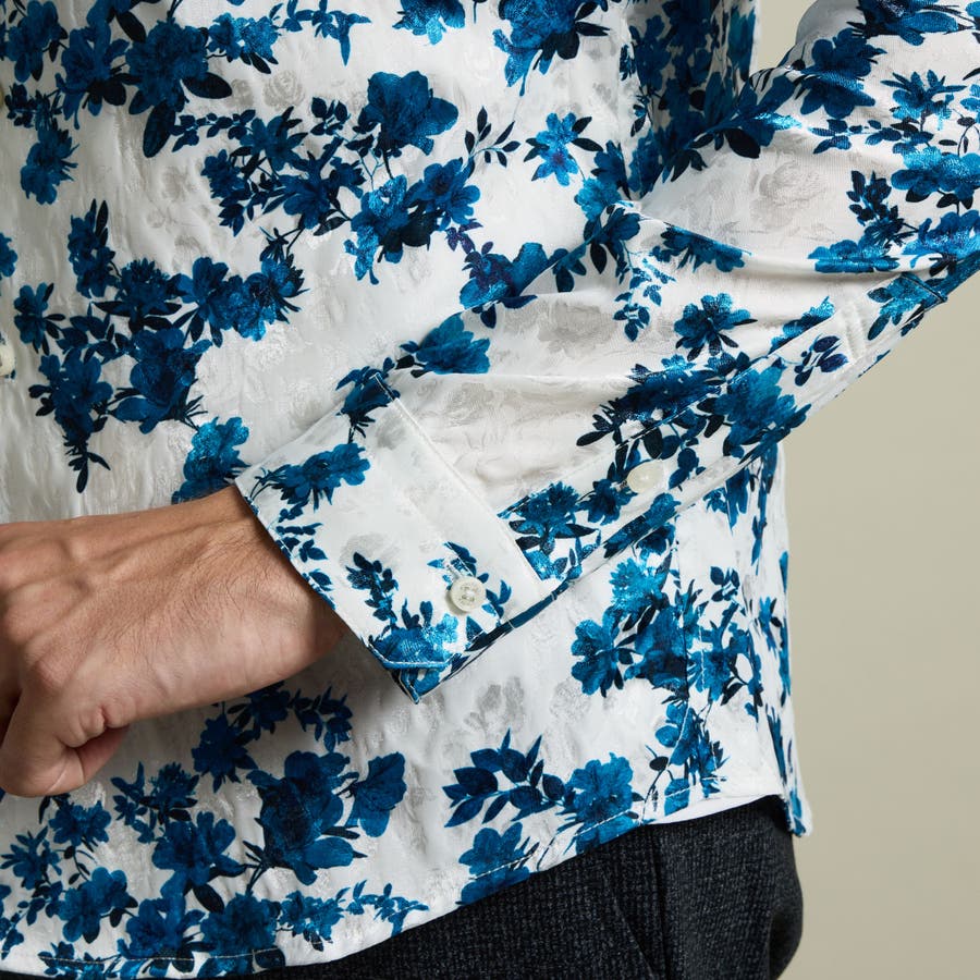 ポリエステル糸で織りあげた花柄のストレッチジャカード素材を使用。薄手で、ハリがあり、合繊素材特有の光沢が特長。光の当たり加減でチラチラと柄が見え隠れするのが魅力的な素材です。