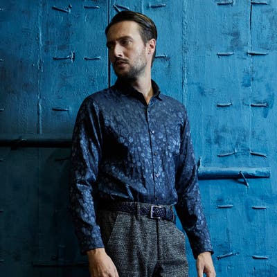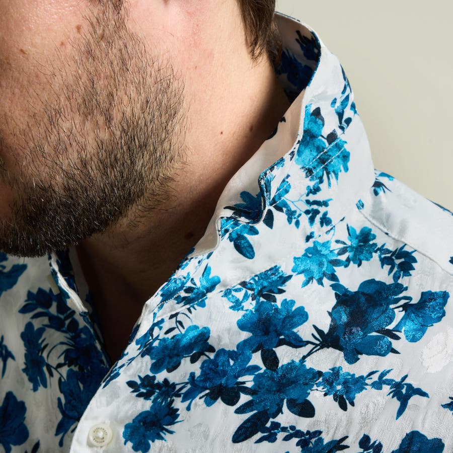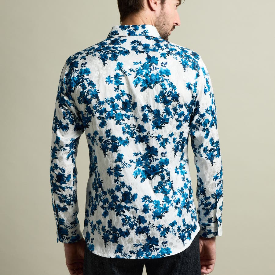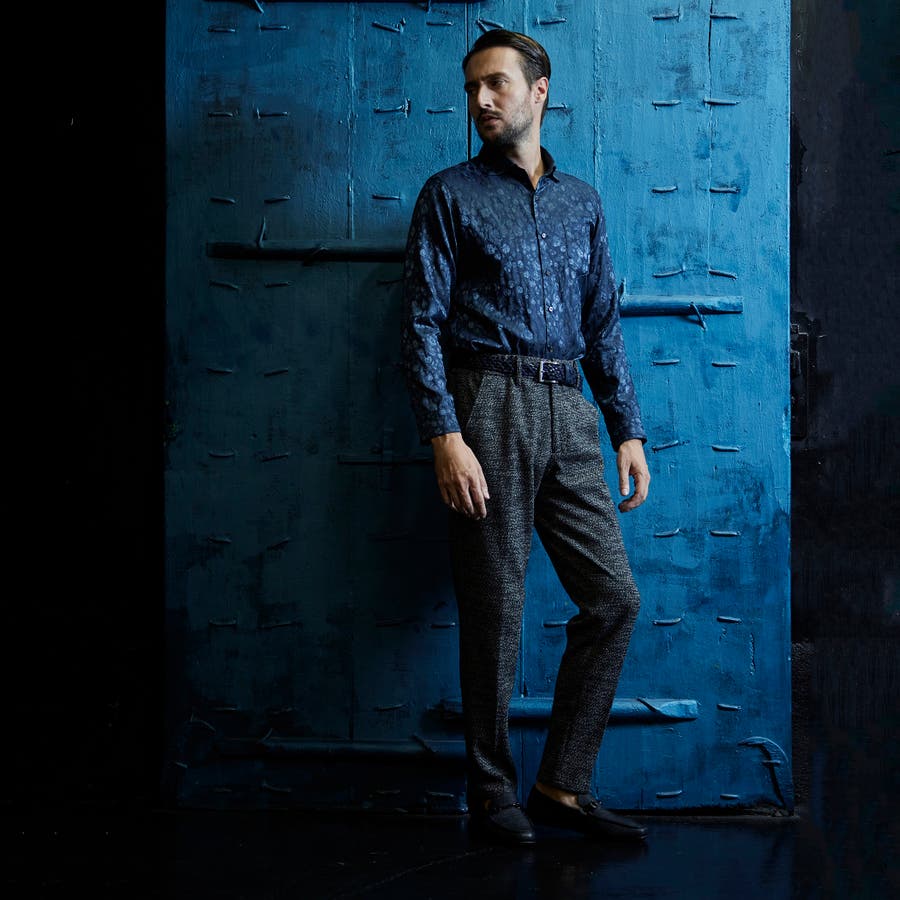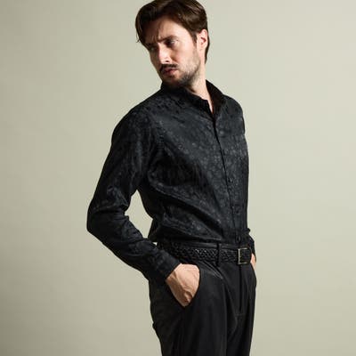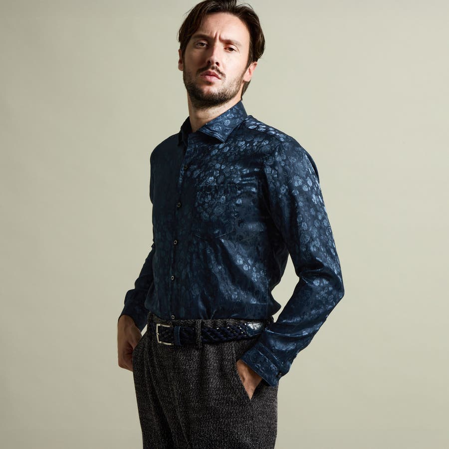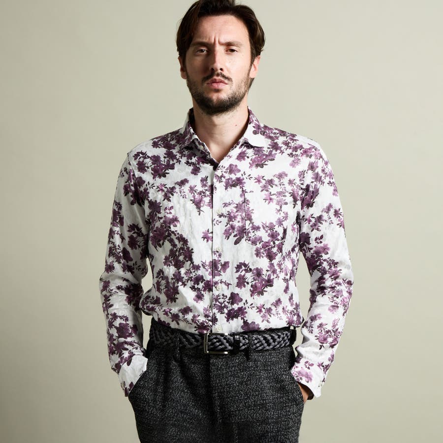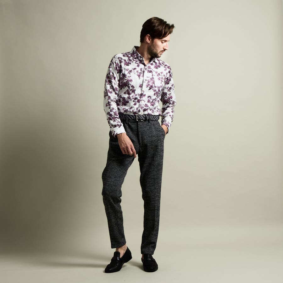 ポリエステル糸で織りあげた花柄のストレッチジャカード素材を使用。薄手で、ハリがあり、合繊素材特有の光沢が特長。光の当たり加減でチラチラと柄が見え隠れするのが魅力的な素材です。