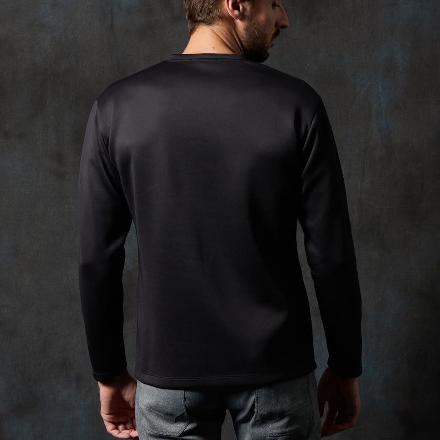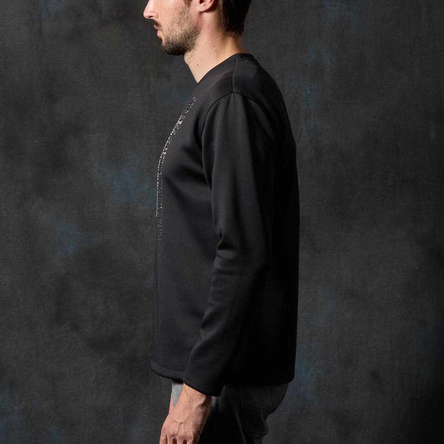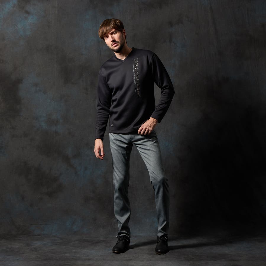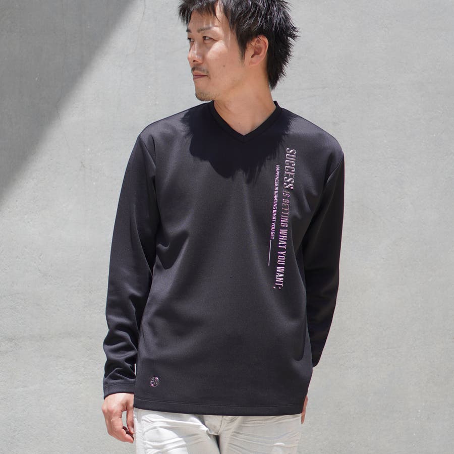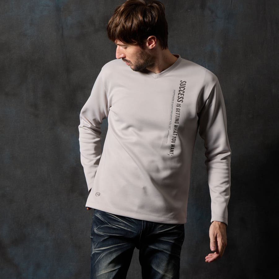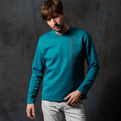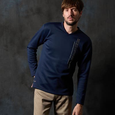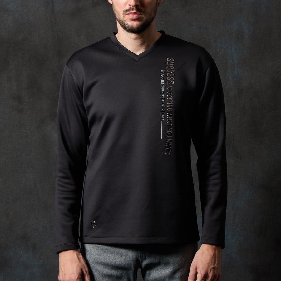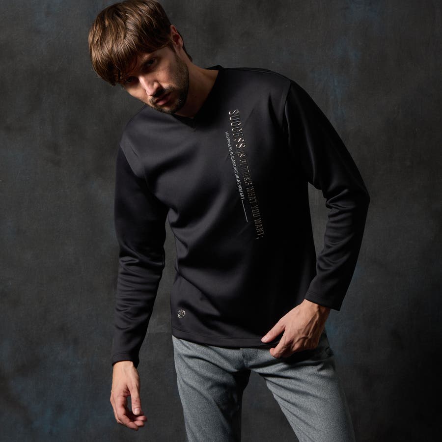 シャープな印象をあたえるメタルジェルプリントが特徴の浅Vネック長袖プルオーバーになります。