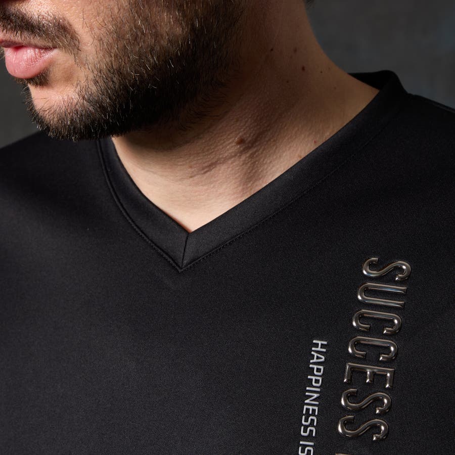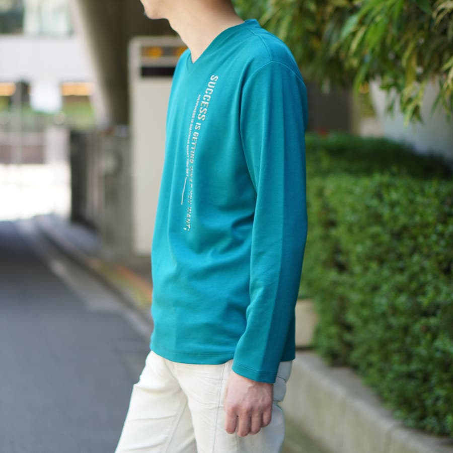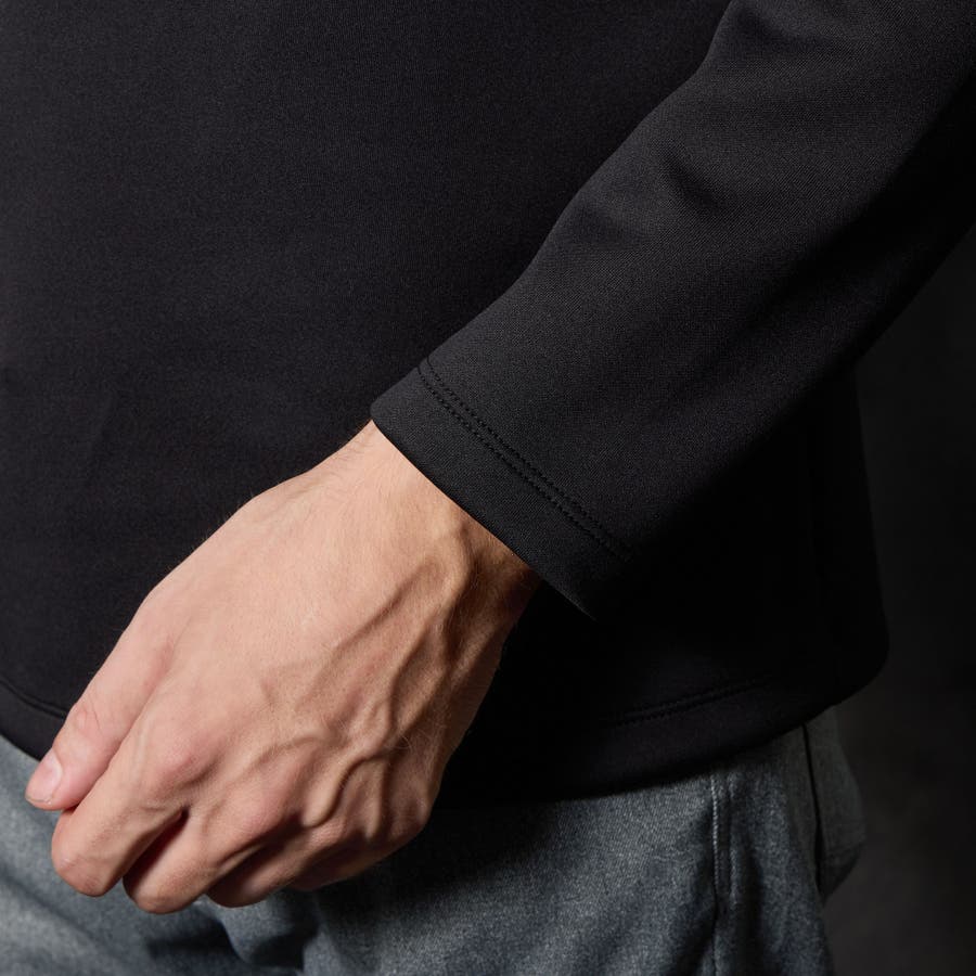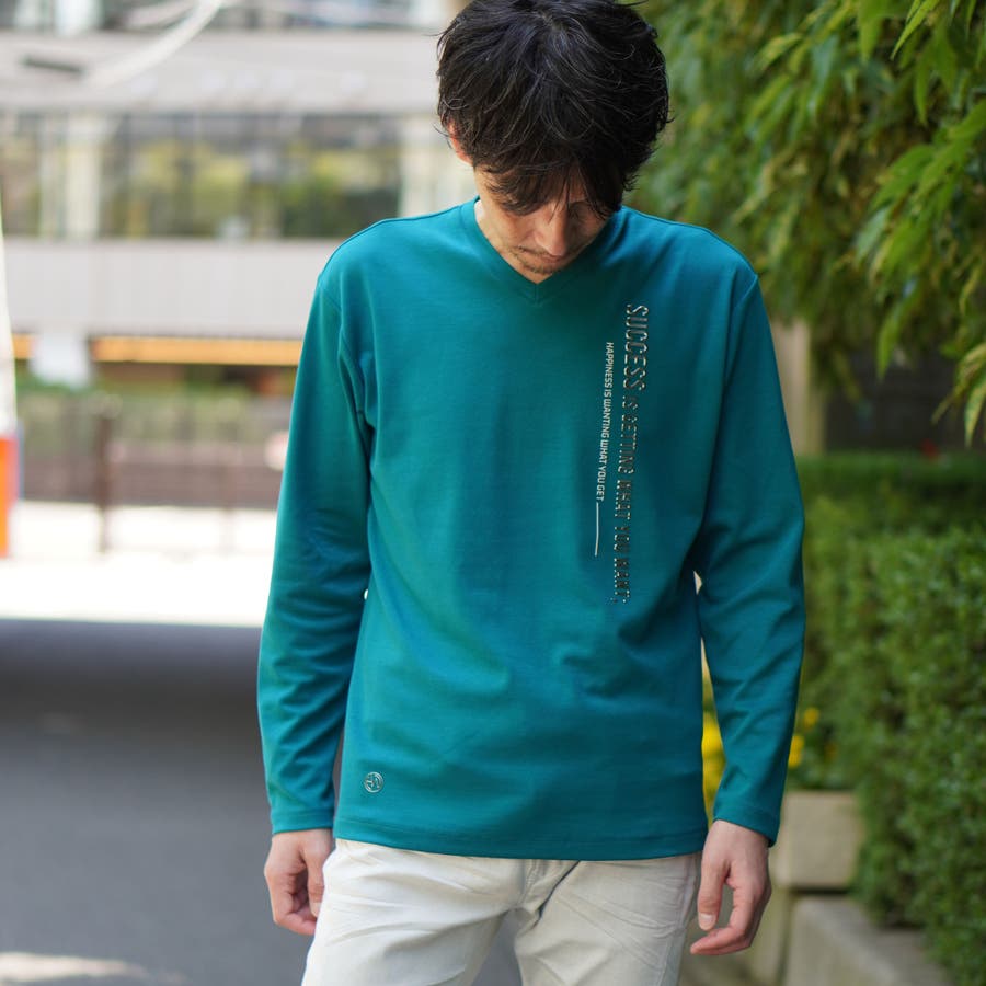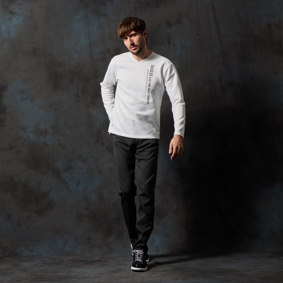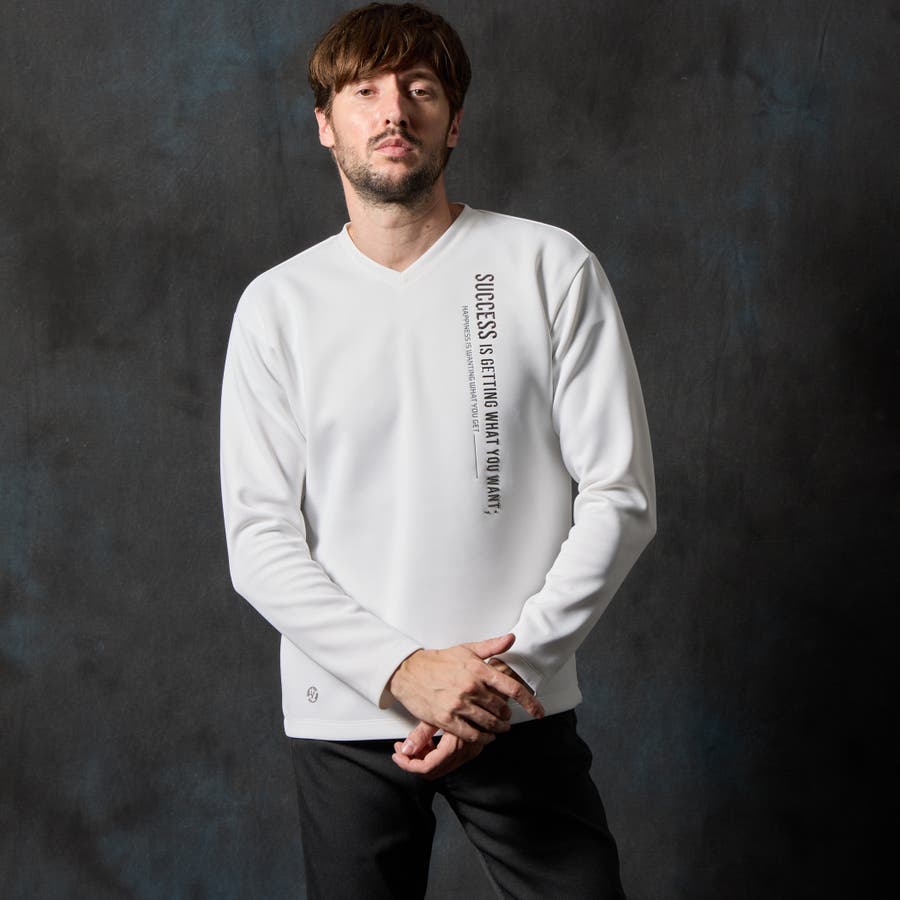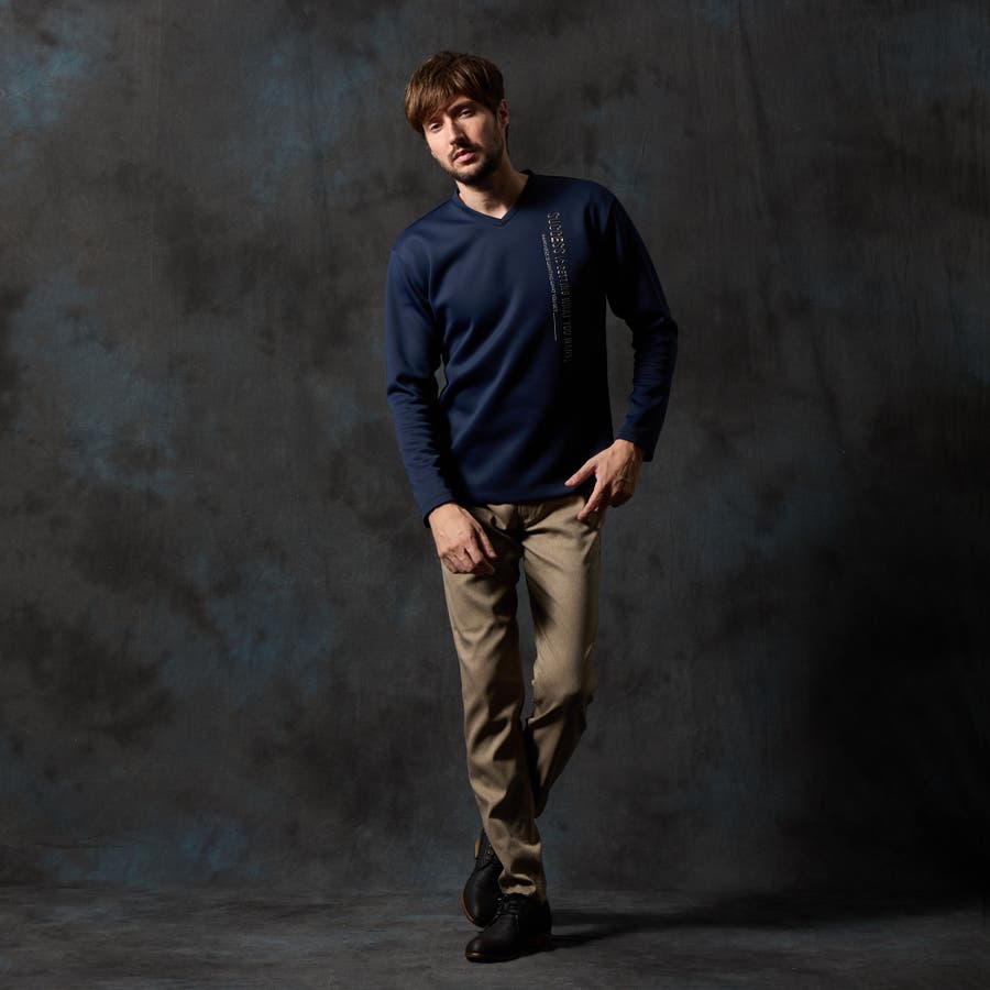 シャープな印象をあたえるメタルジェルプリントが特徴の浅Vネック長袖プルオーバーになります。