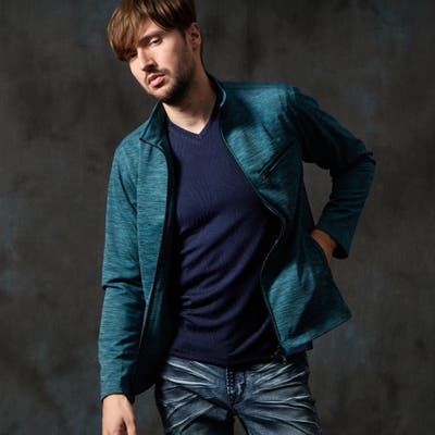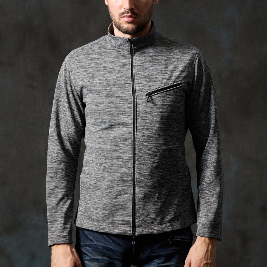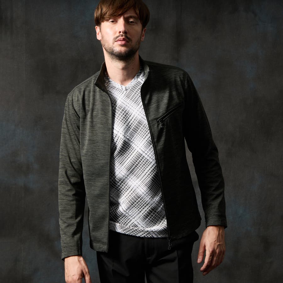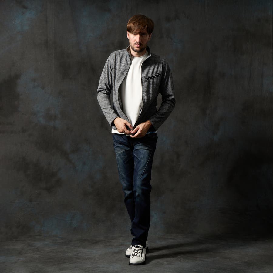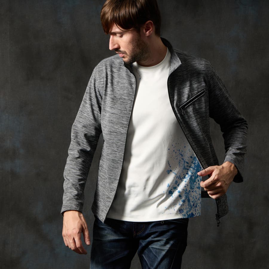 ハリコシのあるダブルフェイスジャカードのカットソー素材を使用することで伸縮性に優れた着心地の良い軽アウターに仕上げました。