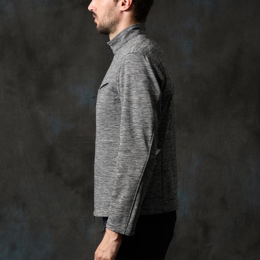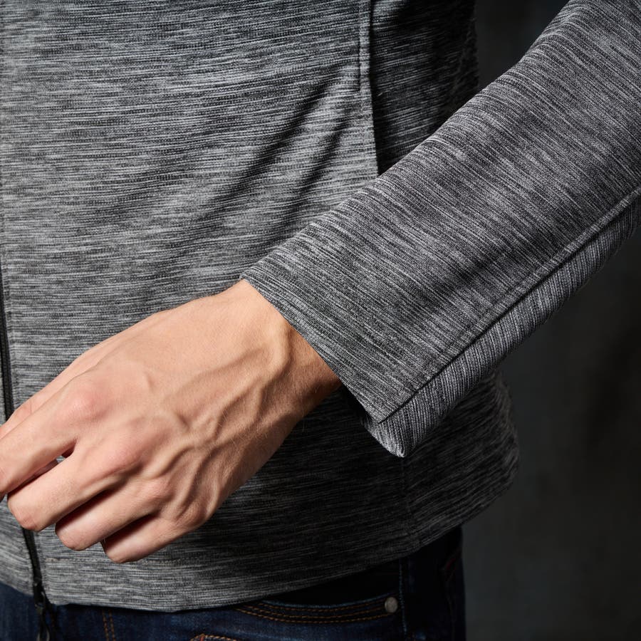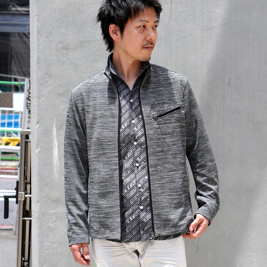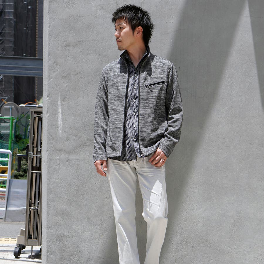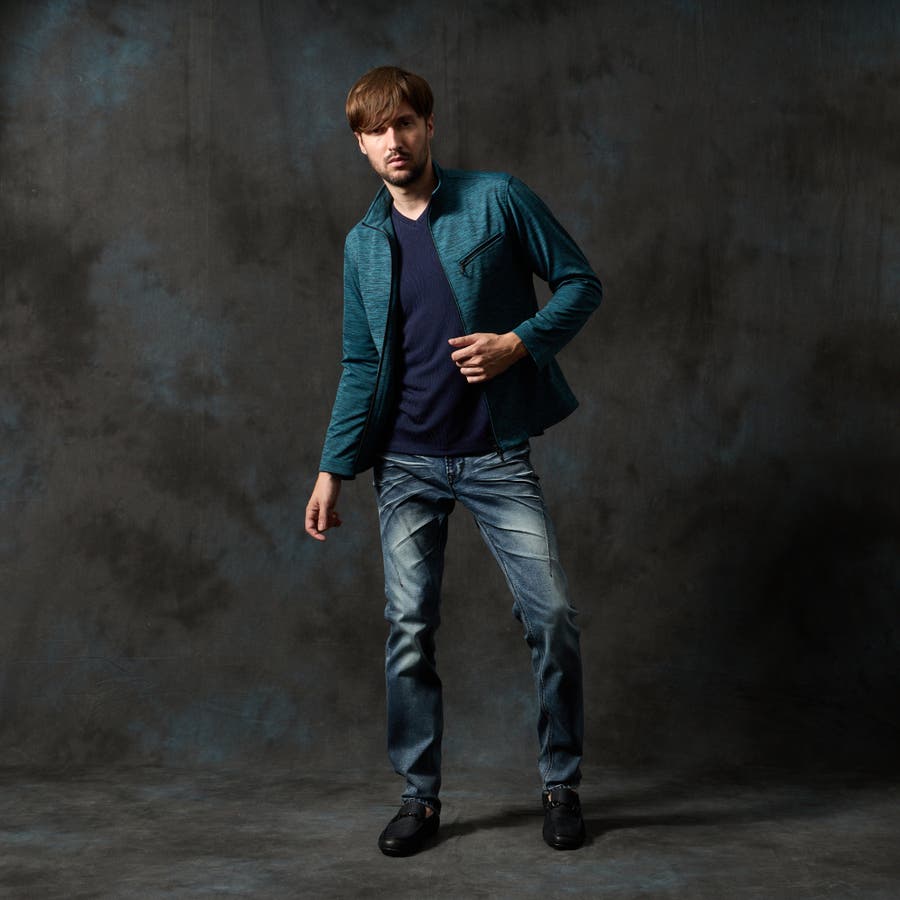 ハリコシのあるダブルフェイスジャカードのカットソー素材を使用することで伸縮性に優れた着心地の良い軽アウターに仕上げました。