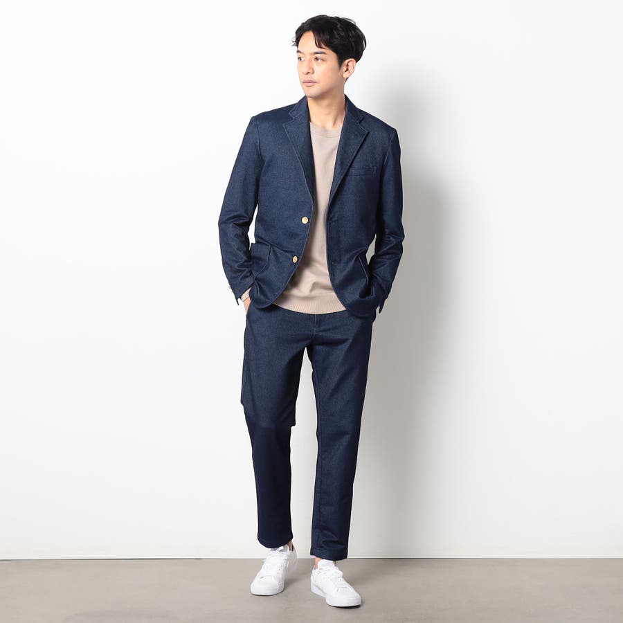 デニムの風合いを活かしてチノパンやTシャツでカジュアルにも仕上げられます。