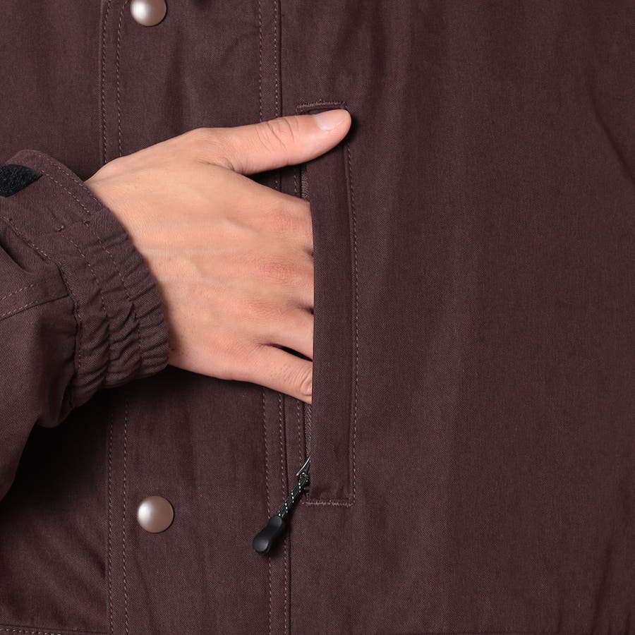 やや高めに設定されたスタンドカラーの裏側にはコーデュロイ素材を使用し、肌触りの良さと配色によるアクセントをプラス。裾にはドローコードを配し、シルエットを自由に調整可能。ポケットは合計5か所と機能性にも優れています。フロントはファスナーとボタンのダブル仕様で、防寒性とデザイン性の両立を実現。袖口もサイズ調整できるつくりになっています。