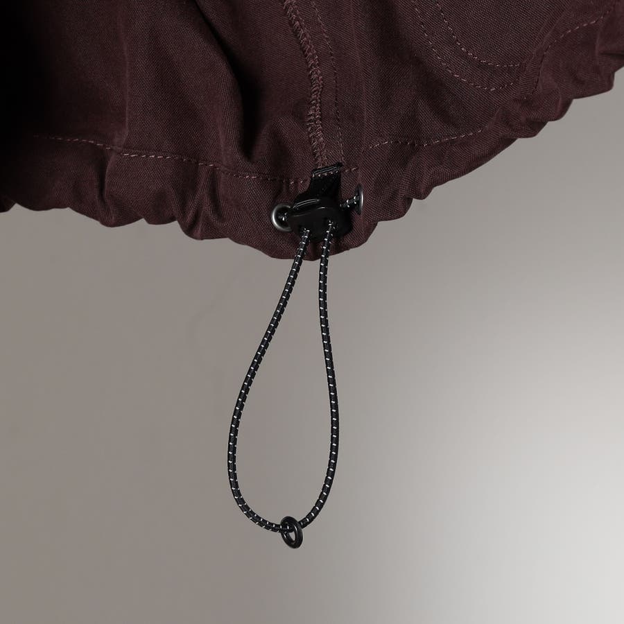 全体的にゆとりを持たせたリラックスシルエットで、アームホールも広めに設計。インナーにスウェットやニットを重ねても窮屈にならず、ストレスフリーな着心地です。裾のコードを絞れば、シルエットにメリハリをつけたスタイリングも楽しめます。
