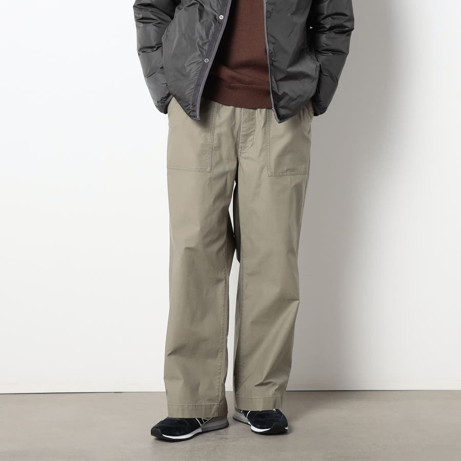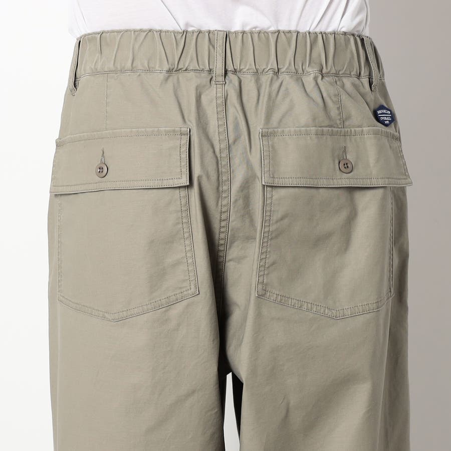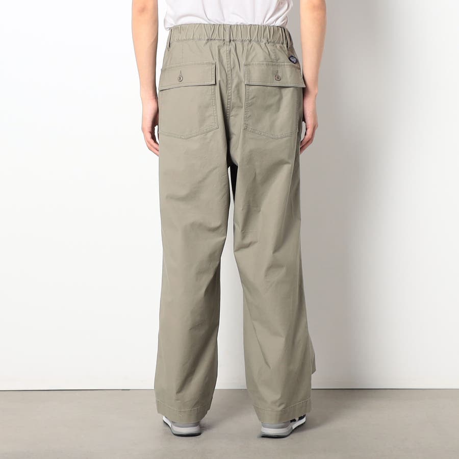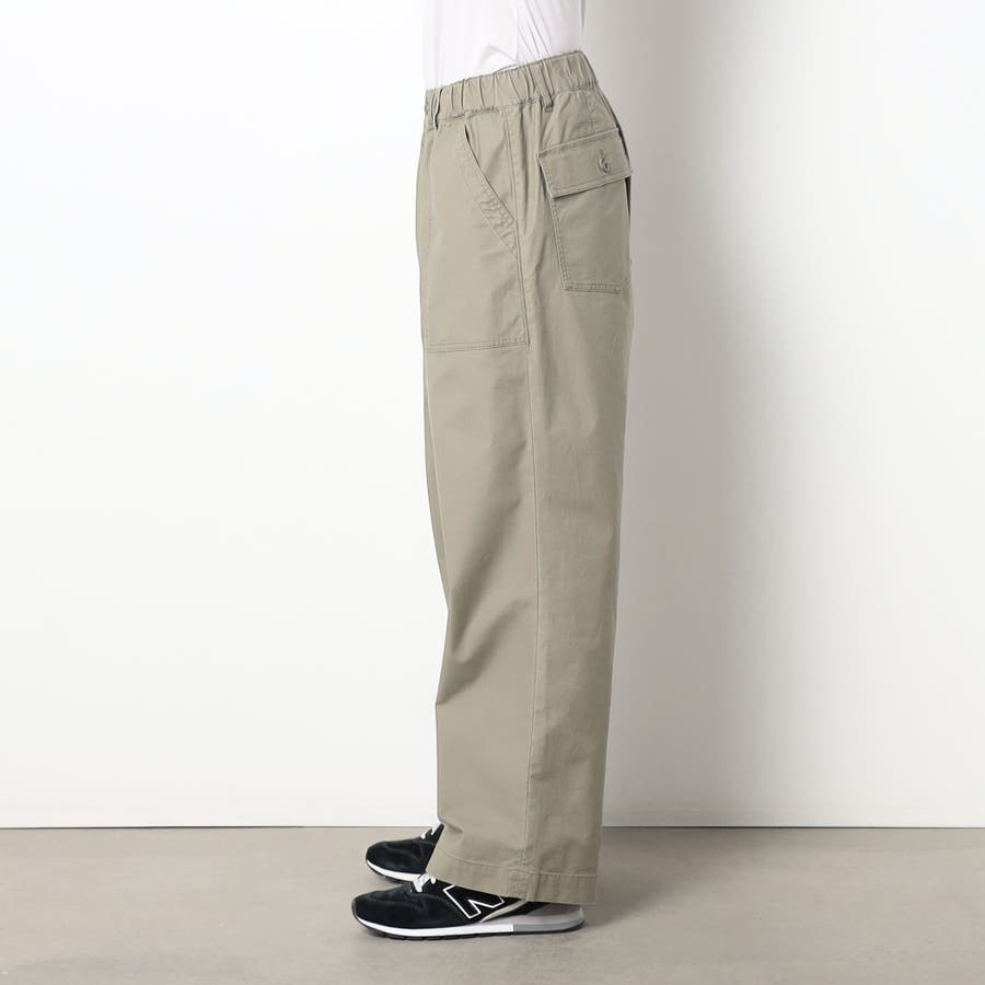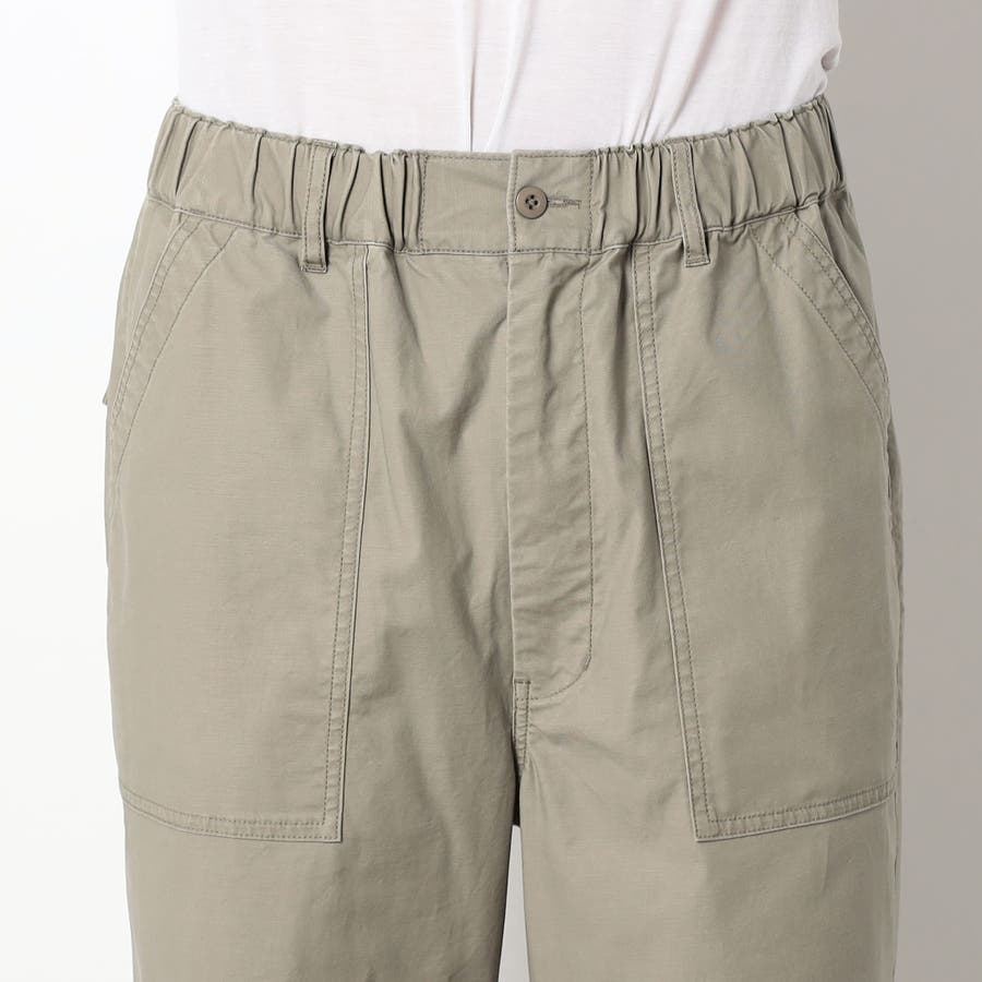 ベイカーパンツの特徴であるL字ポケットやバックのフラップポケットなど、王道のディテールを踏襲しつつ、ウエストにはゴム+ドローコードを採用し、リラックス感をプラス。