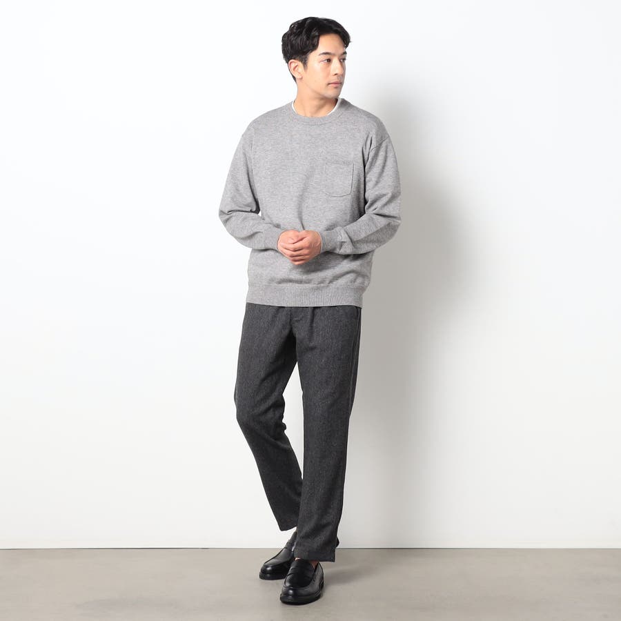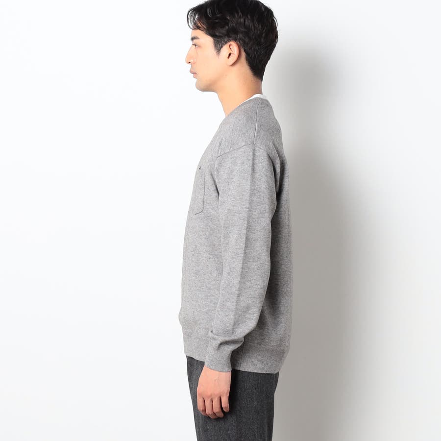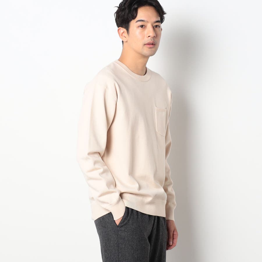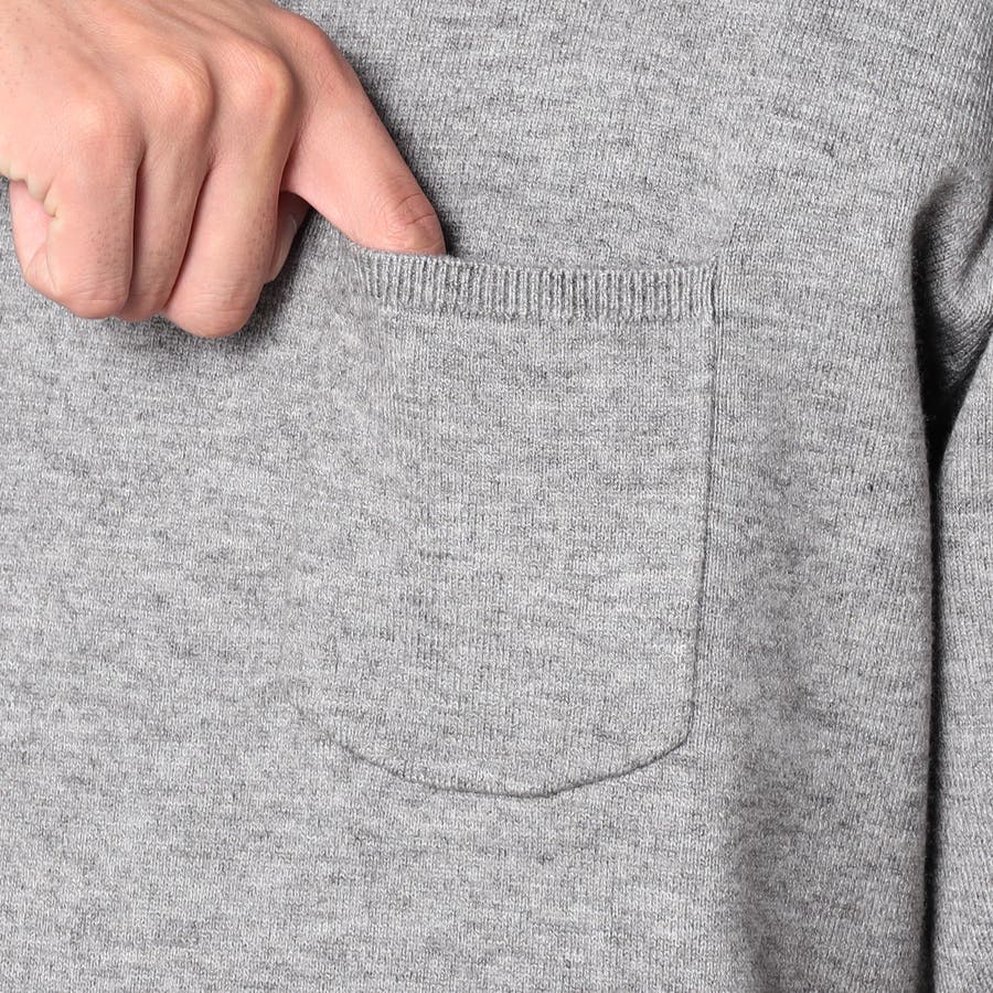 糸本来の柔らかさを活かしつつ、編み目をしっかりと詰めることでスウェットのようなハリとコシを実現。ニットでは珍しい胸ポケットをアクセントに取り入れ、実用性とデザイン性をプラス。さらに袖口と裾リブにはヘリンボン柄の編地を施し、さりげないディテールにこだわっています。
