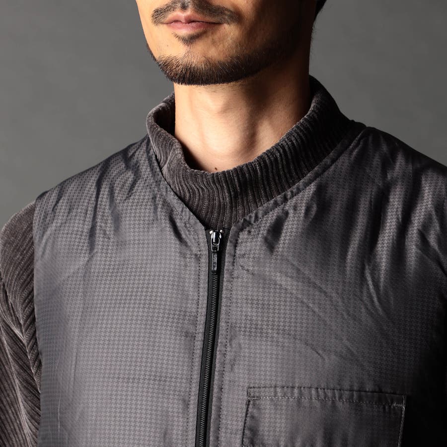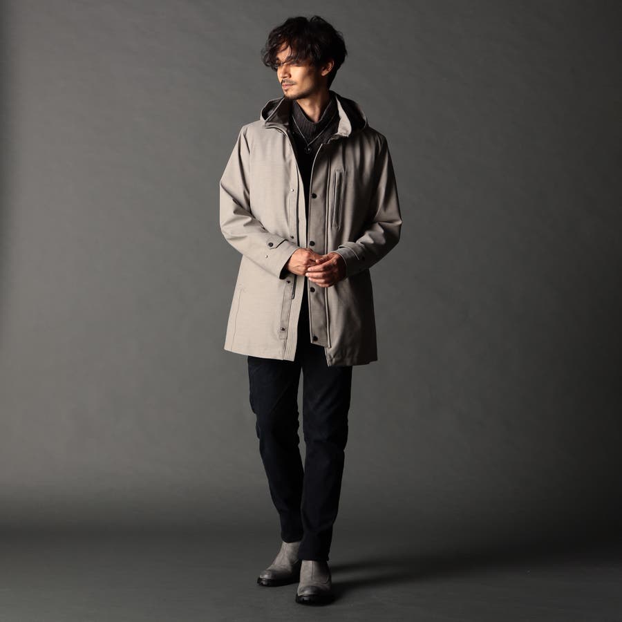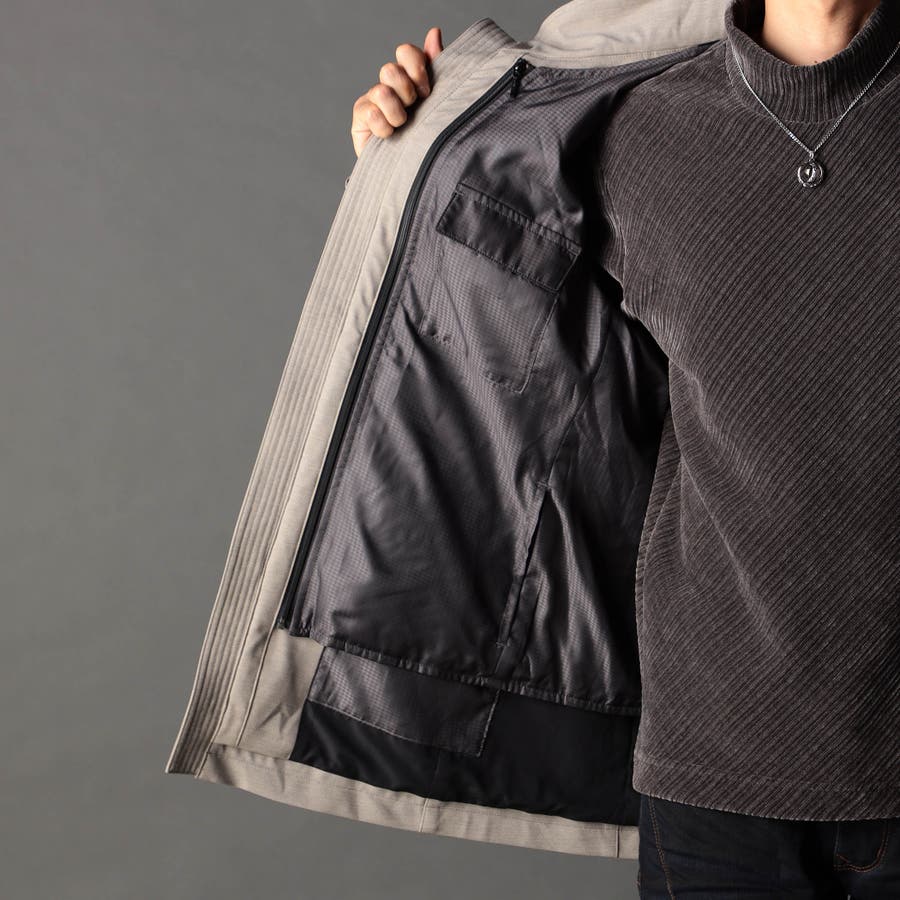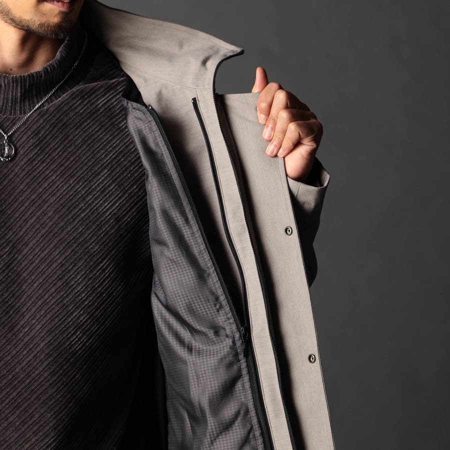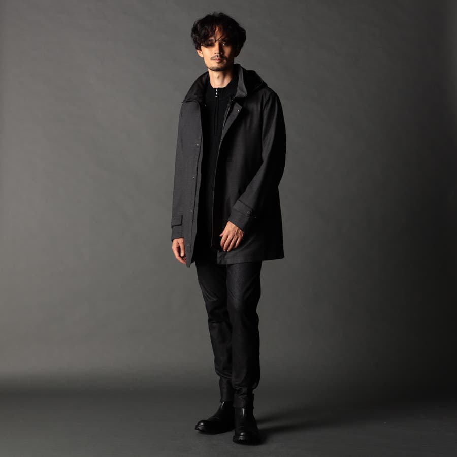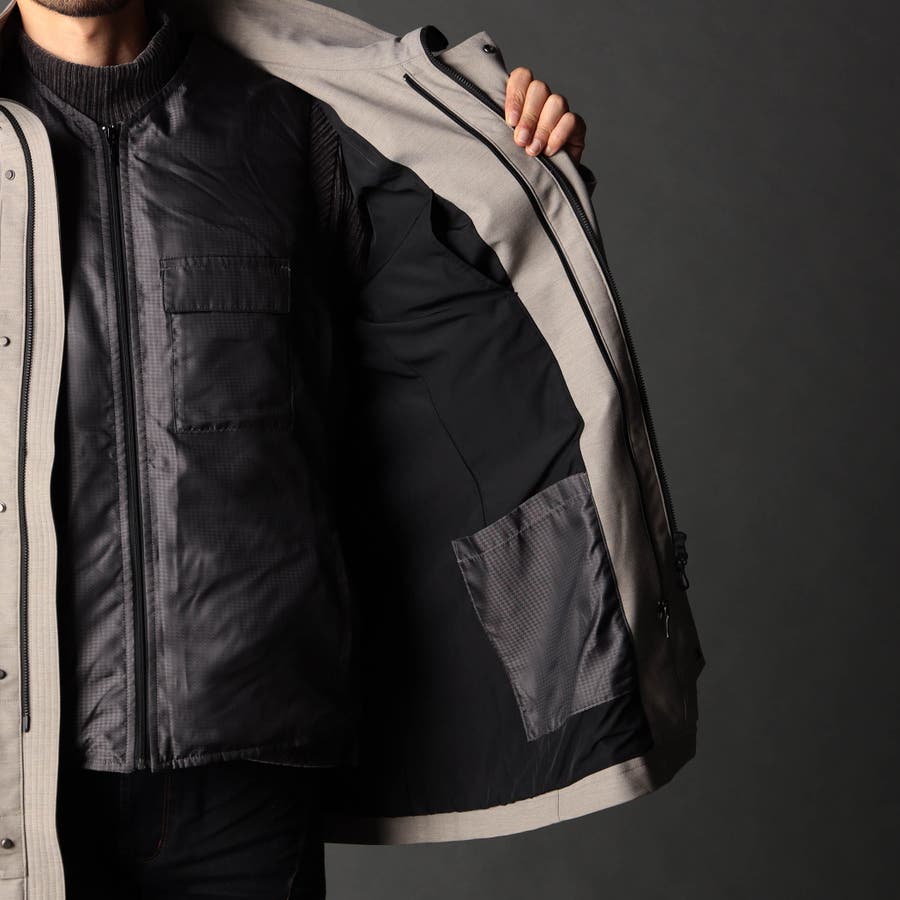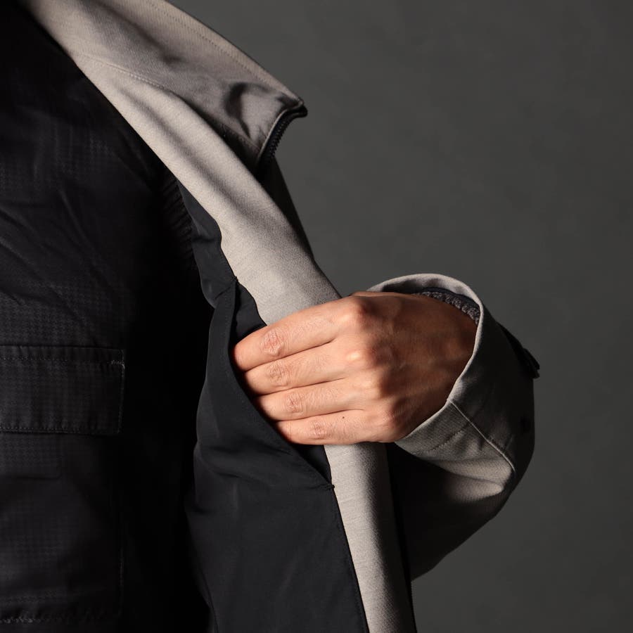 ベストライナー付きのスタンドコート。着脱可能なフード、衿端にはワイヤーを入れて遊べる様にし、釦止めしやすくしたフロントの持ち出し仕様に、着心地を高めたアクションプリーツ仕様、切り替えを入れた前振りのツイスト3枚袖は動きやすくてシルエットも綺麗、シンプルだけどこだわりをしっかり入れて作っています。裏地は千鳥柄のジャカード裏地と、保温効果の高い機能裏地を使い分けています。機能中わたを採用したベストライナーはひっくり返して単体でも着用出来ます。中わたはシートタイプを採用する事で型崩れを防ぎ、ライナーの裏地にも蓄熱保温効果の高い裏地を使っています。