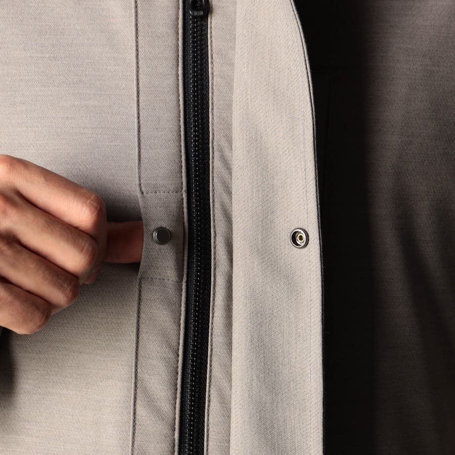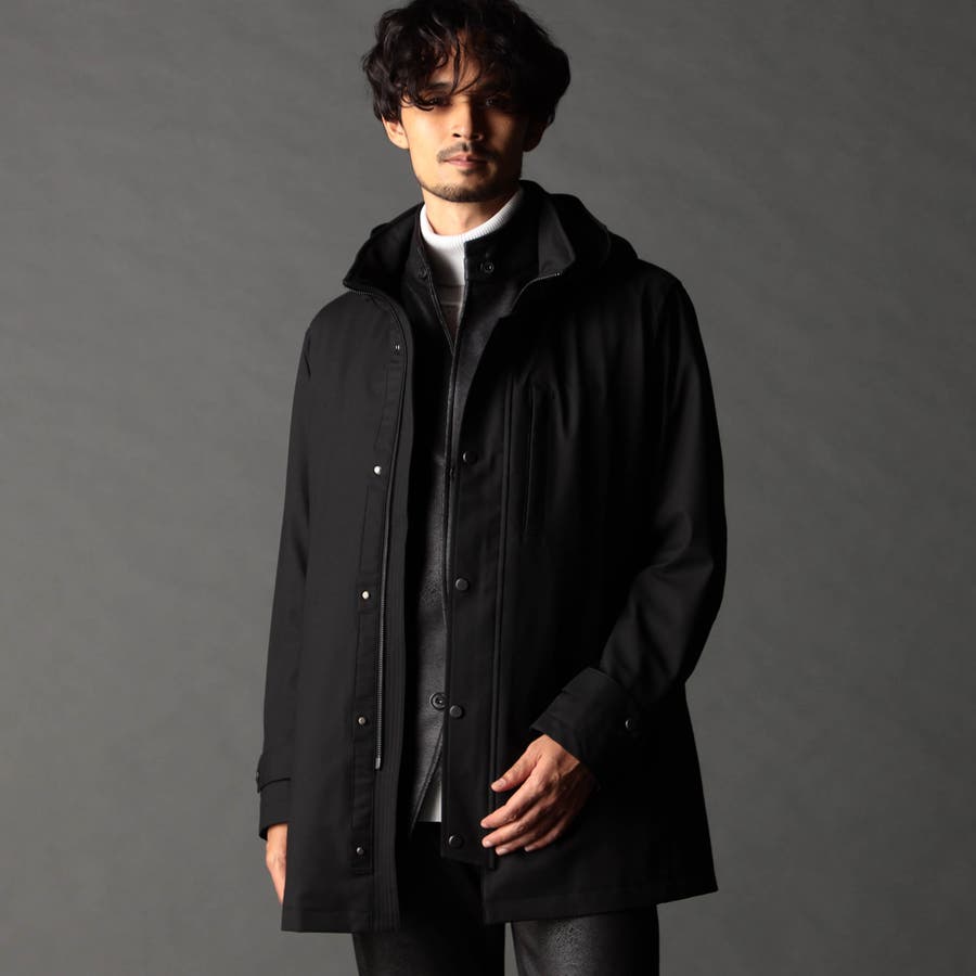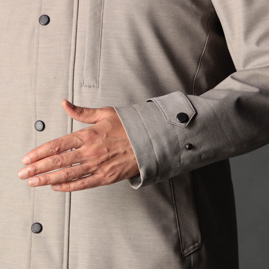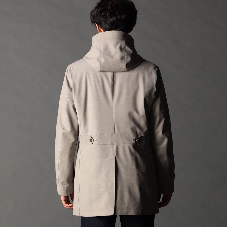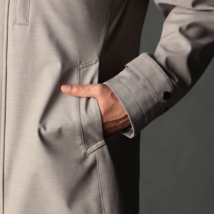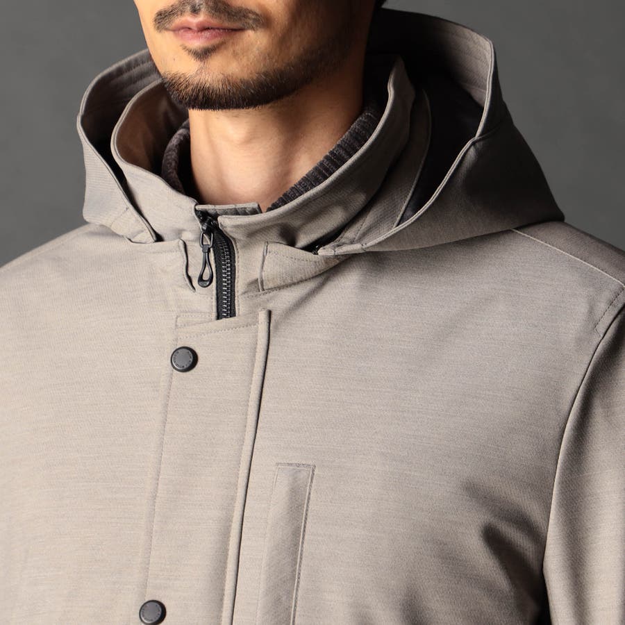 ベストライナー付きのスタンドコート。着脱可能なフード、衿端にはワイヤーを入れて遊べる様にし、釦止めしやすくしたフロントの持ち出し仕様に、着心地を高めたアクションプリーツ仕様、切り替えを入れた前振りのツイスト3枚袖は動きやすくてシルエットも綺麗、シンプルだけどこだわりをしっかり入れて作っています。裏地は千鳥柄のジャカード裏地と、保温効果の高い機能裏地を使い分けています。機能中わたを採用したベストライナーはひっくり返して単体でも着用出来ます。中わたはシートタイプを採用する事で型崩れを防ぎ、ライナーの裏地にも蓄熱保温効果の高い裏地を使っています。