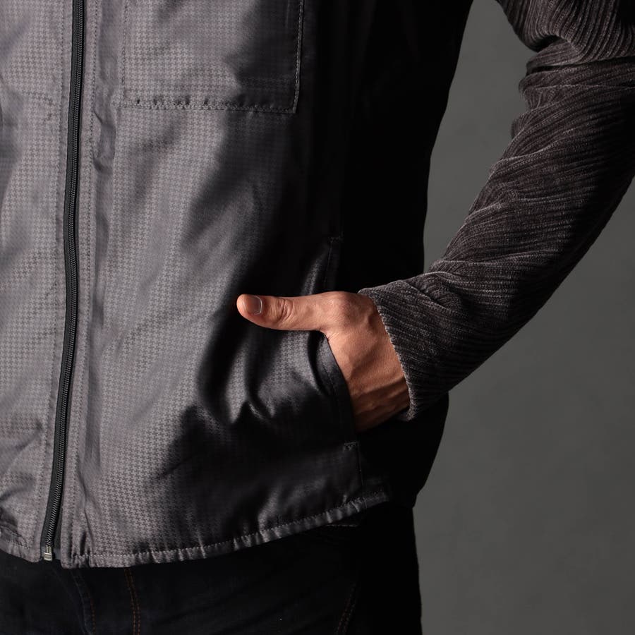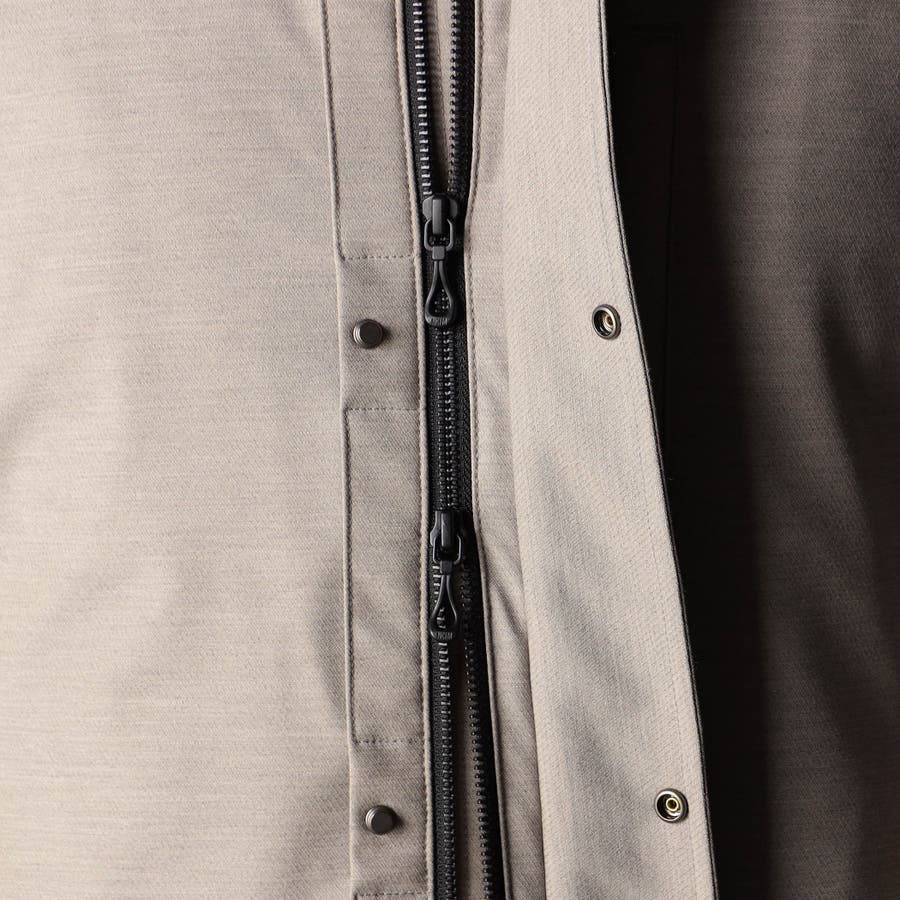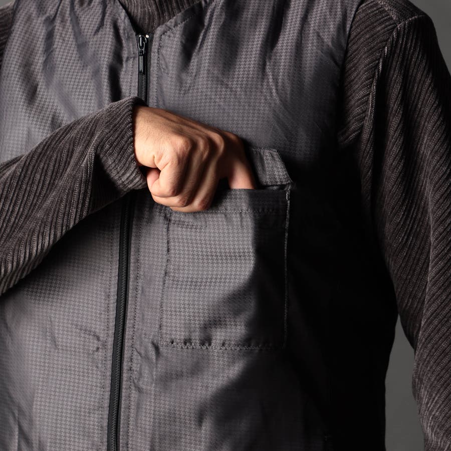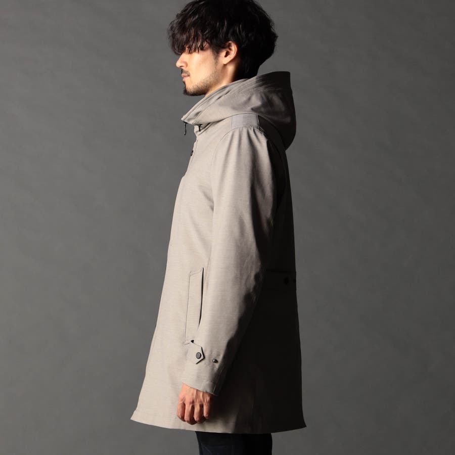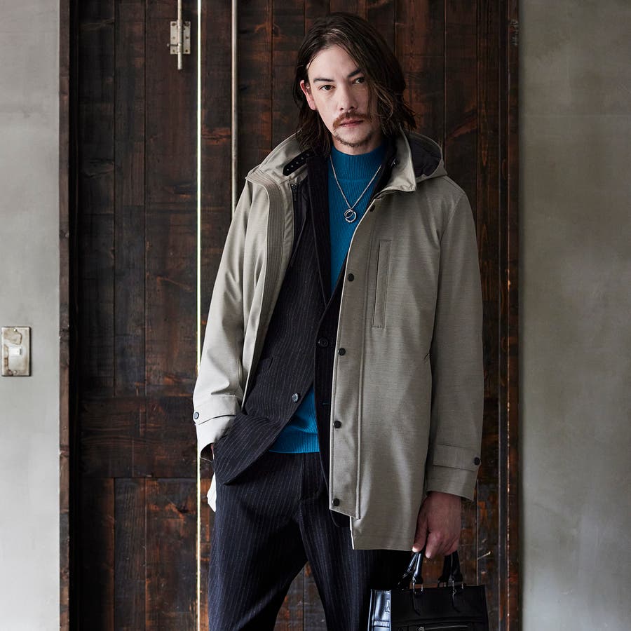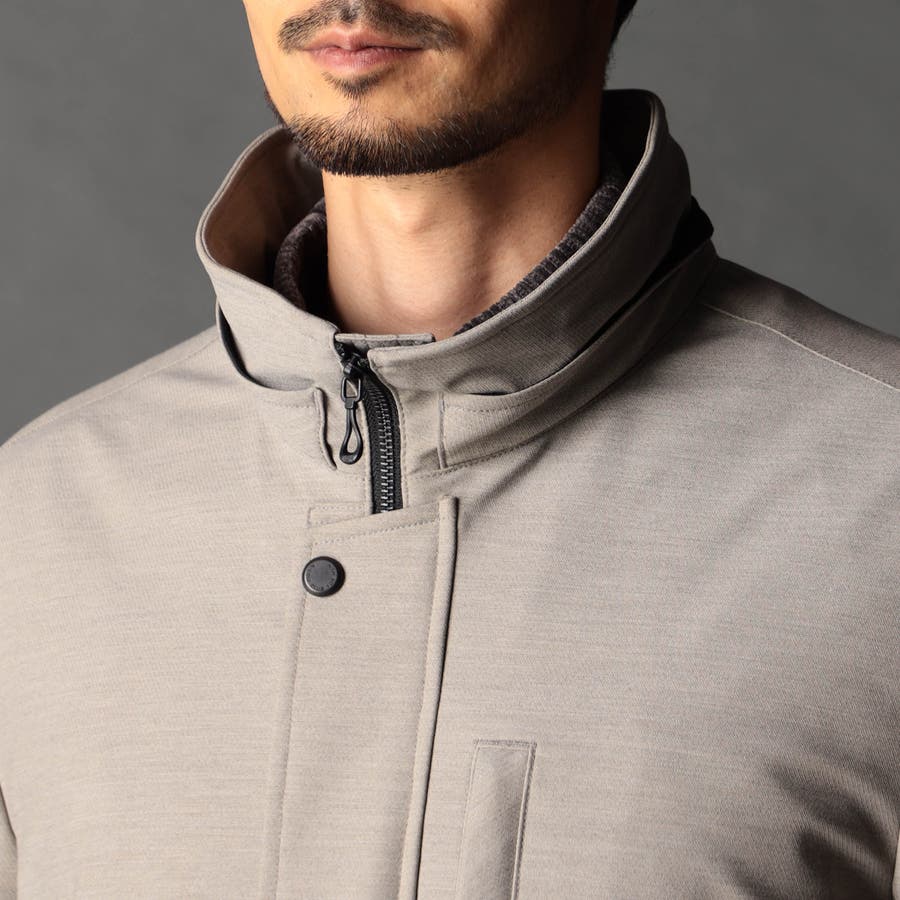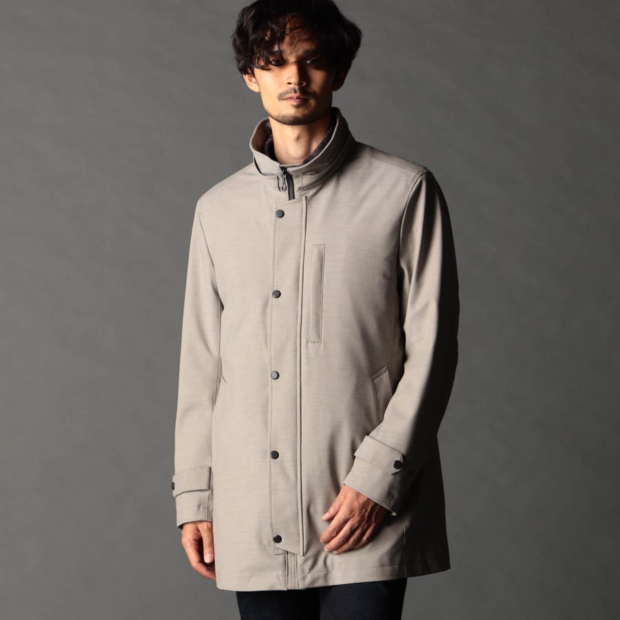 ベストライナー付きのスタンドコート。着脱可能なフード、衿端にはワイヤーを入れて遊べる様にし、釦止めしやすくしたフロントの持ち出し仕様に、着心地を高めたアクションプリーツ仕様、切り替えを入れた前振りのツイスト3枚袖は動きやすくてシルエットも綺麗、シンプルだけどこだわりをしっかり入れて作っています。裏地は千鳥柄のジャカード裏地と、保温効果の高い機能裏地を使い分けています。機能中わたを採用したベストライナーはひっくり返して単体でも着用出来ます。中わたはシートタイプを採用する事で型崩れを防ぎ、ライナーの裏地にも蓄熱保温効果の高い裏地を使っています。