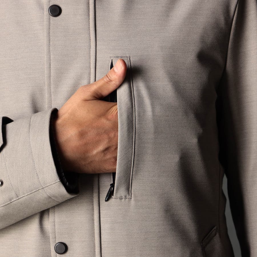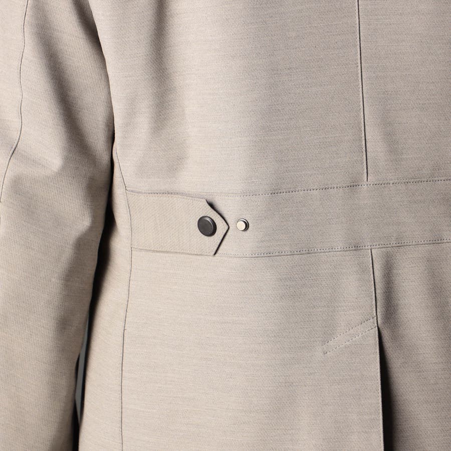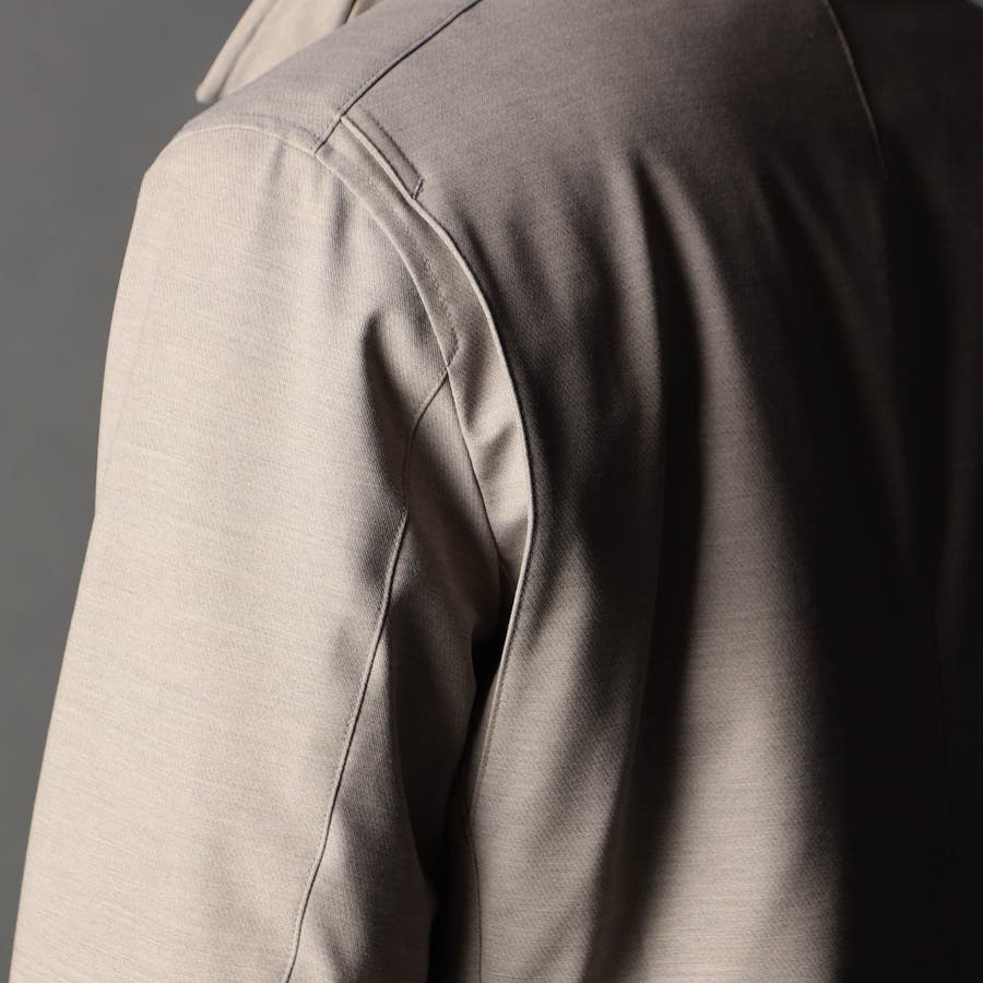 ウールライクな見え方とサラッとした風合いが特徴のメランジ調ストレッチツイル素材の裏面に、ポリウレタンのラミネートシートを貼りつけて防風効果を高めました。レーヨン混の適度な光沢感は上品な風合いをかもし出し、薄くて軽いストレッチ素材にラミネート加工を施す事で機能性と適度なハリ感が出ることで、服が立体的かつ軽く仕上がっています。