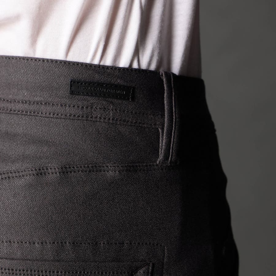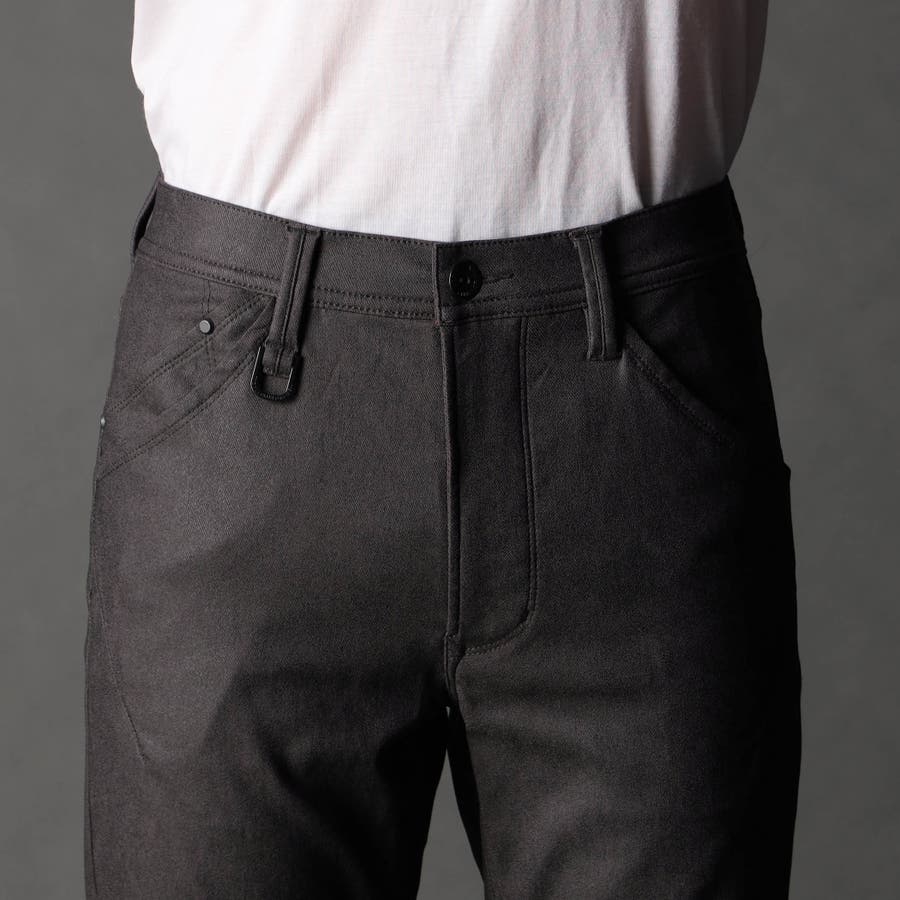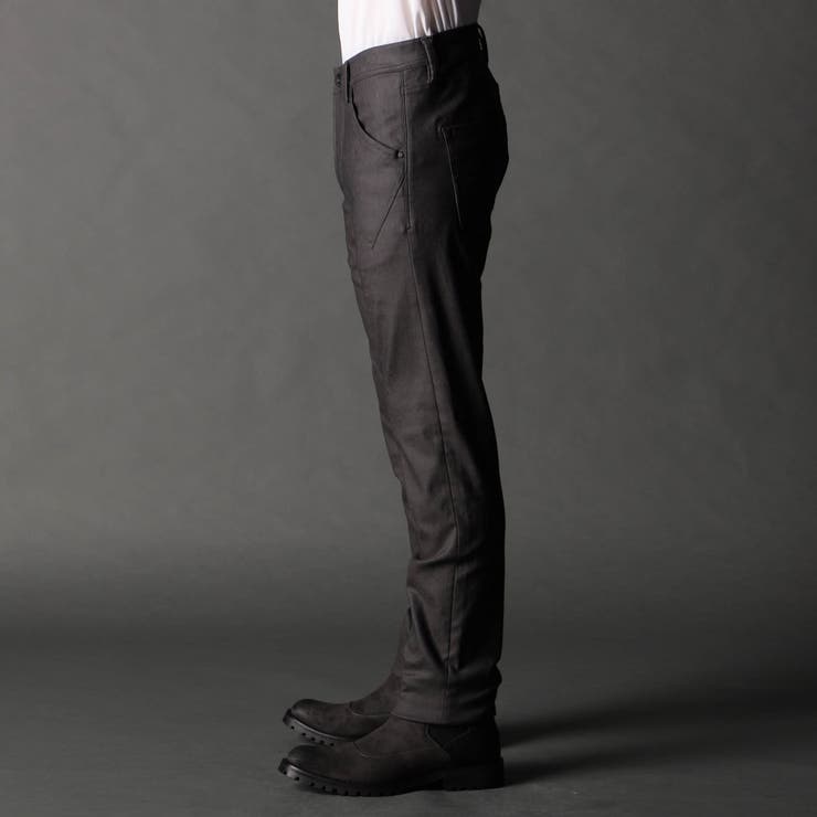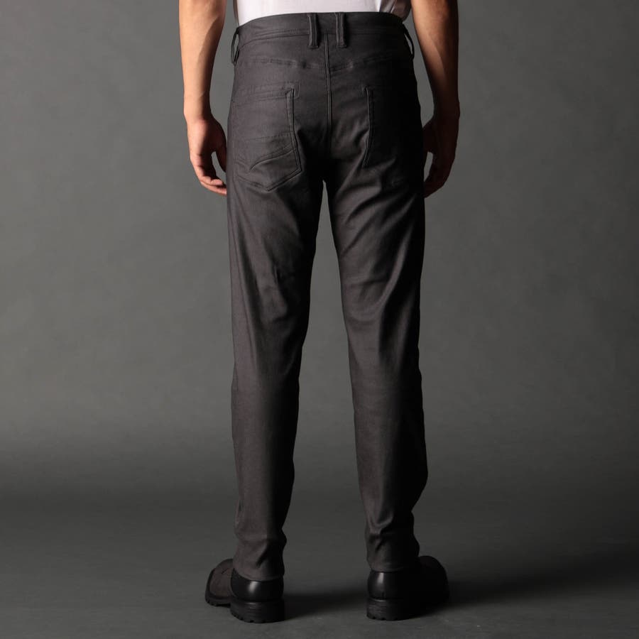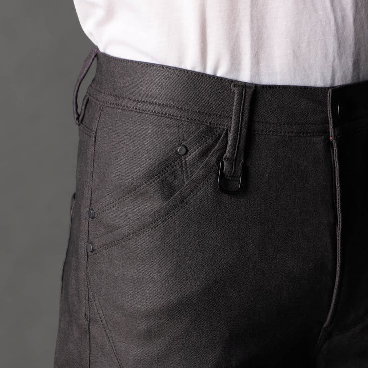 アクセントに前ポケット脇から膝に向けてダーツを入れたデザイン5ポケットパンツ。素材のストレッチ性にあわせてウエストベルトも伸びる様に縫製、別布もストレッチ裏地を使用していますので穿き着心地も抜群です。革ネームやオリジナルのボタン、Dカンを使用、腰裏の刺繍や後パッチポケットのオリジナル切り替えデザインを特徴にしています。裏側のステッチを配色にしたりして手の込んだ縫製で仕上げています。