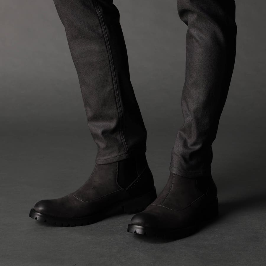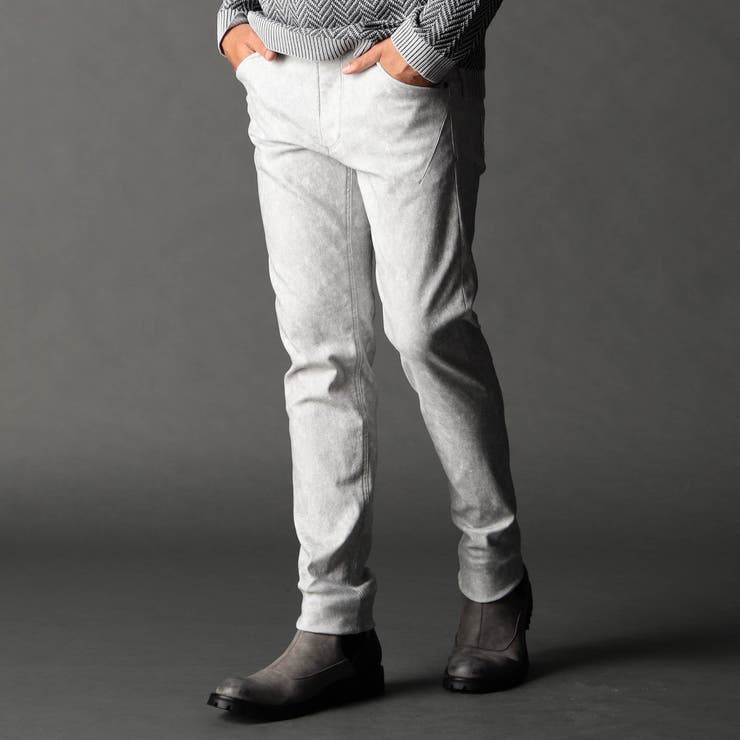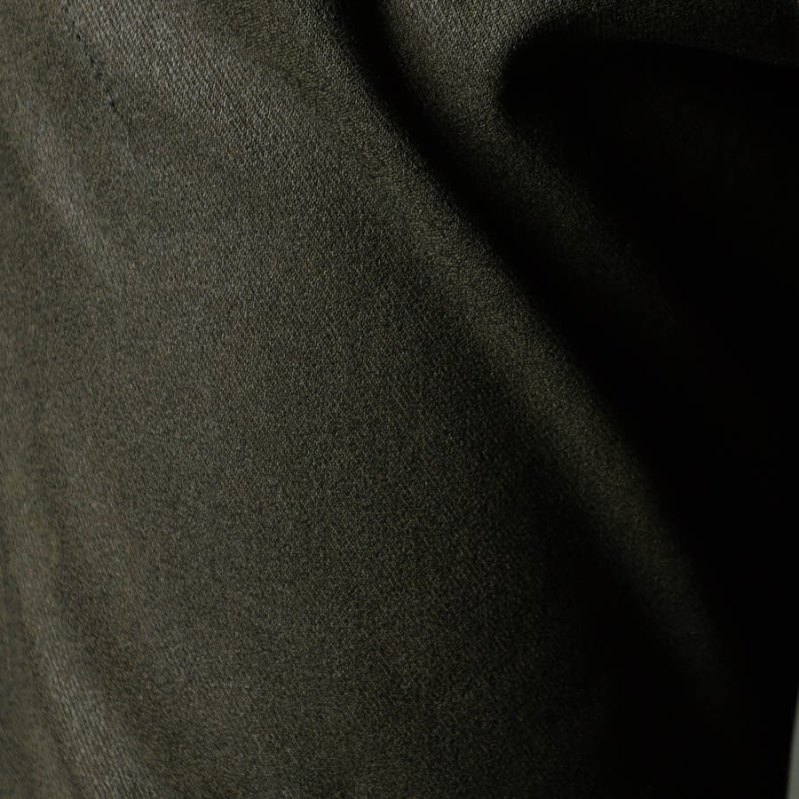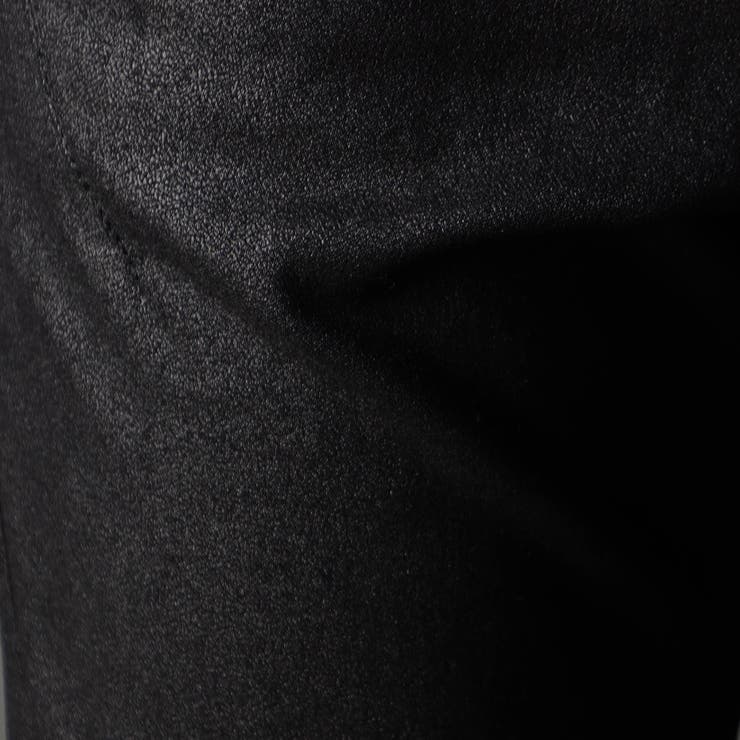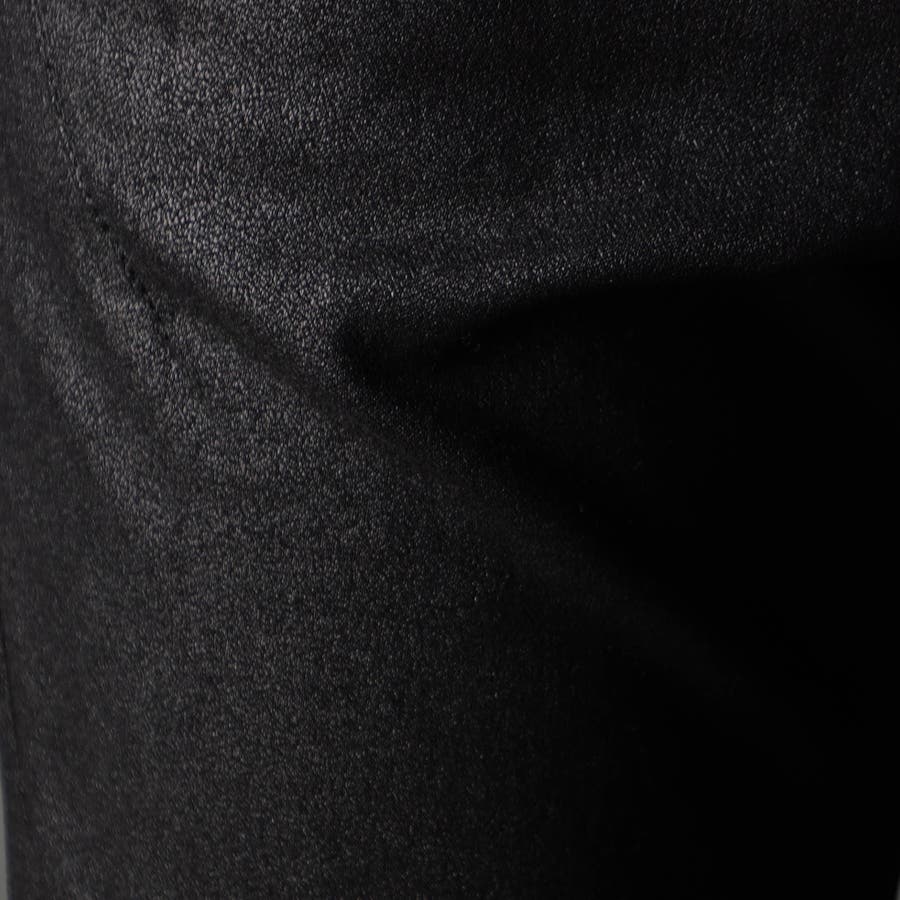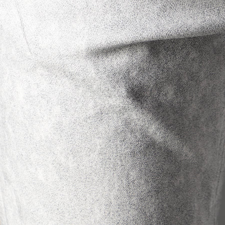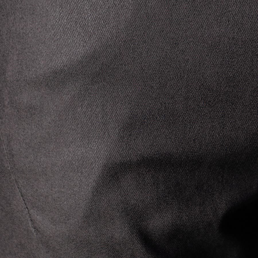 吸湿性の高い再生繊維のレーヨン糸とプリッとしたコシを出すナイロン糸を使用したハイパワーストレッチ素材をベースに、革の表面の様な小シボ調のムラ柄プリントを施してレザーライクな質感を表現しています。更に裏側を微起毛して風合い、肌触りを良くし、保温性を高めています。ポリウレタン混の良く伸びてキックバックが利いたストレッチ感が抜群です。