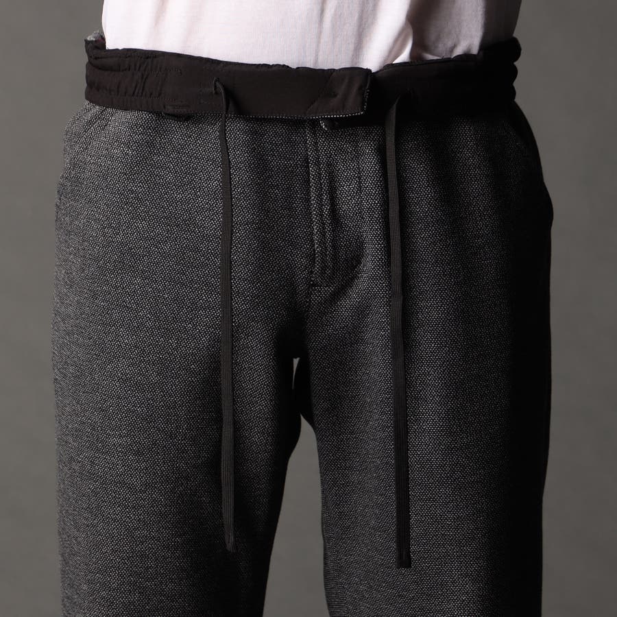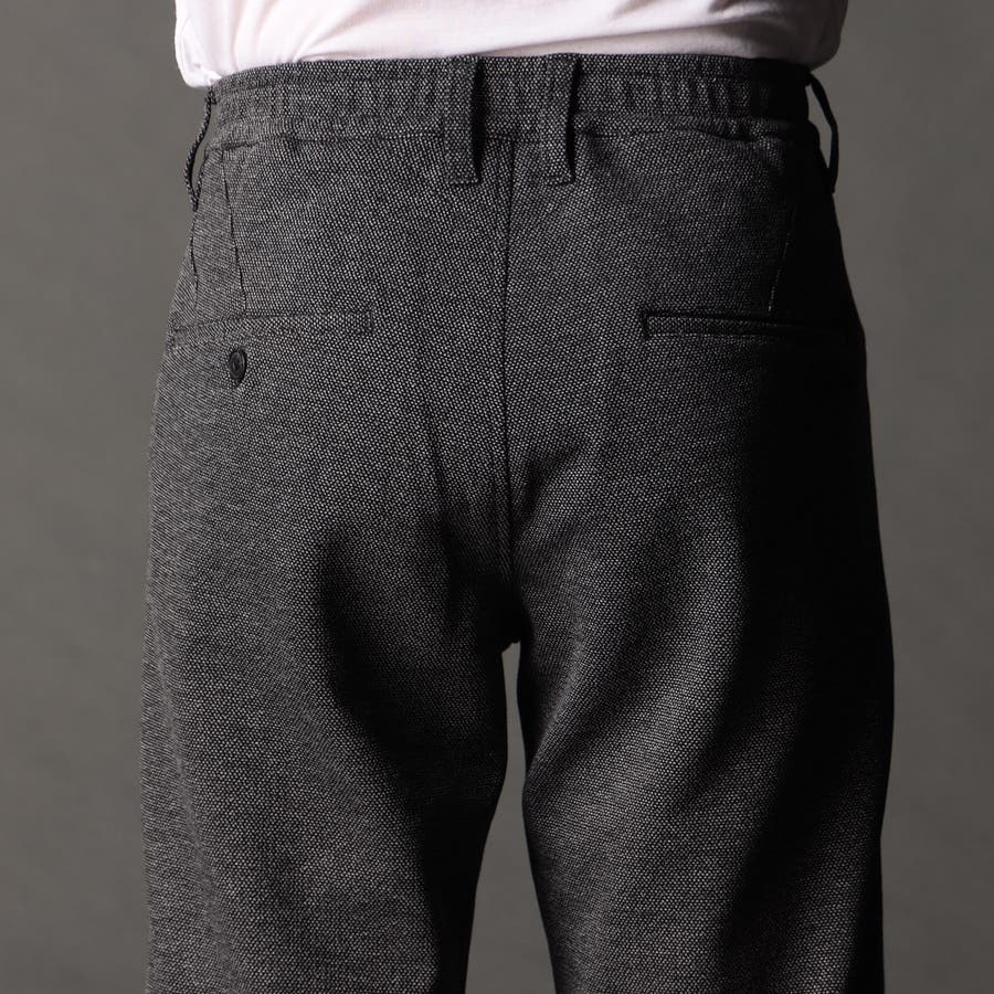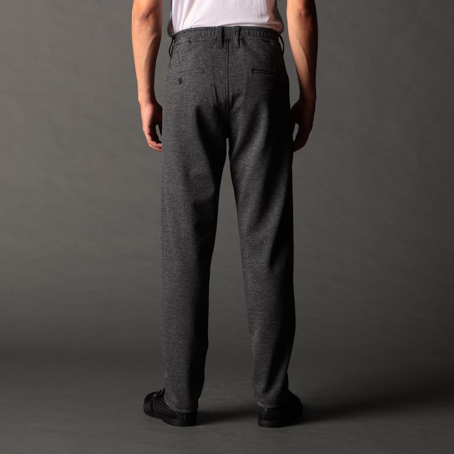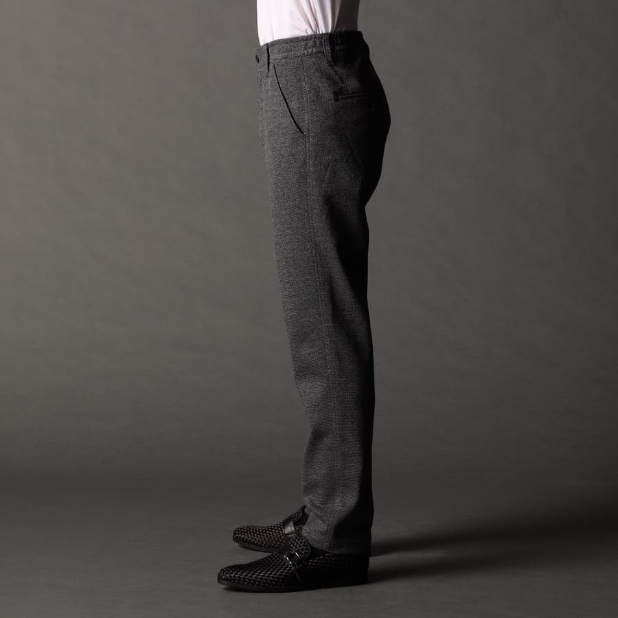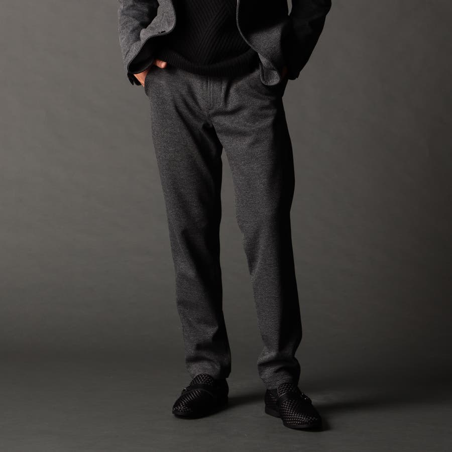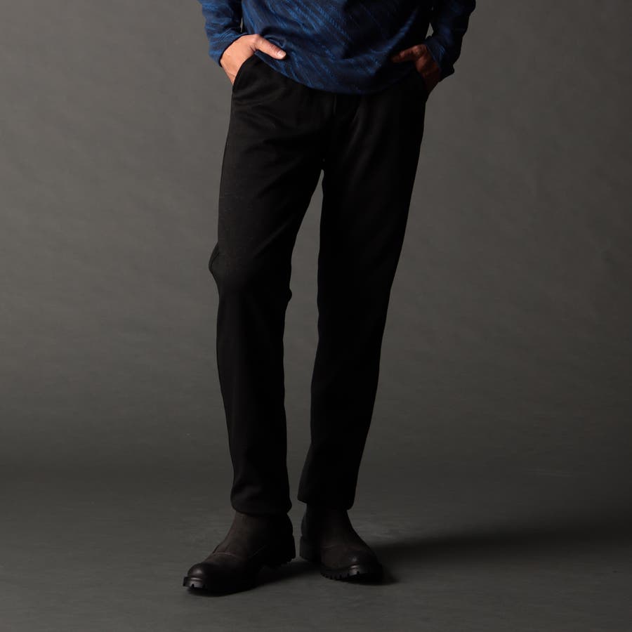 ジャカード織のカットソージャージ素材。キックバックの効いた伸縮性と保形性がありウールパンツの様な高級感ある見え方です。地厚でしっかりした素材は、シワになりにくく、しっかりした張り感もあるのでシルエットを綺麗に見せます。素材の特性上、少し重たく感じますが、着用すると気になりません。