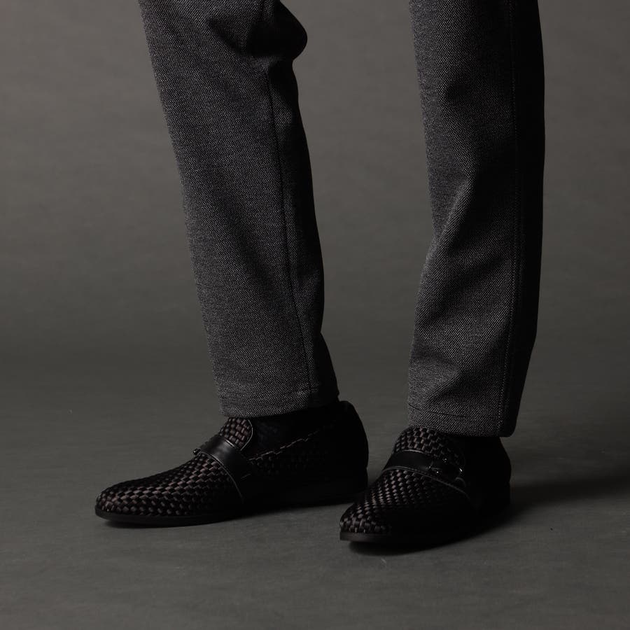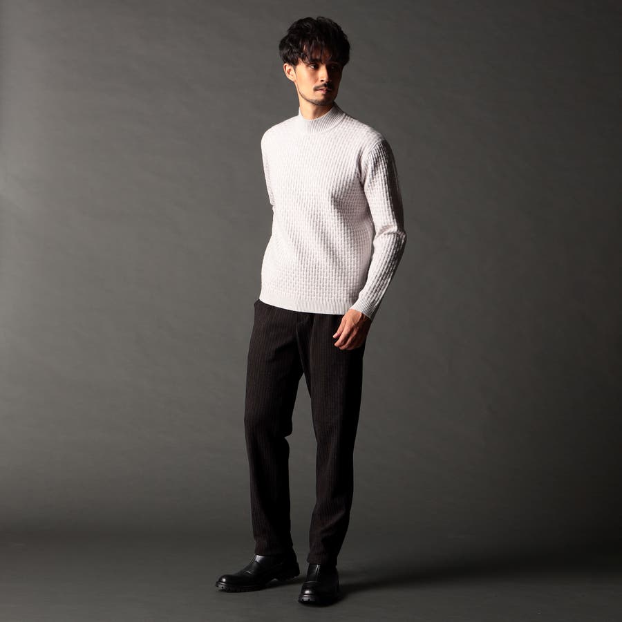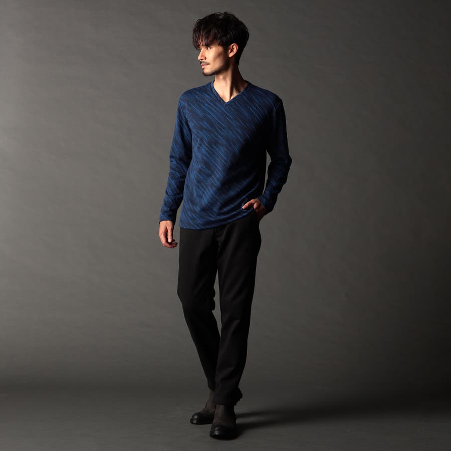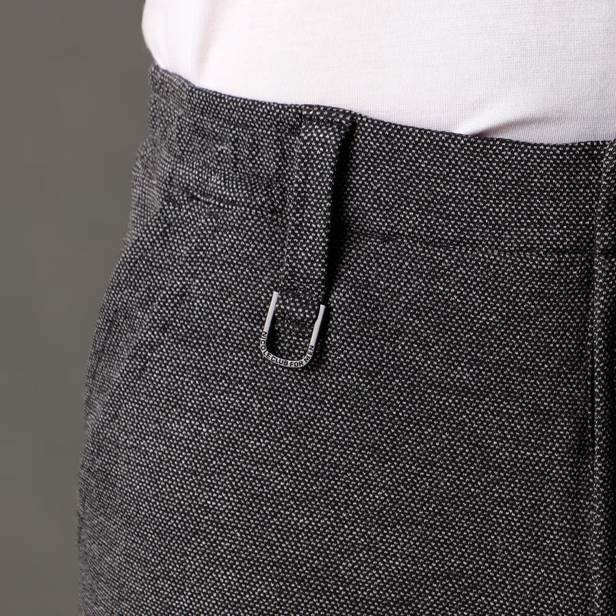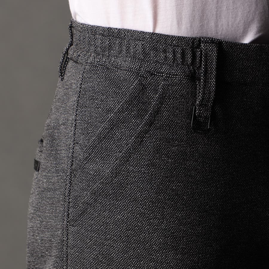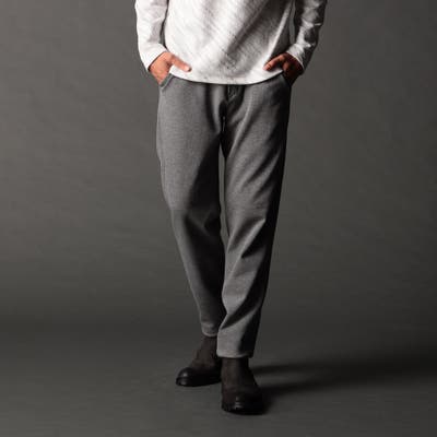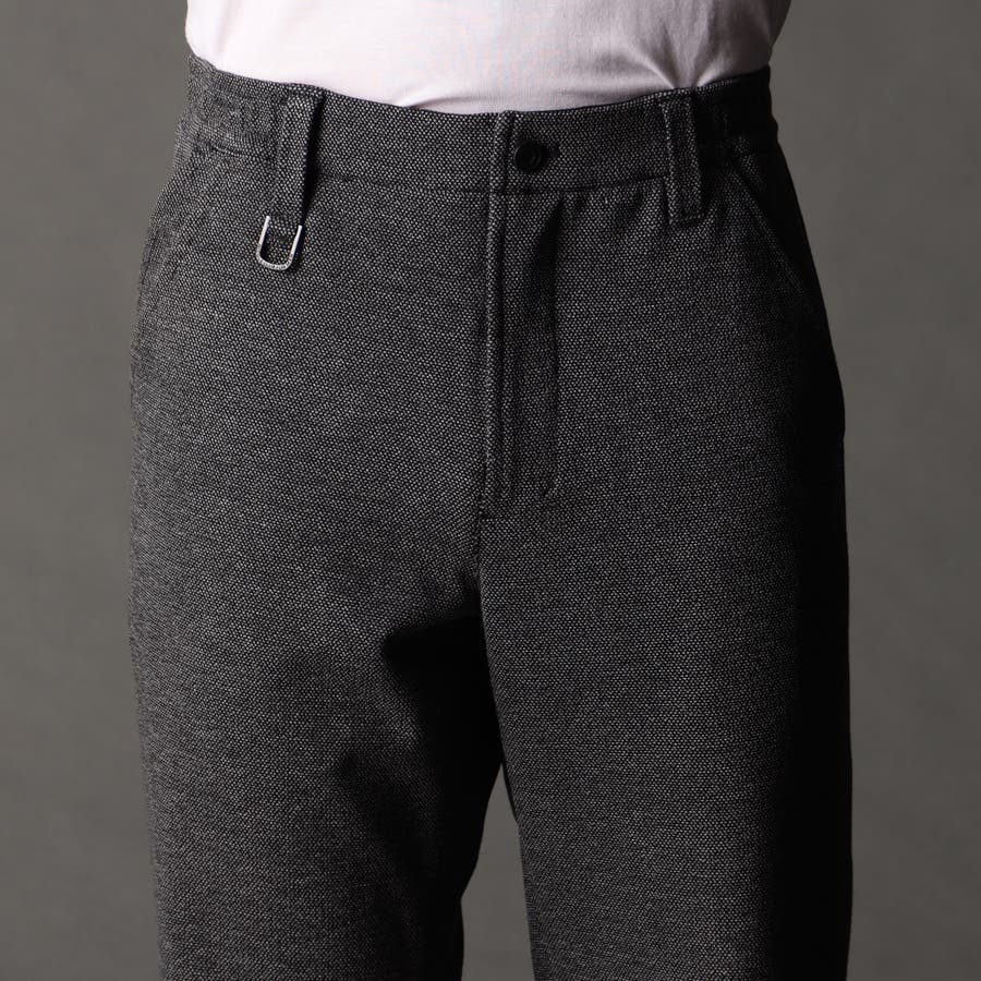 ジャカード織のカットソージャージ素材。キックバックの効いた伸縮性と保形性がありウールパンツの様な高級感ある見え方です。地厚でしっかりした素材は、シワになりにくく、しっかりした張り感もあるのでシルエットを綺麗に見せます。素材の特性上、少し重たく感じますが、着用すると気になりません。