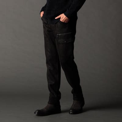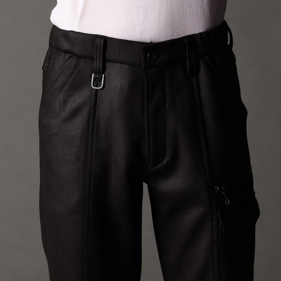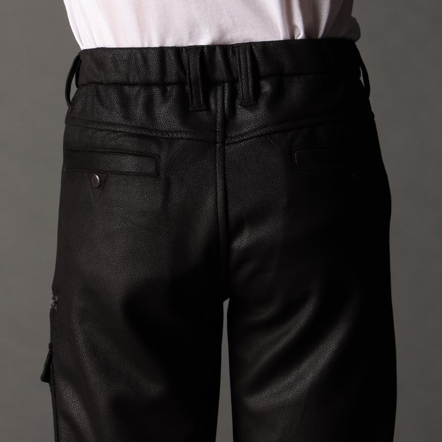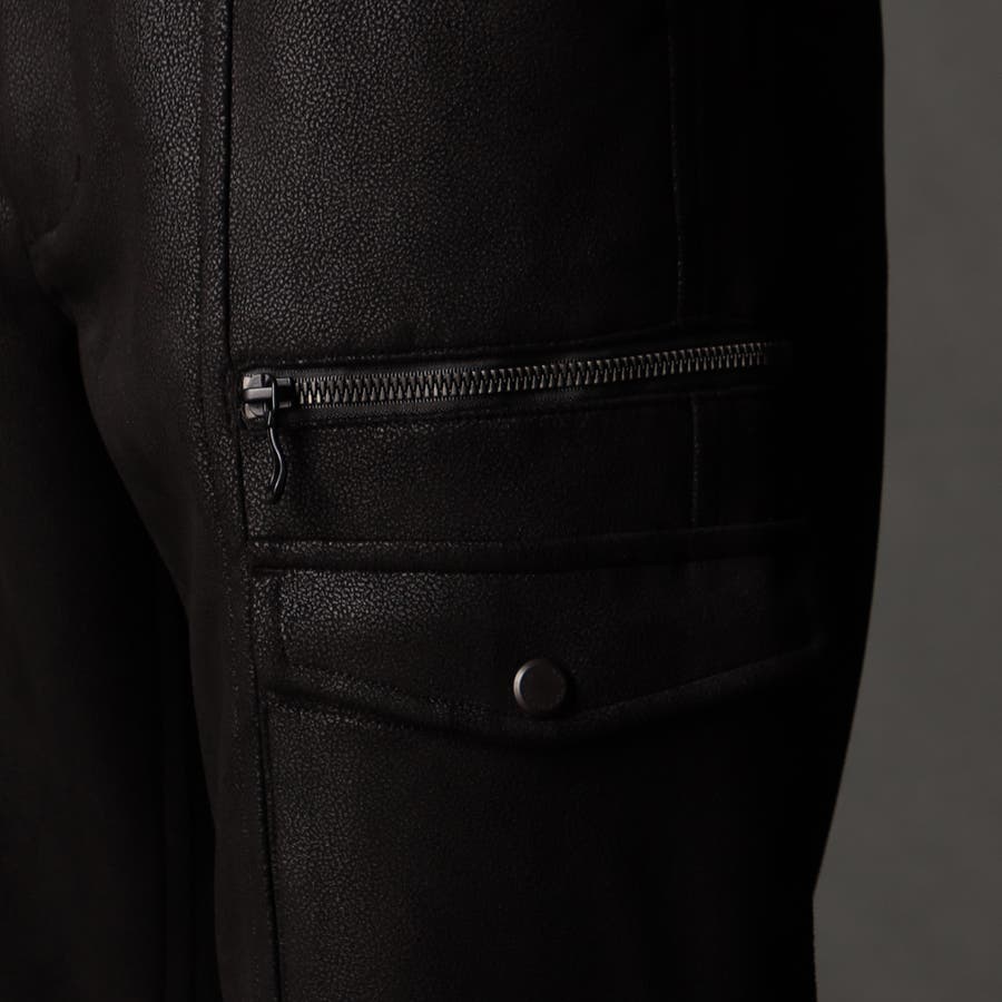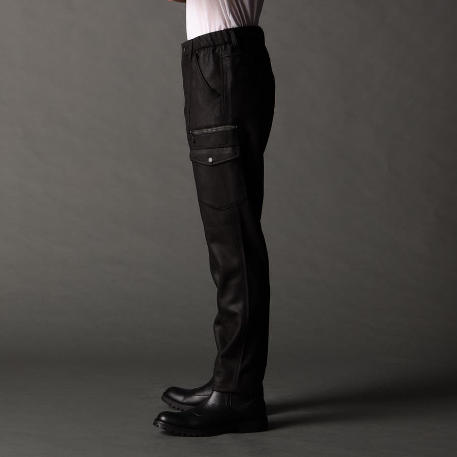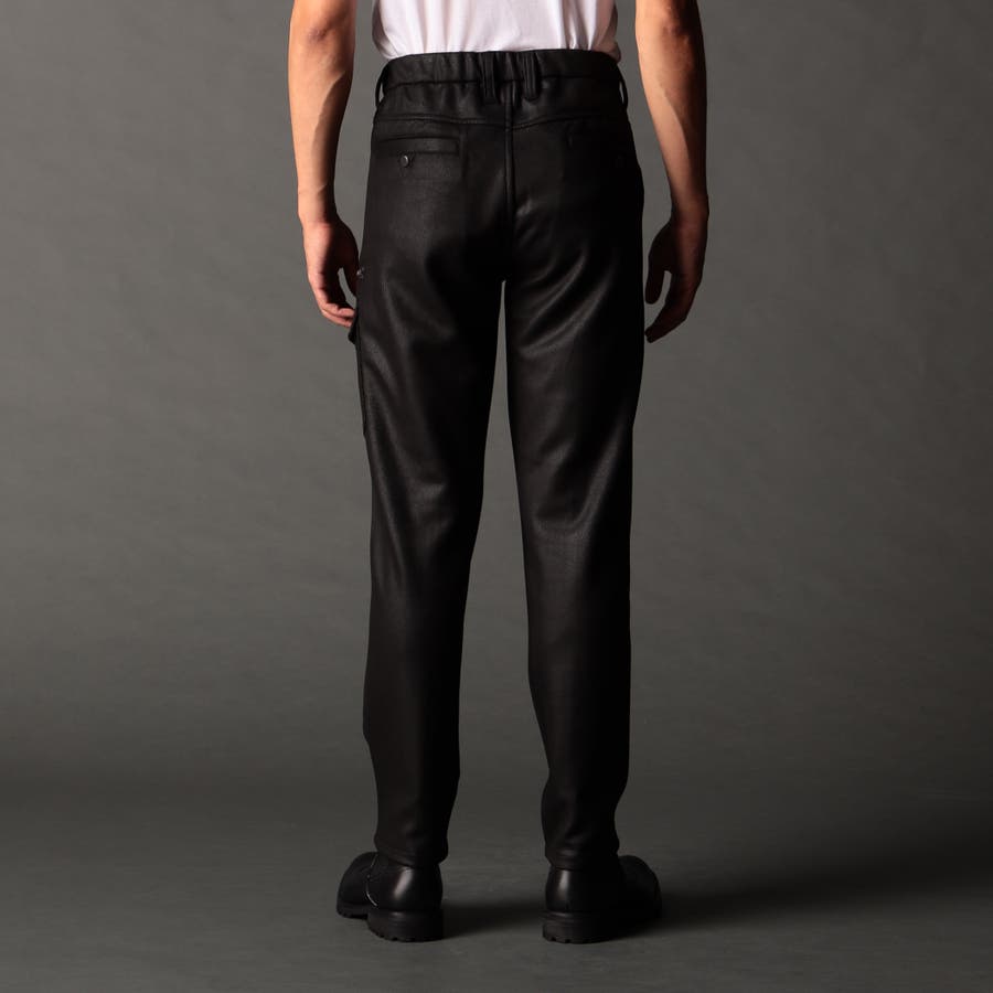 91その他2は、革の小シボを表現した柄の箔プリントを施して革パンの様なレザーライクな見え方に作っています。マルチなストレッチ性、ジャージ素材なのではのプリッとした横張り感もあり、シルエットを綺麗に作ります。